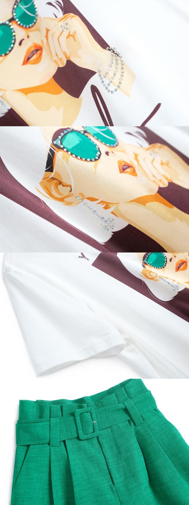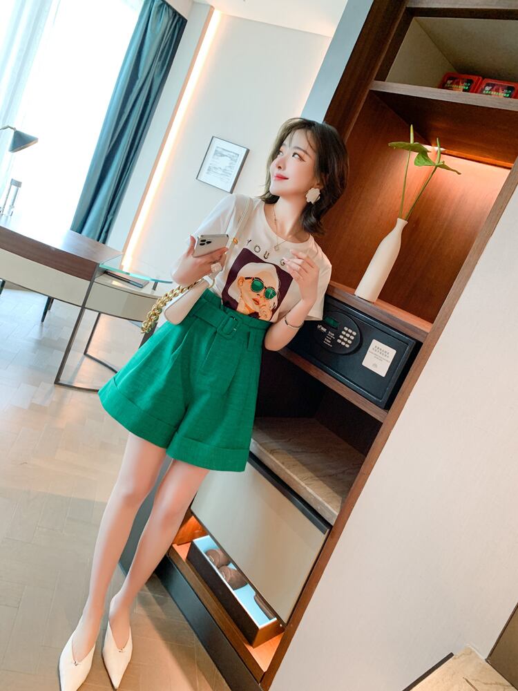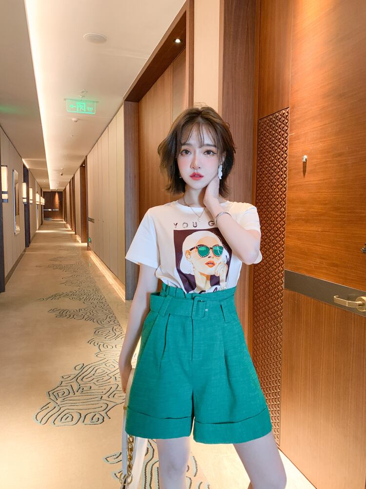 プリントラウンドネックTシャツ ハイウェストAラインショーツ サマースタイル 夏物 ブルマー Oネック MIUCO93012387220