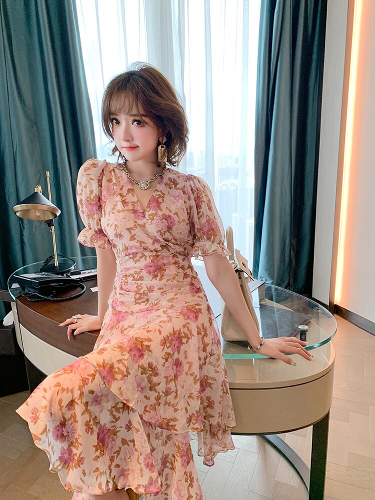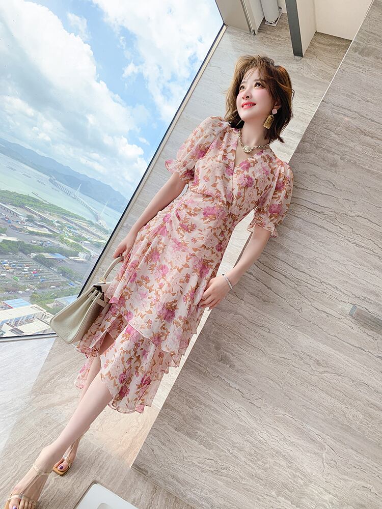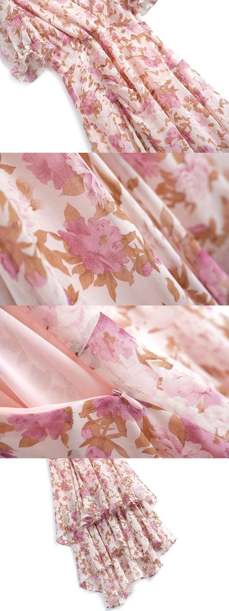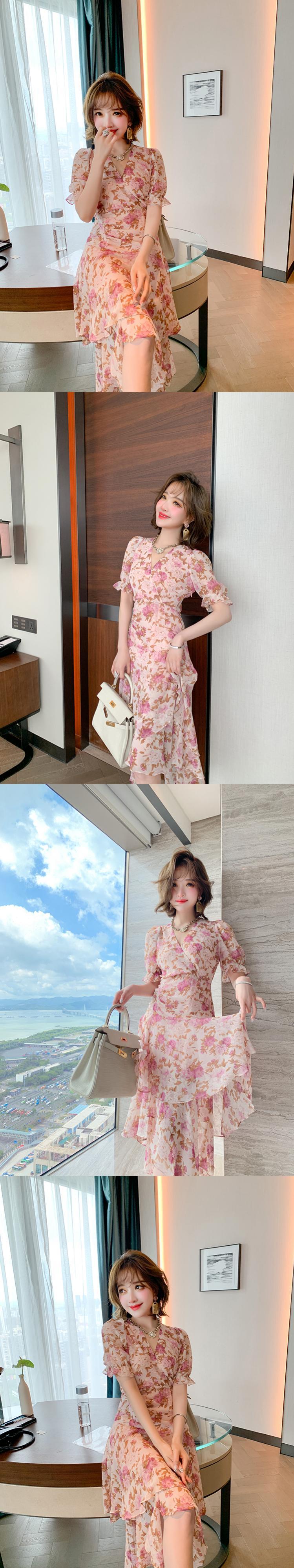 カラーVネックウェストスリーブプリント柄ドレス サマースタイル 夏物 ステッチ MIUCO78589451518