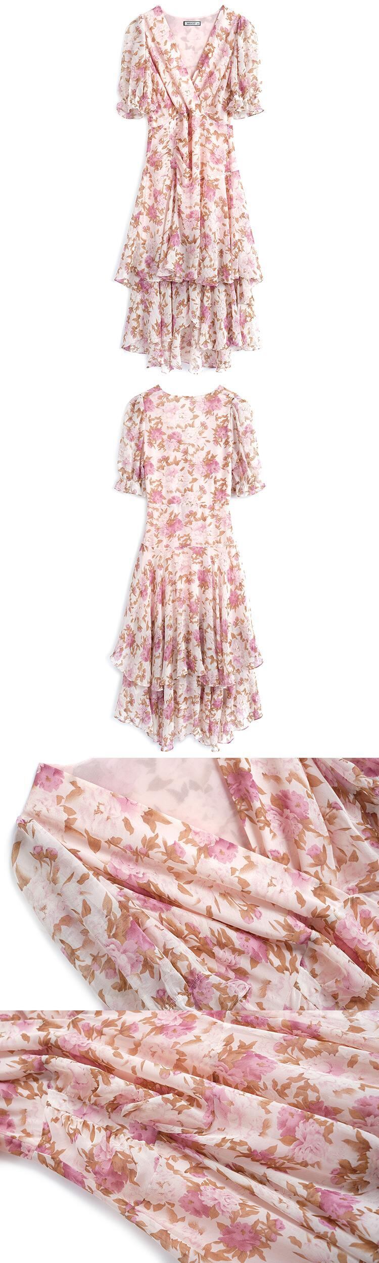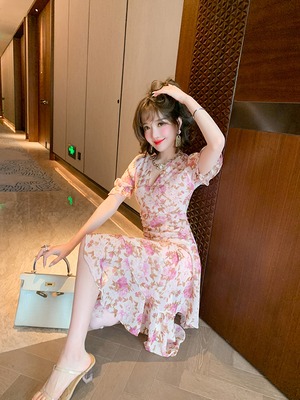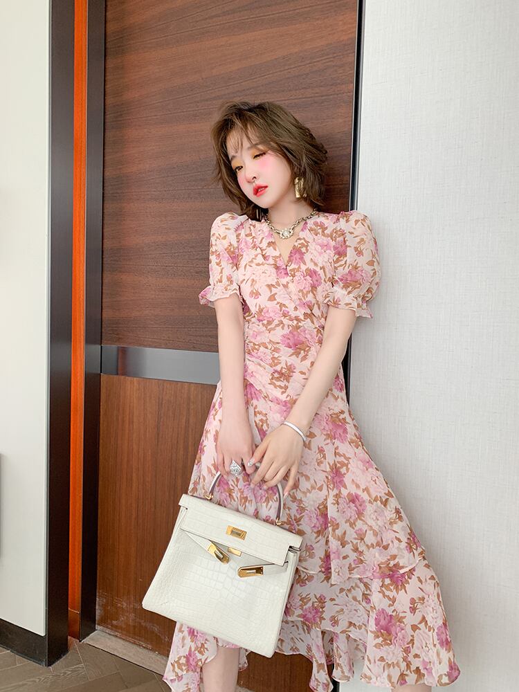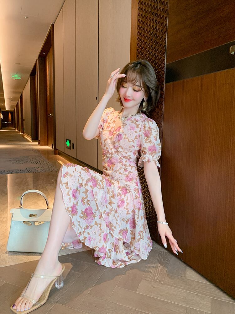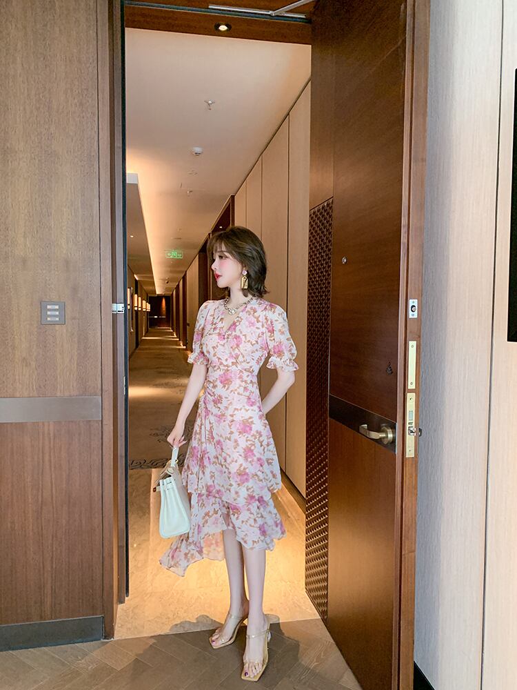カラーVネックウェストスリーブプリント柄ドレス サマースタイル 夏物 ステッチ MIUCO78589451518