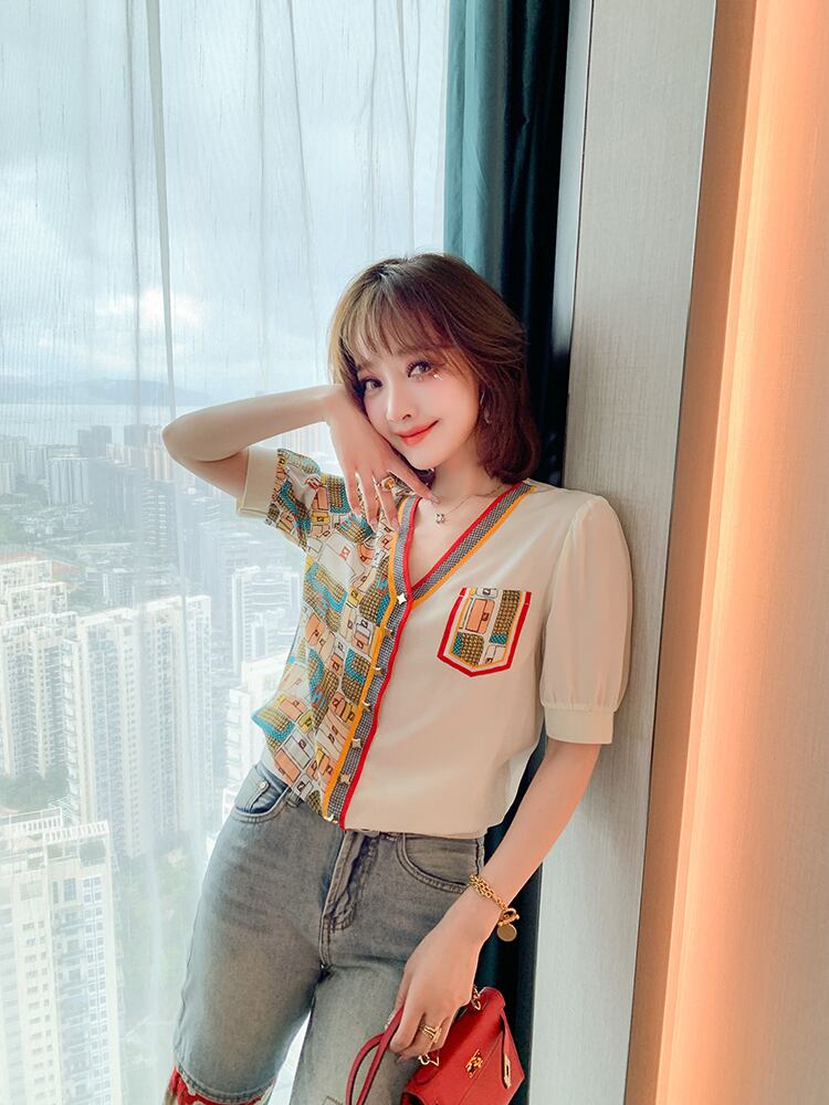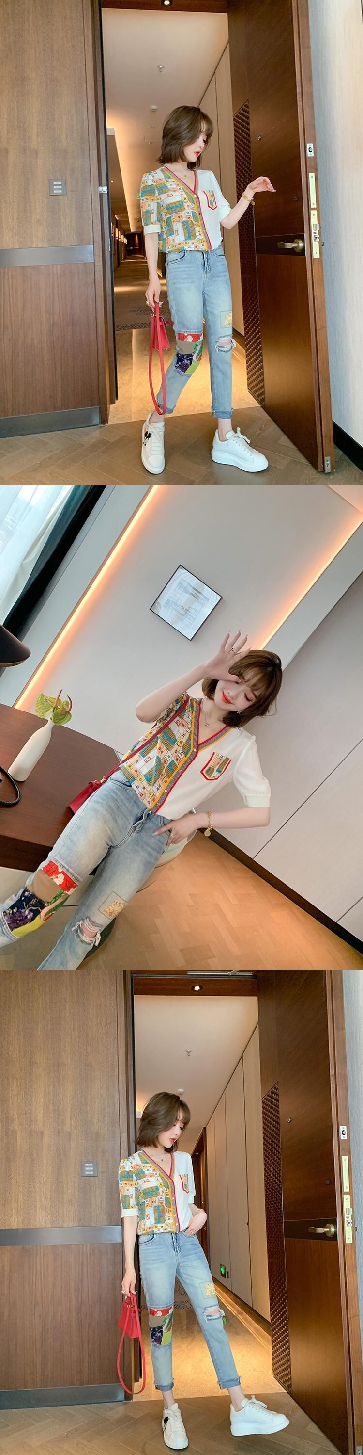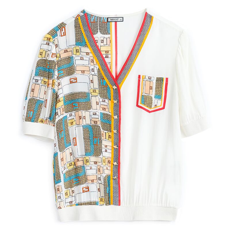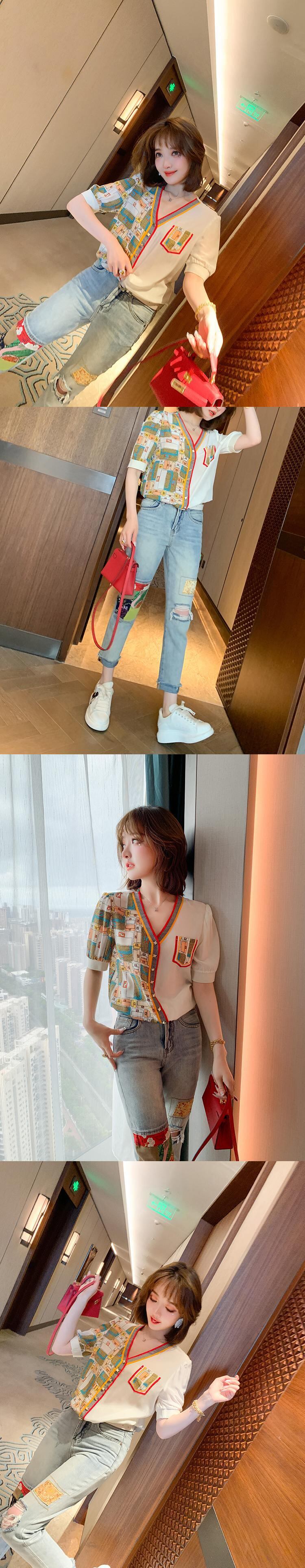 プリントボタンVネックルーズスタイルシャツ サマー 夏物 ステッチ MIUCO11029610132