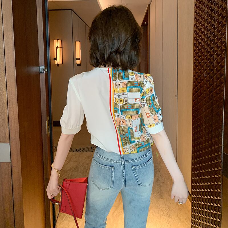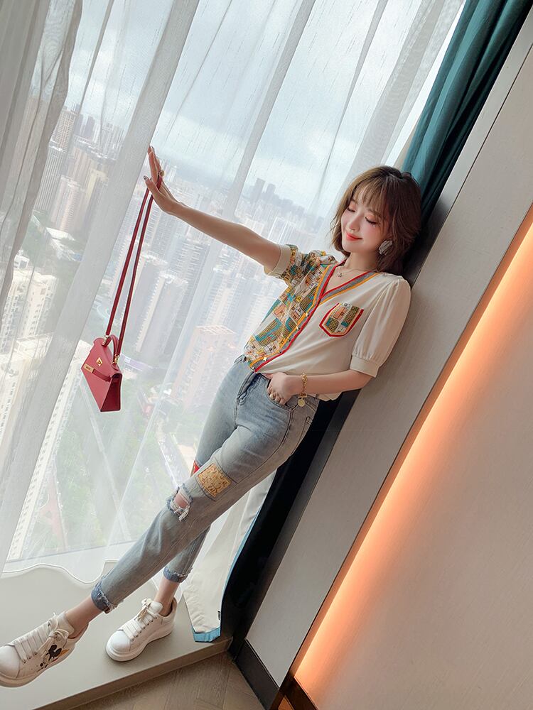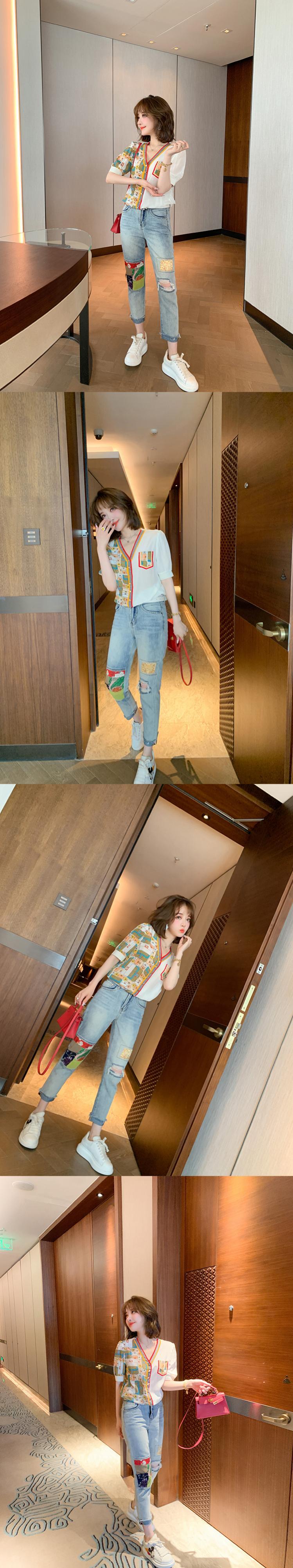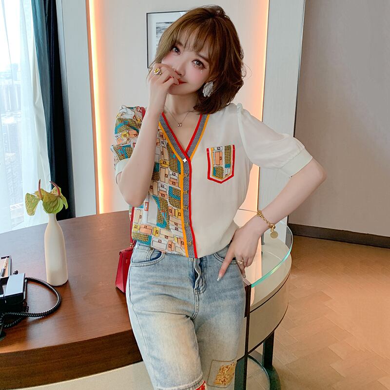 プリントボタンVネックルーズスタイルシャツ サマー 夏物 ステッチ MIUCO11029610132