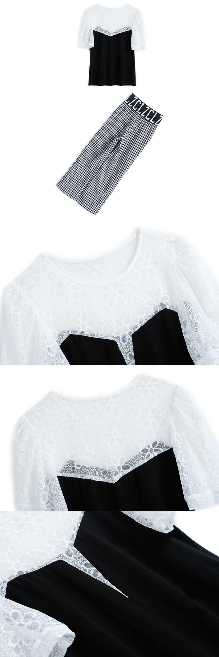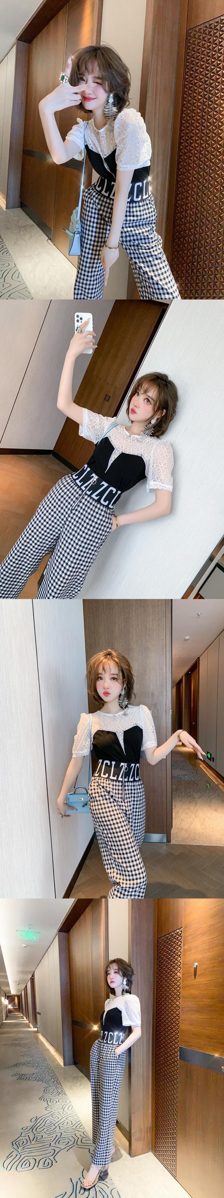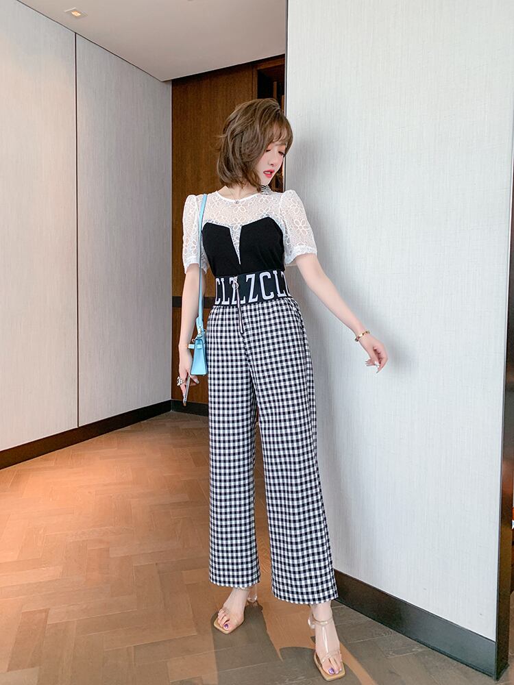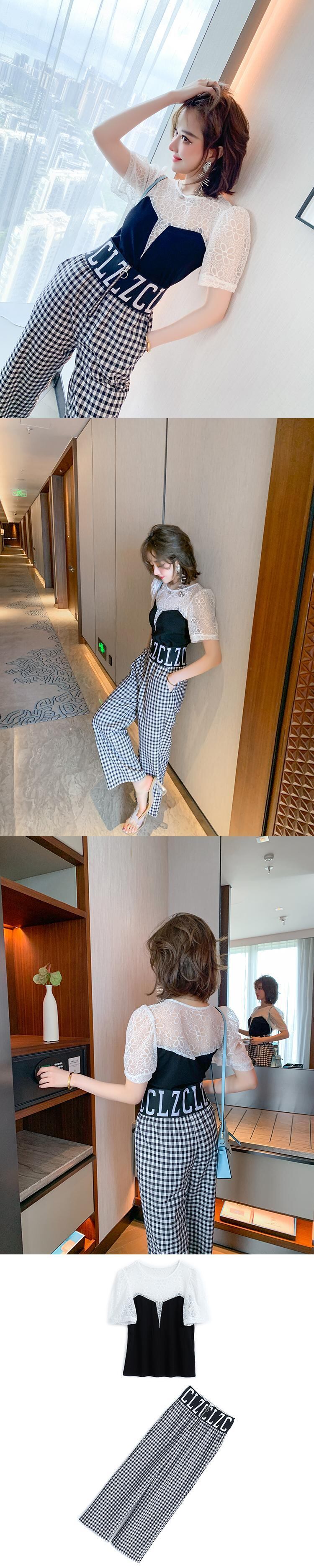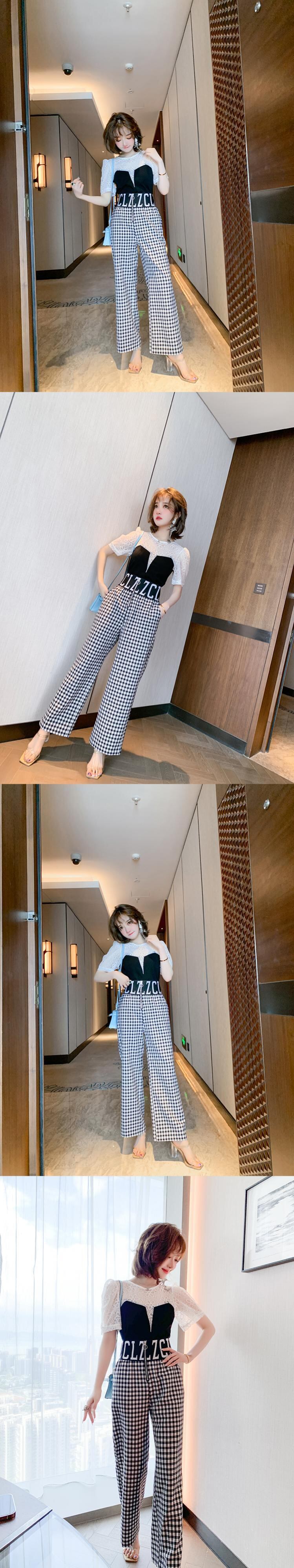 レースFlowerデザイン トップス ウェスト格子柄薄手パンツ セット サマー 夏物 フラワーデザイン ステッチ MIUCO58581706841