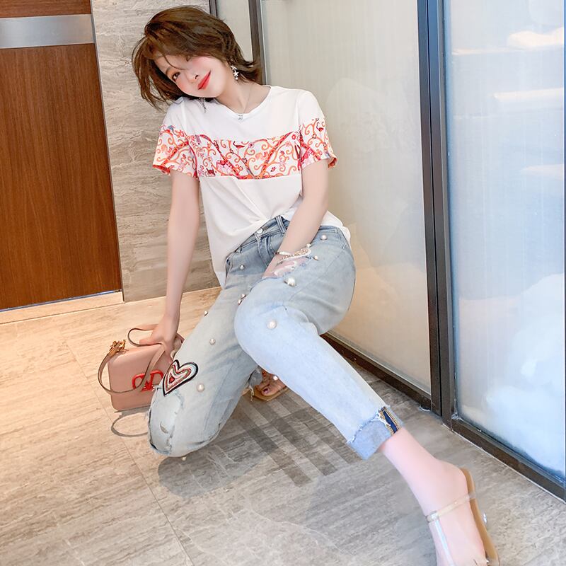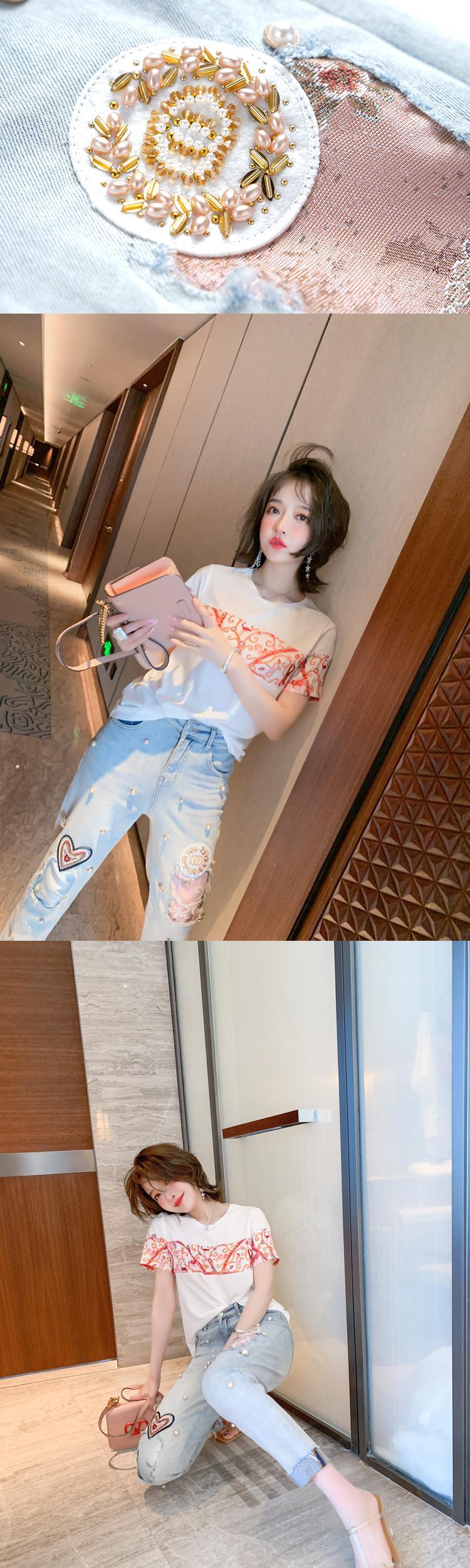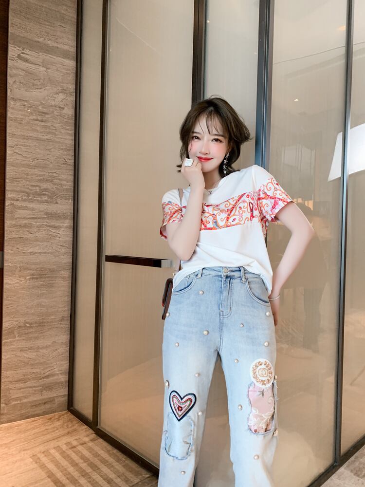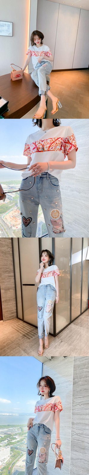 プリントラウンドネックTシャツ 刺繍ジーンズ サマースタイル 夏物 Oネック ステッチ MIUCO66718183370