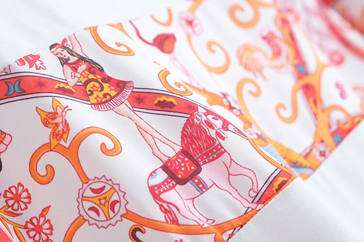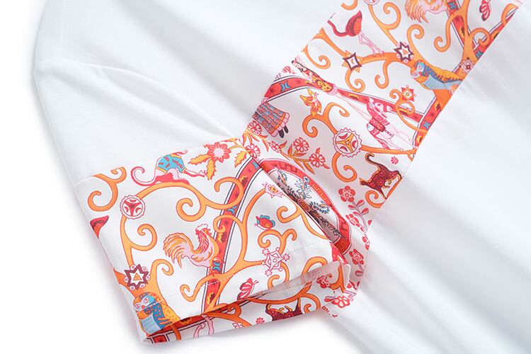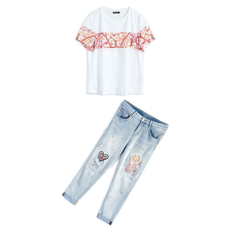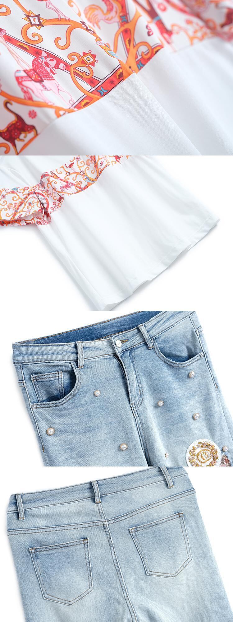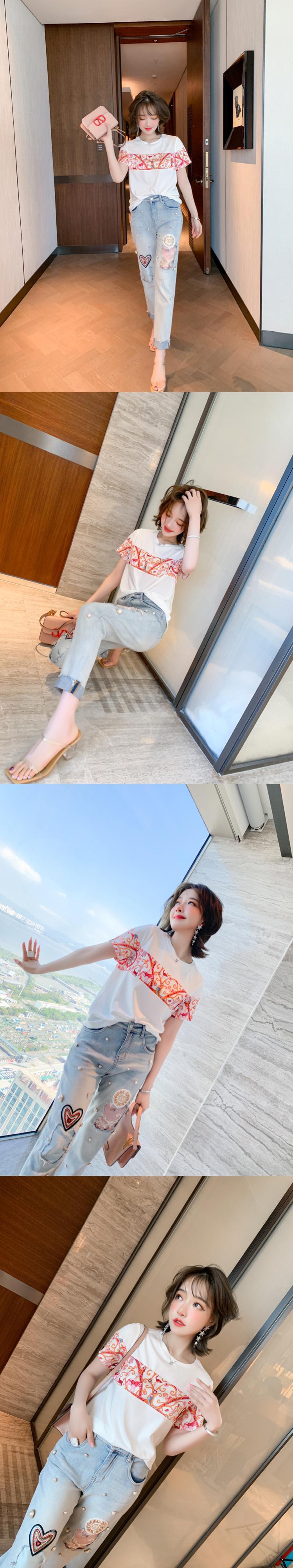 プリントラウンドネックTシャツ 刺繍ジーンズ サマースタイル 夏物 Oネック ステッチ MIUCO66718183370