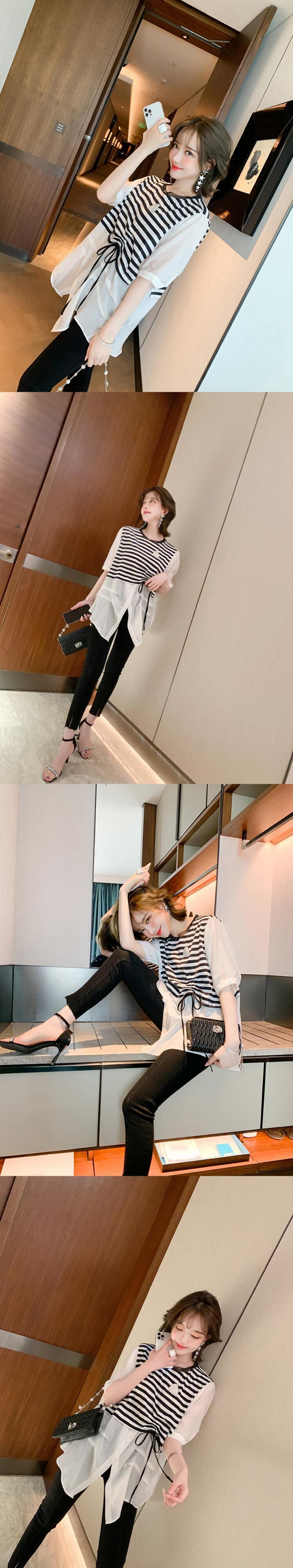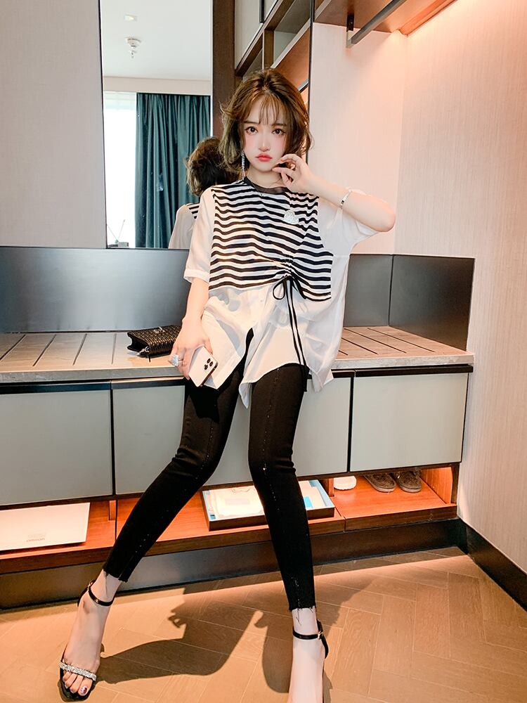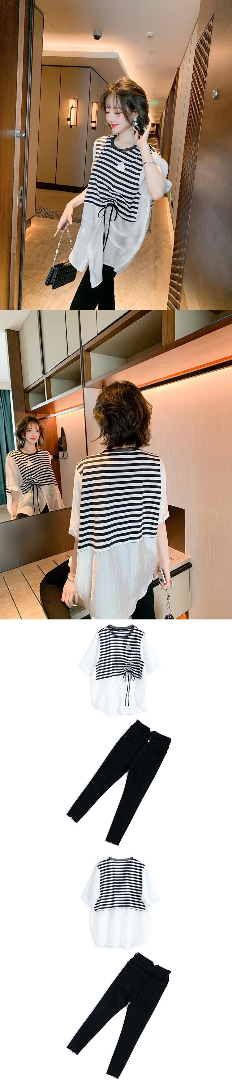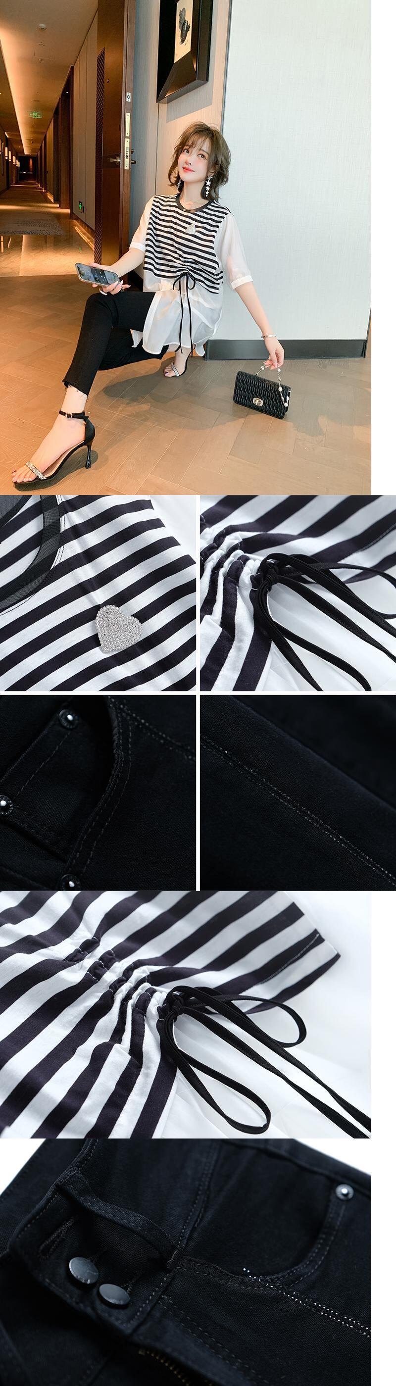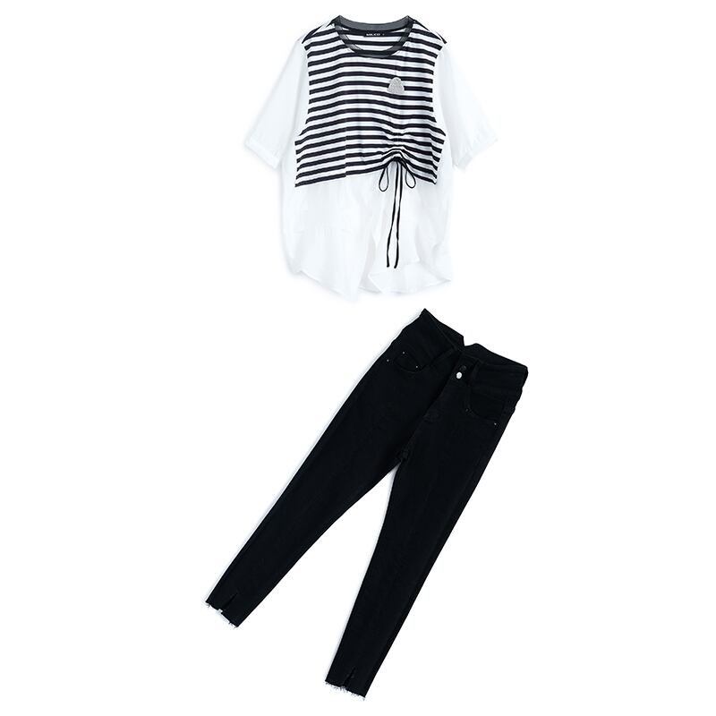 ストライプギャザールーズシャツ スリムジーンズ レディースサマースタイル 夏物 ステッチ MIUCO36896006888