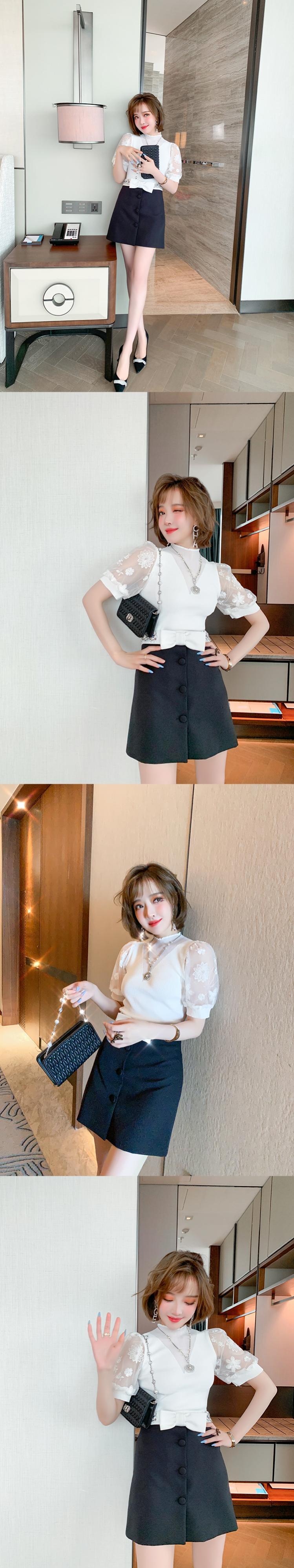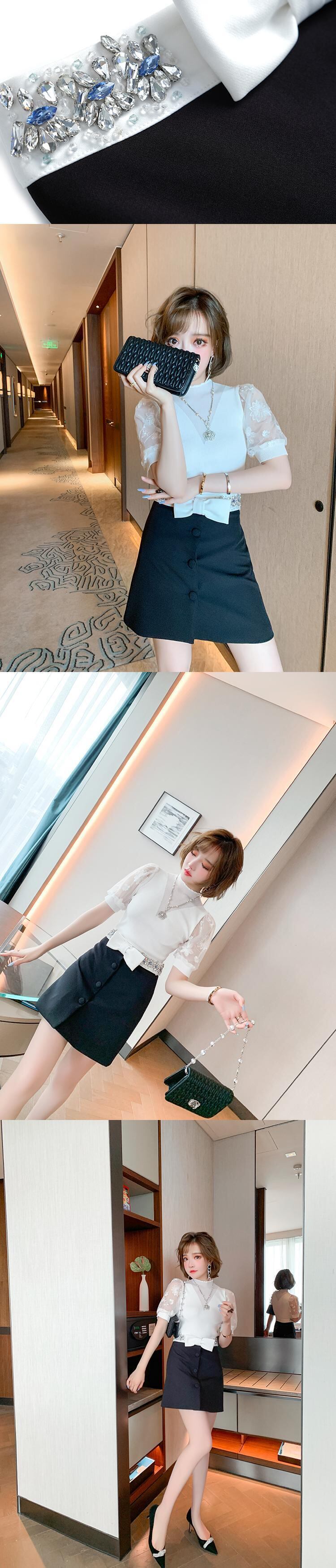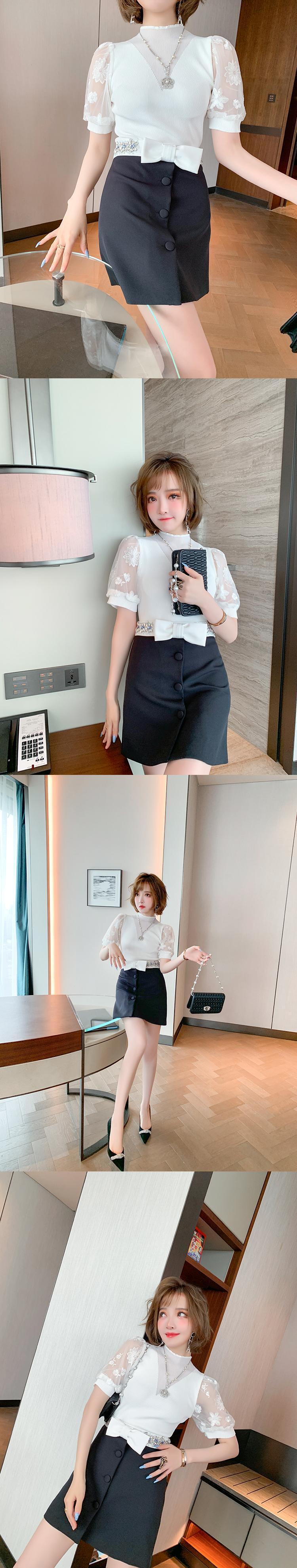 刺繍スリーブニットトップス リボンハイウェストウェストスカート オータム 秋物 MIUCO60844517038