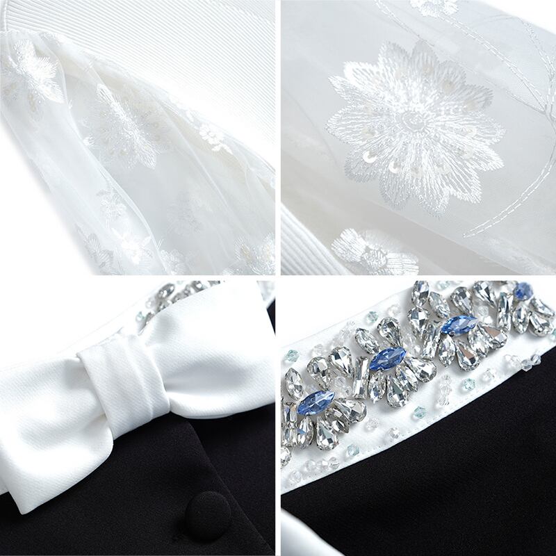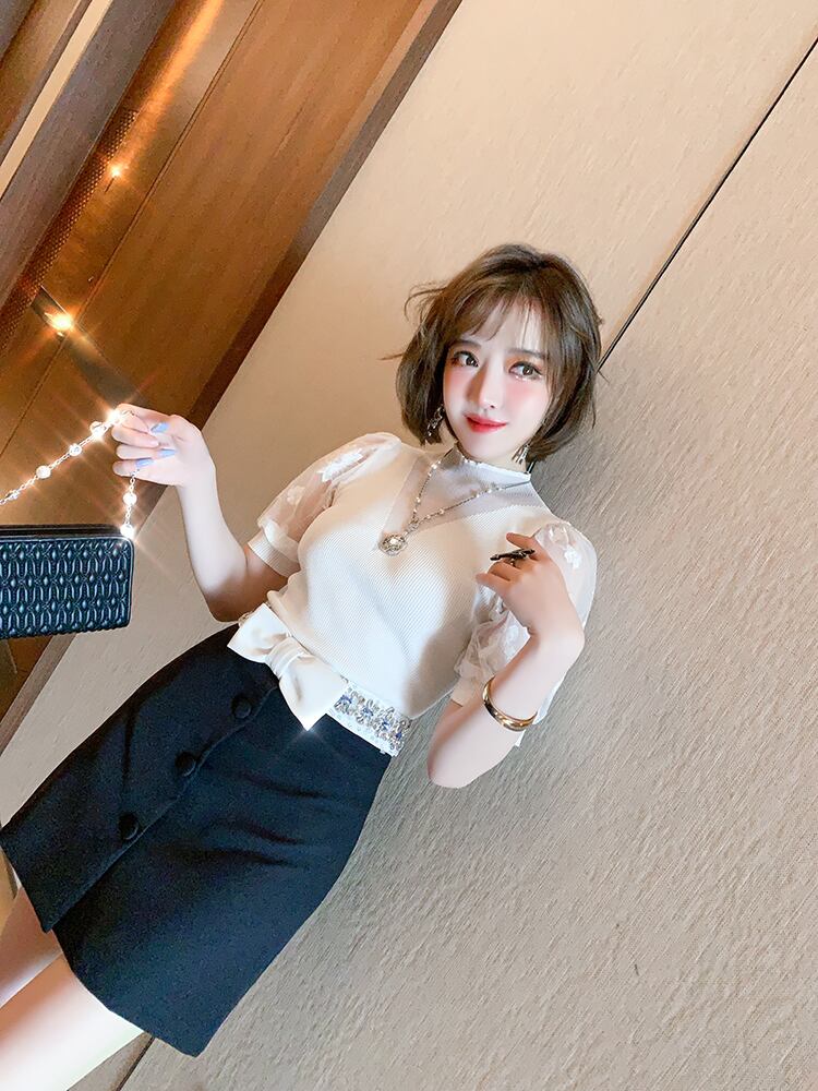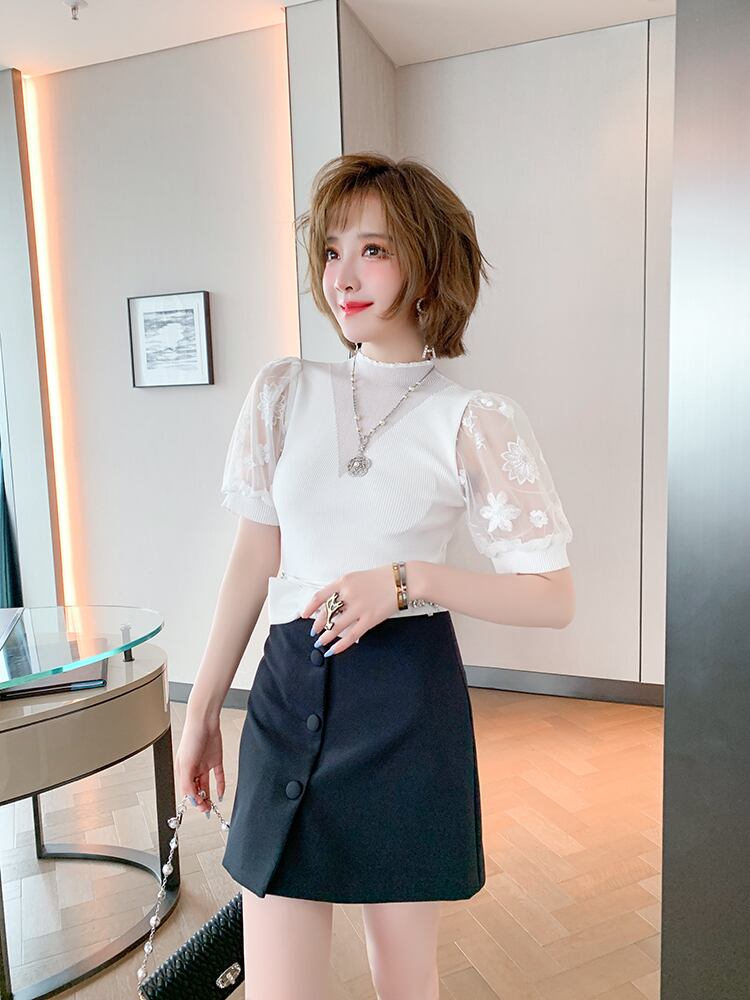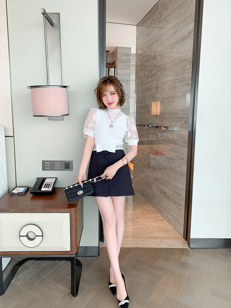 刺繍スリーブニットトップス リボンハイウェストウェストスカート オータム 秋物 MIUCO60844517038