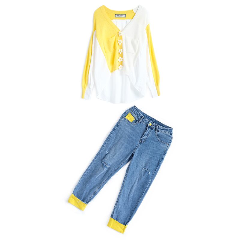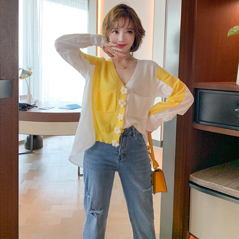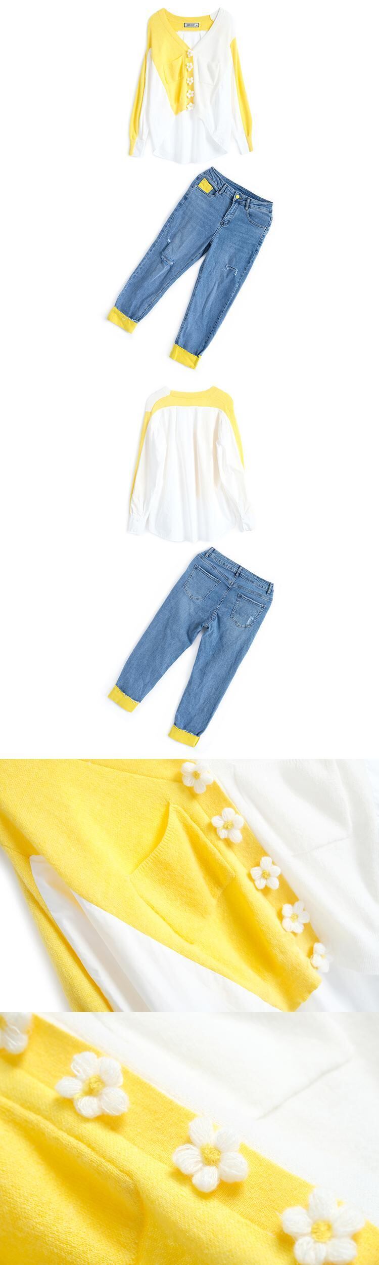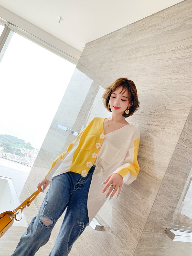 カラーVネックシングルFlowerデザイン ボタンカーディガンジーンズ オータム 秋物 フラワーデザイン ステッチ MIUCO87392451186