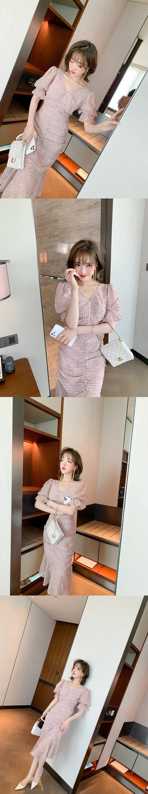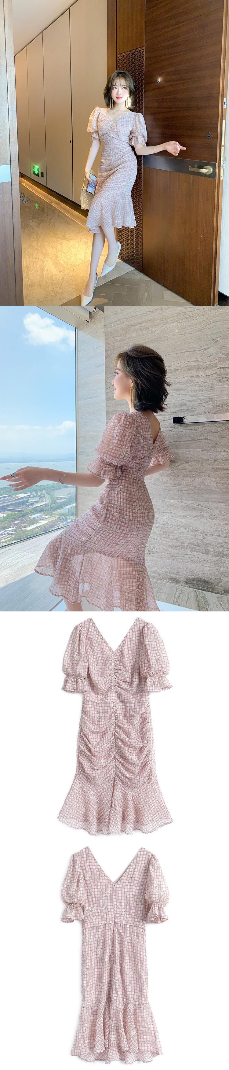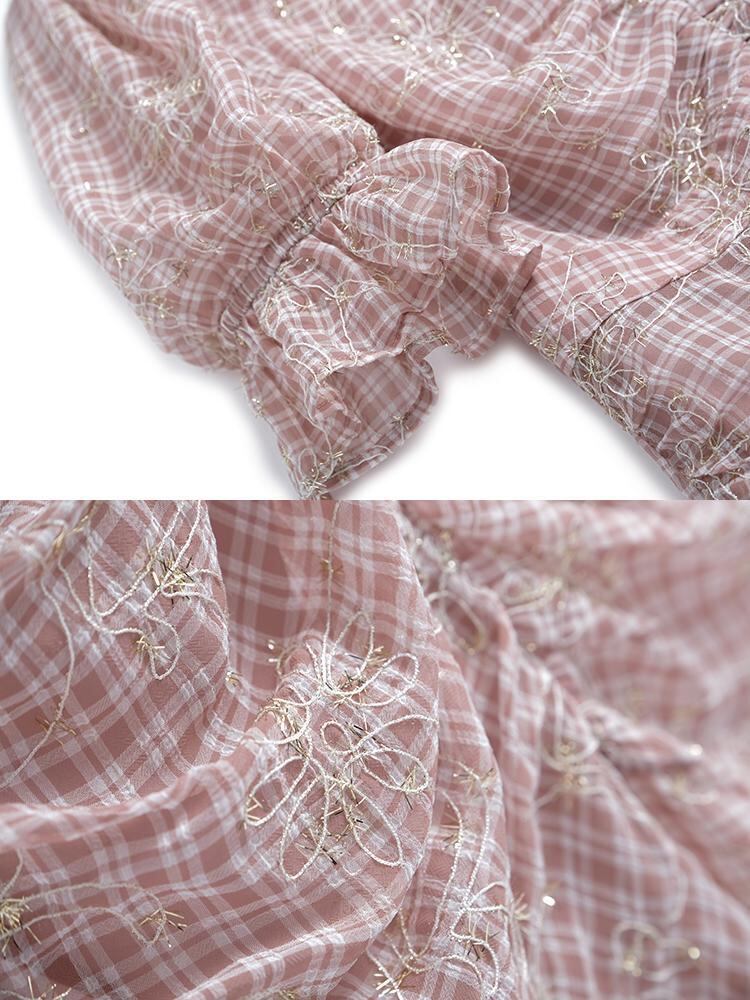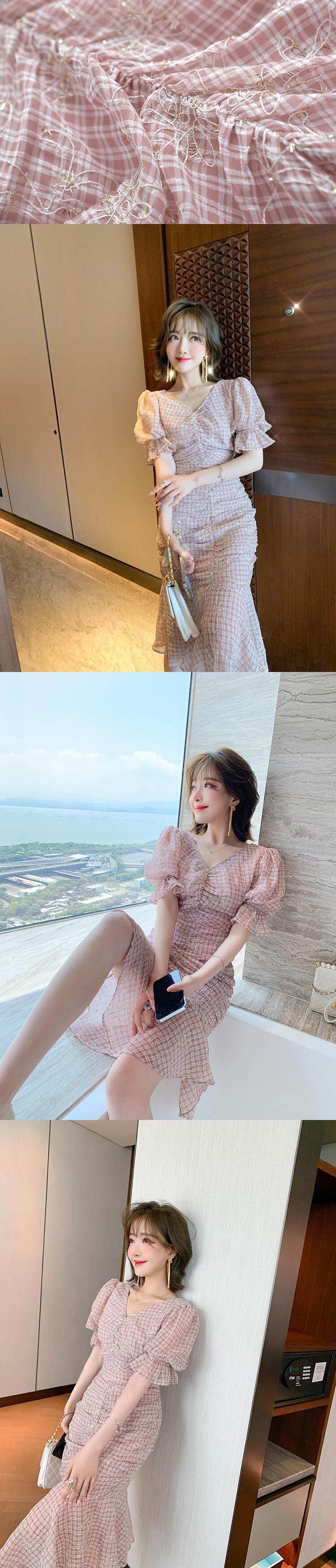 スカート Flowerデザイン Vネックスリーブ格子柄ドレス サマースタイル 夏物 フラワーデザイン MIUCO79621087814