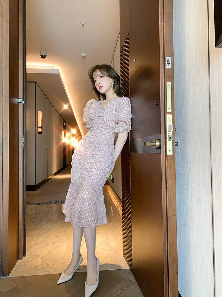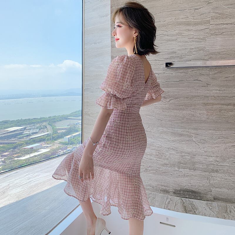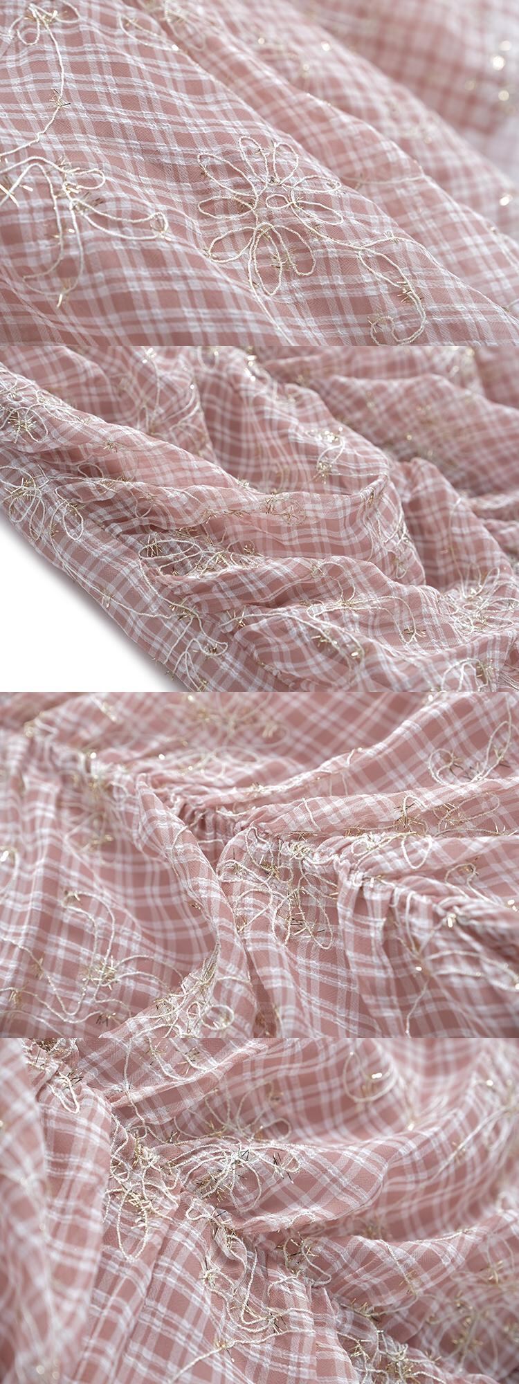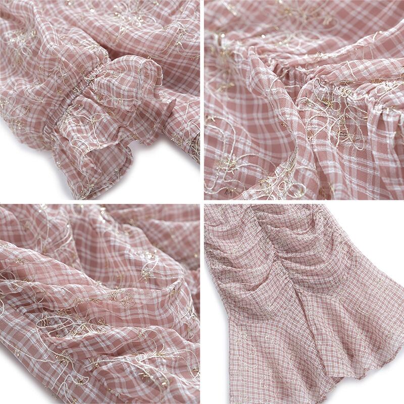 スカート Flowerデザイン Vネックスリーブ格子柄ドレス サマースタイル 夏物 フラワーデザイン MIUCO79621087814
