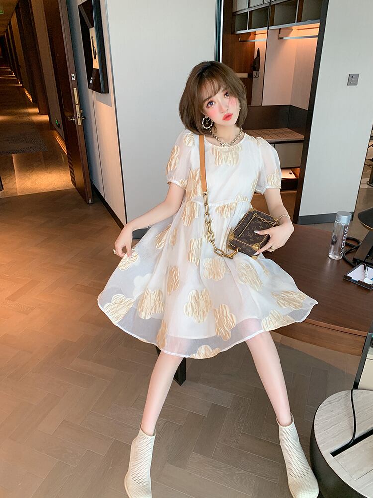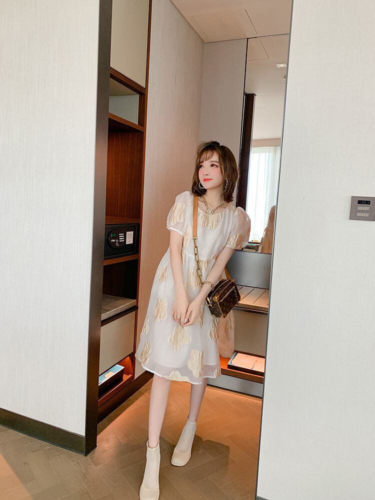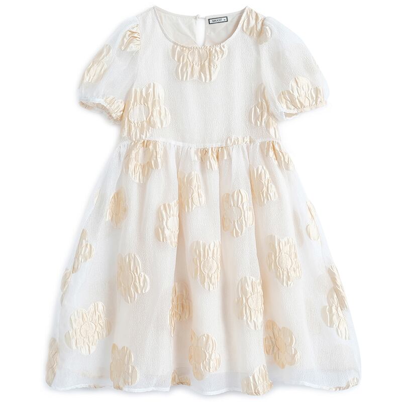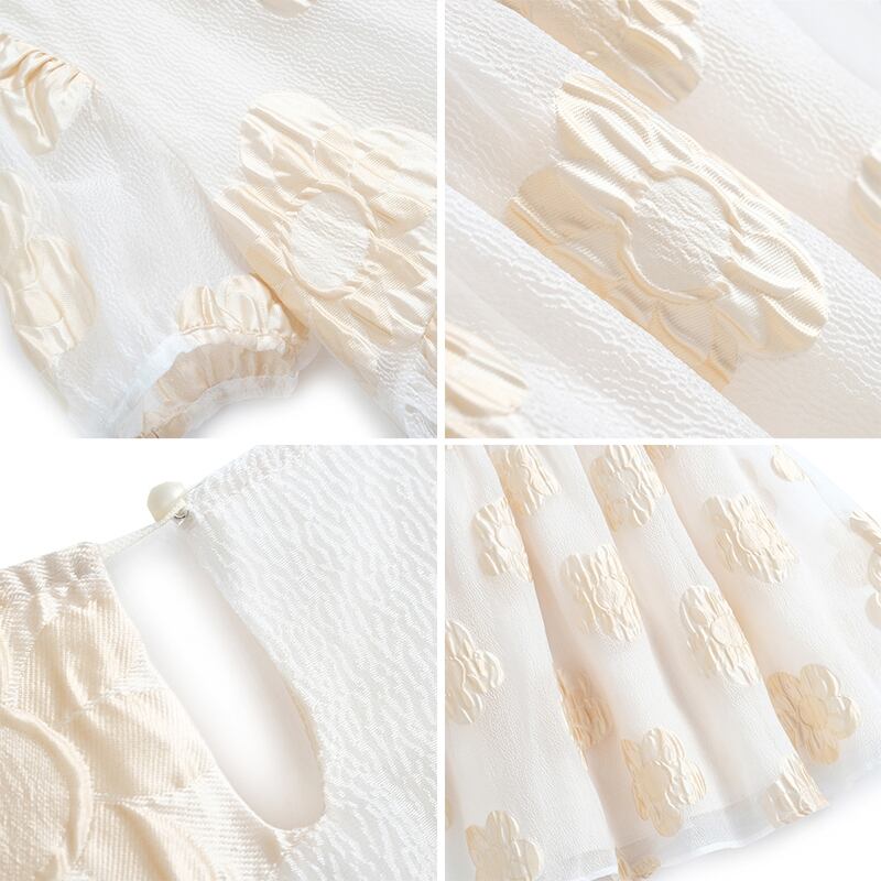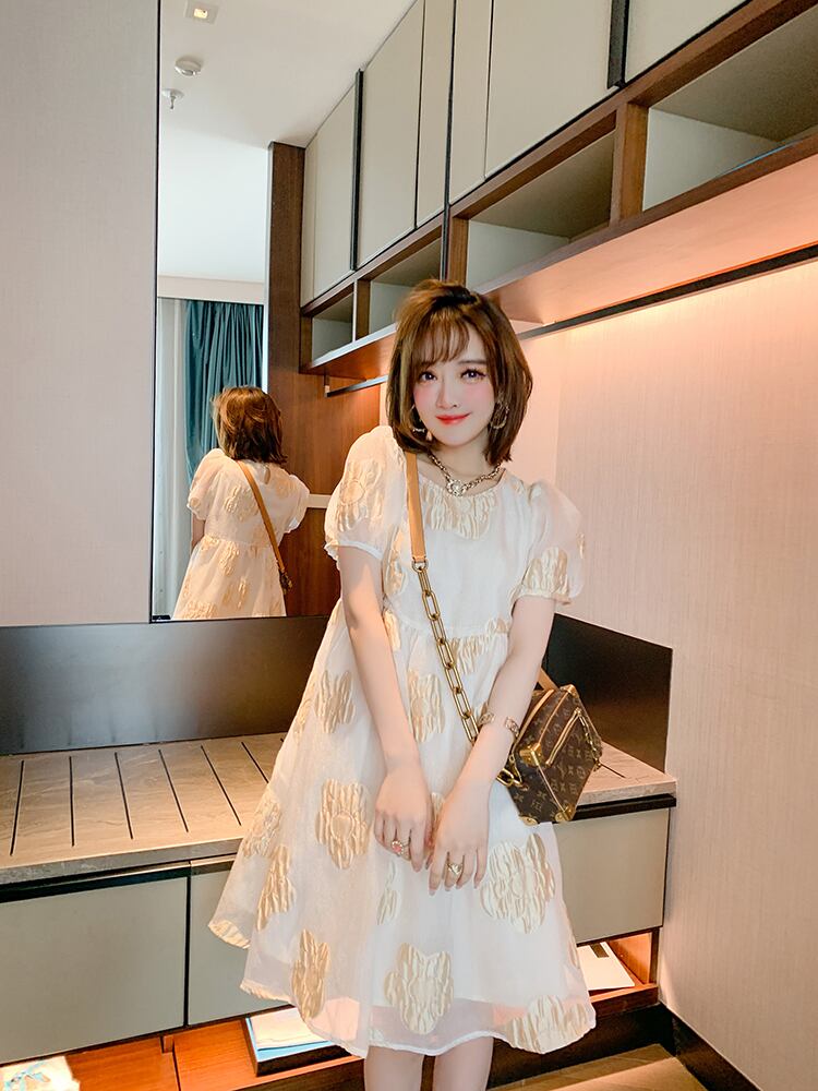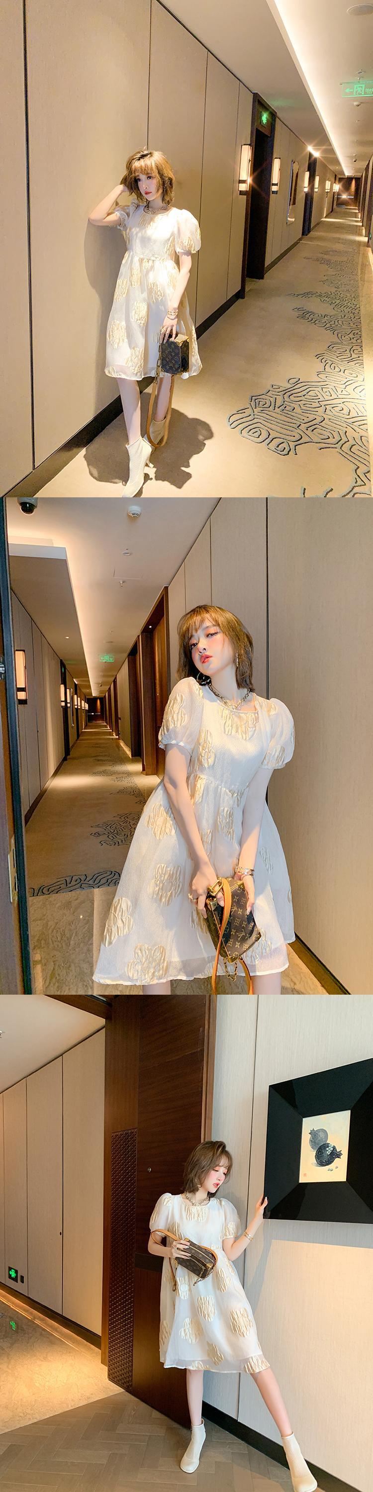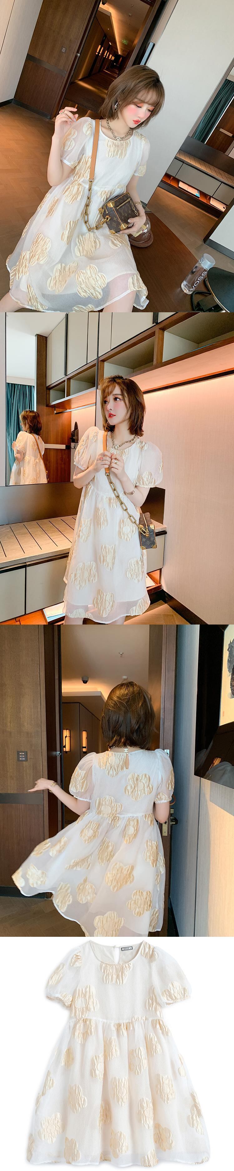 ラウンドネックプリーツFlowerデザイン スリーブスカート ドレス サマー 大人ガーリー スウィート キュート カジュアル 夏物 Oネック フラワーデザイン MIUCO72434244708