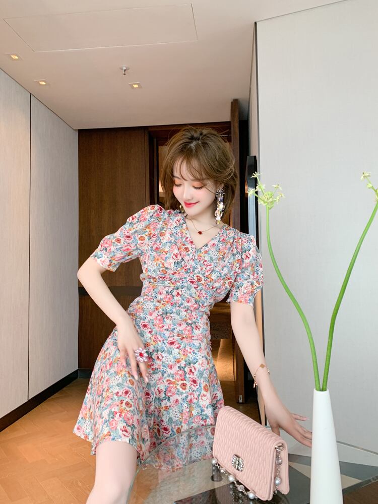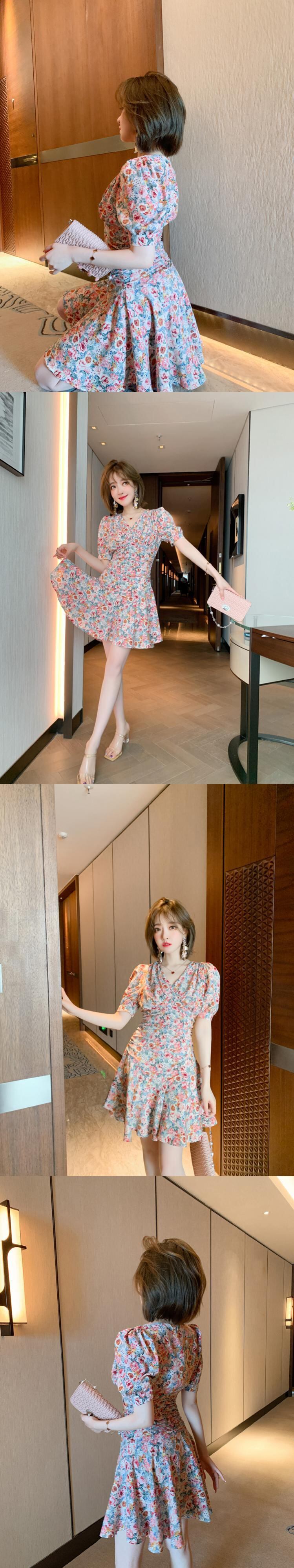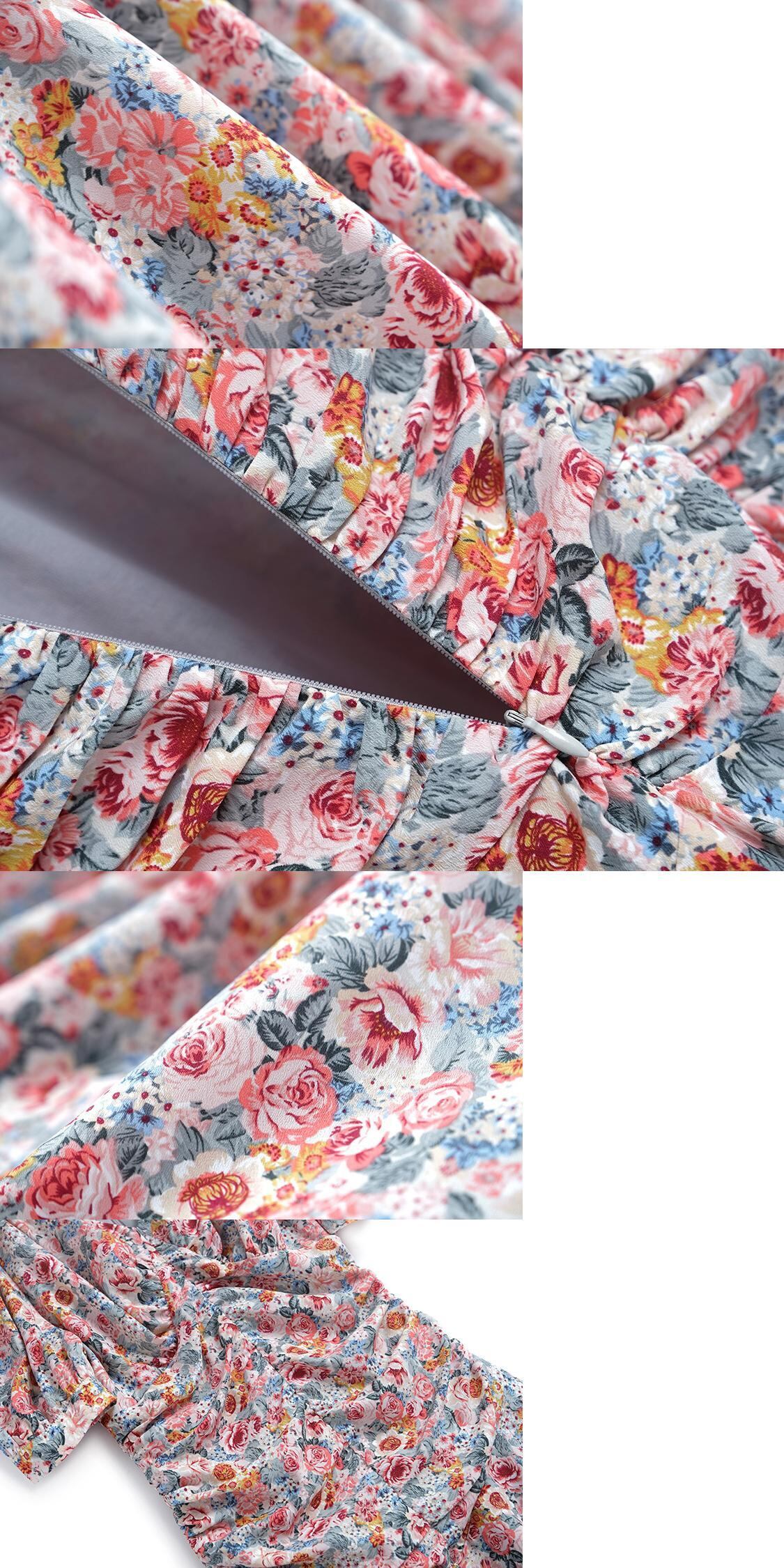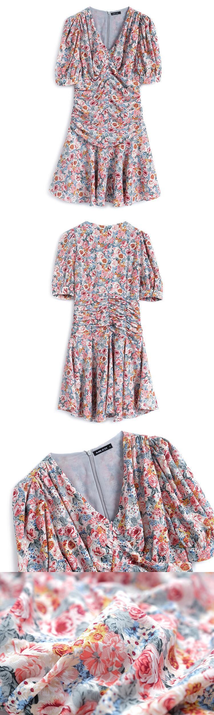 Vネックハイウェストウェストフローラルドレス サマースタイル 夏物 花柄 MIUCO17142684674