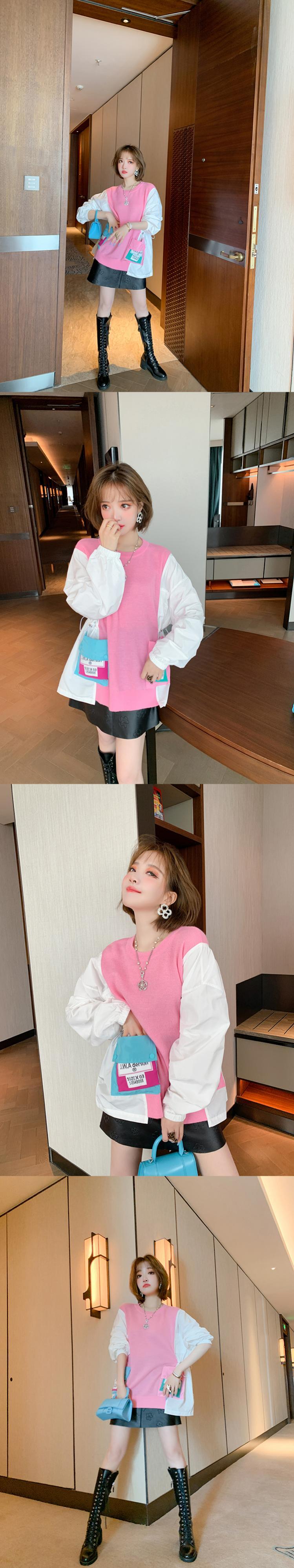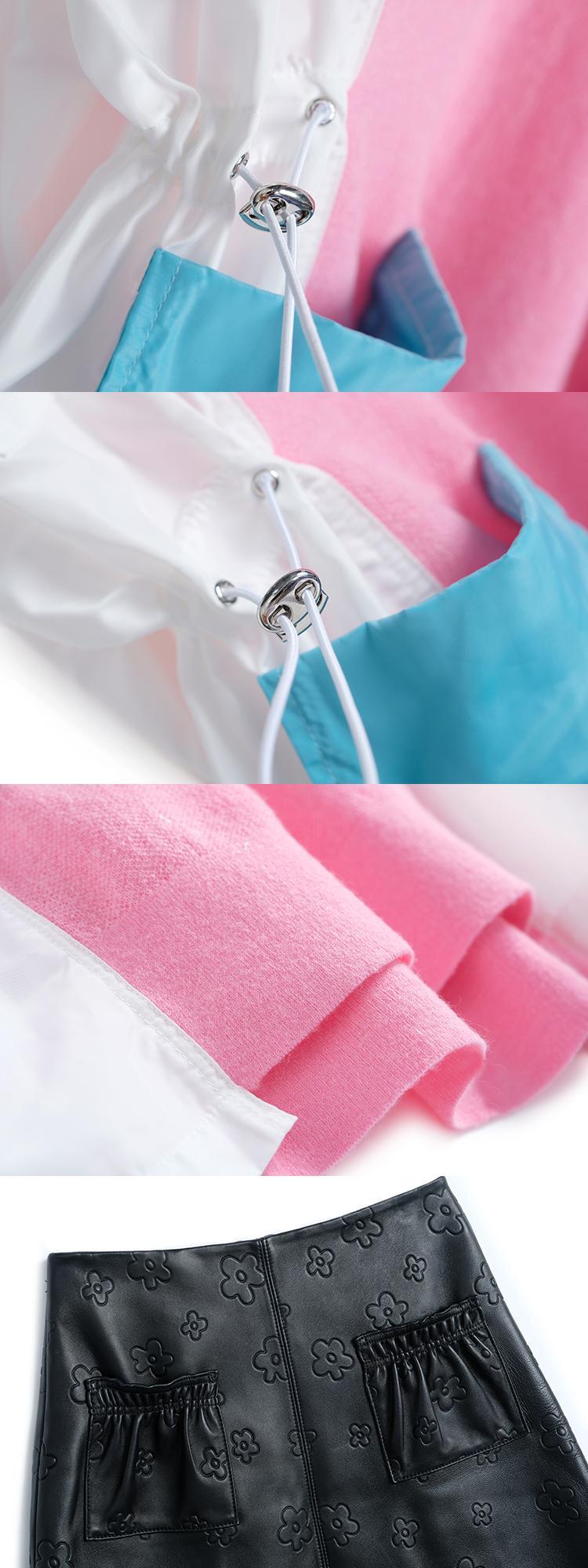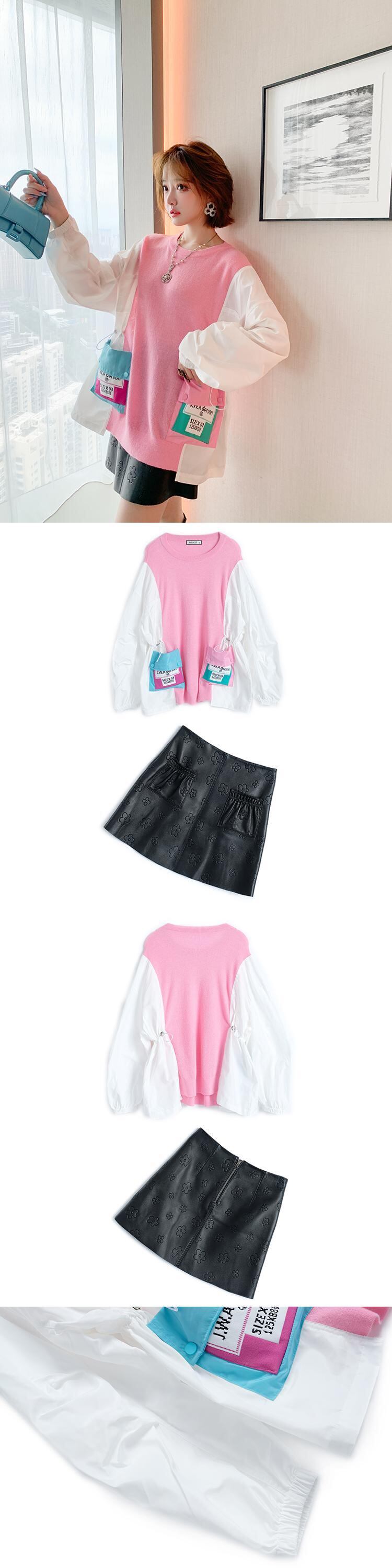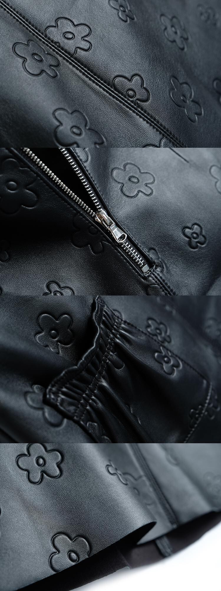 カラーポケットラウンドネックルーズトップス ハイウェストウェストレザースカート オータム 秋物 Oネック ステッチ MIUCO16333905185