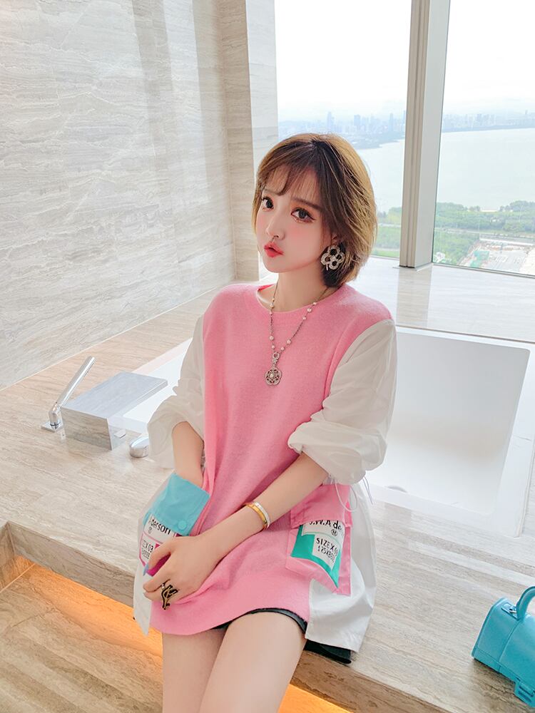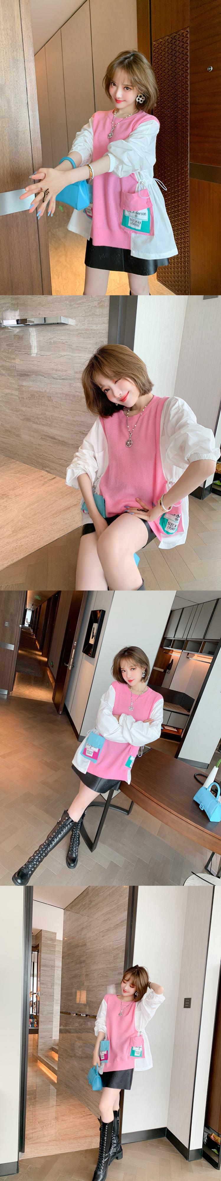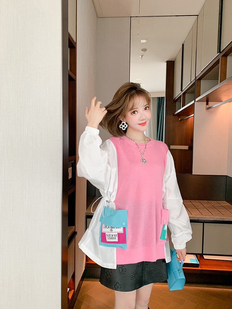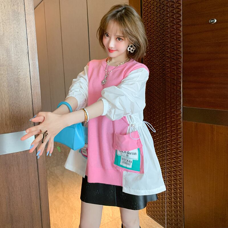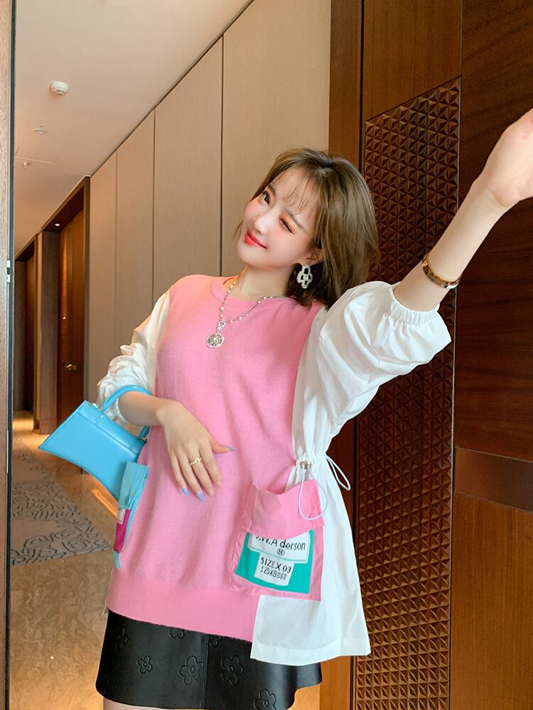 カラーポケットラウンドネックルーズトップス ハイウェストウェストレザースカート オータム 秋物 Oネック ステッチ MIUCO16333905185