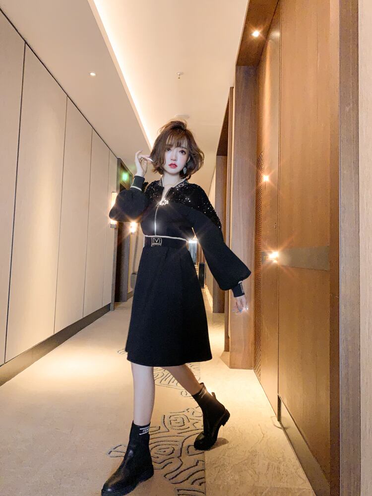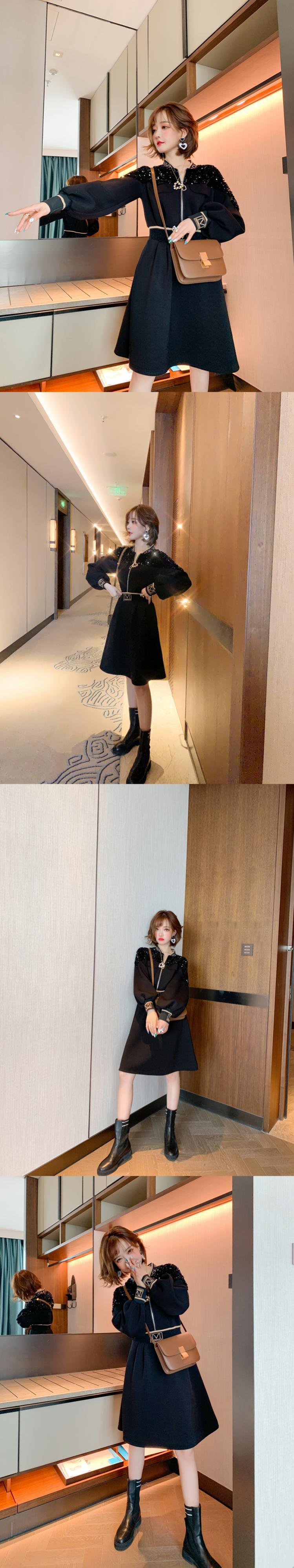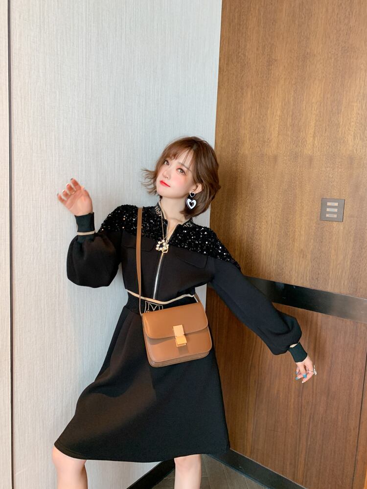 ジャカードニットカラースパンコールジッパーストレッチハイウェストウェストドレス オータムウィンター エラスティック 伸縮 秋物 冬物 MIUCO67534540520
