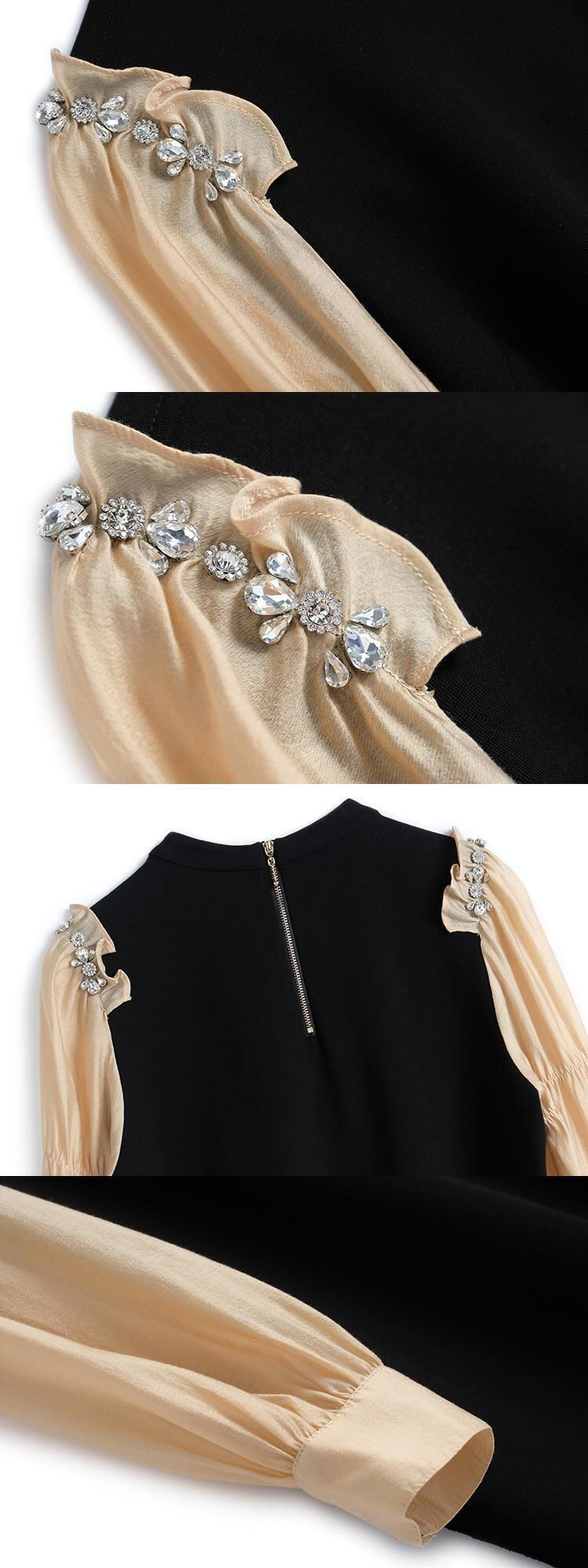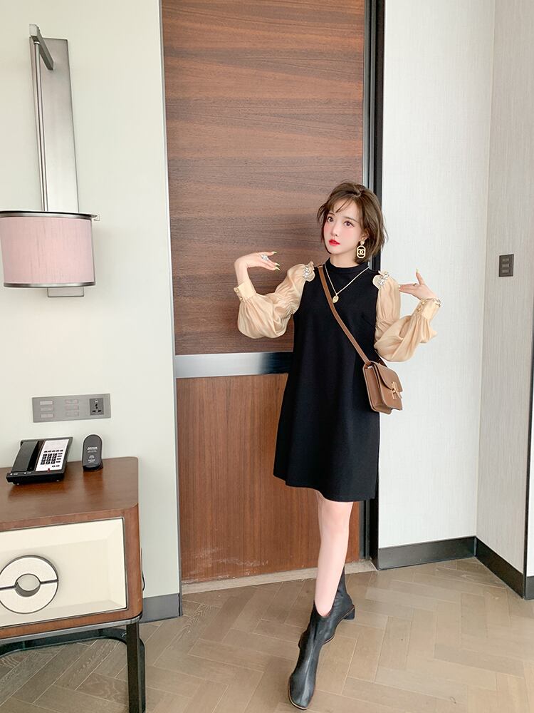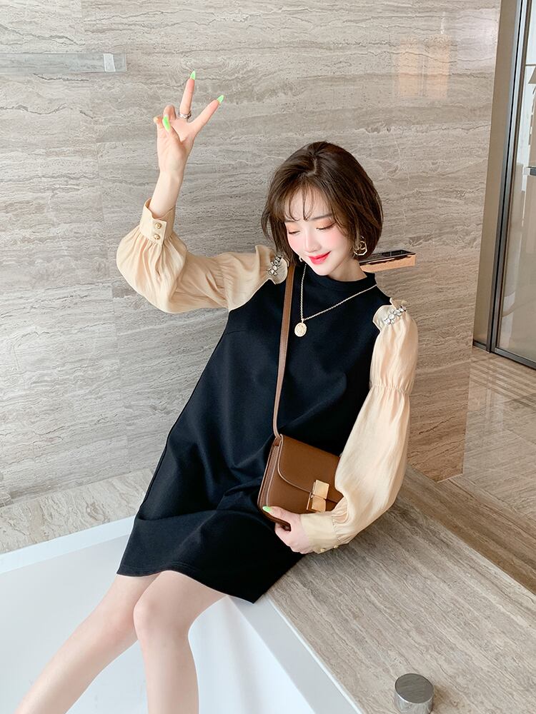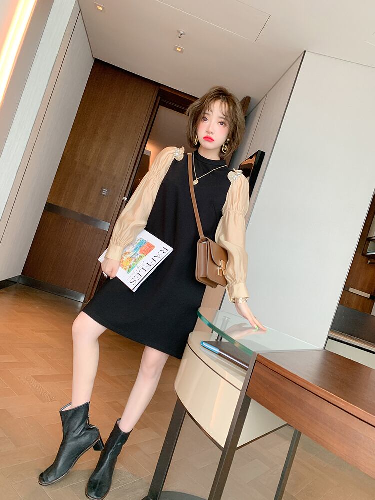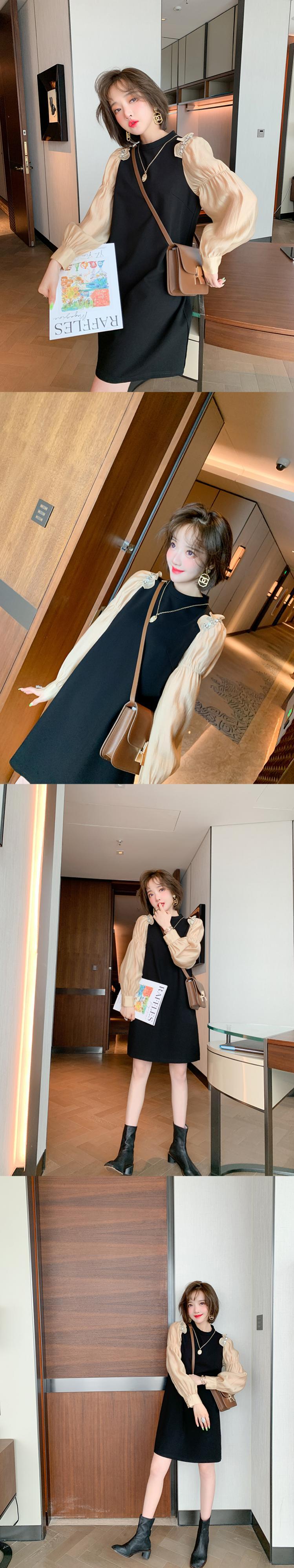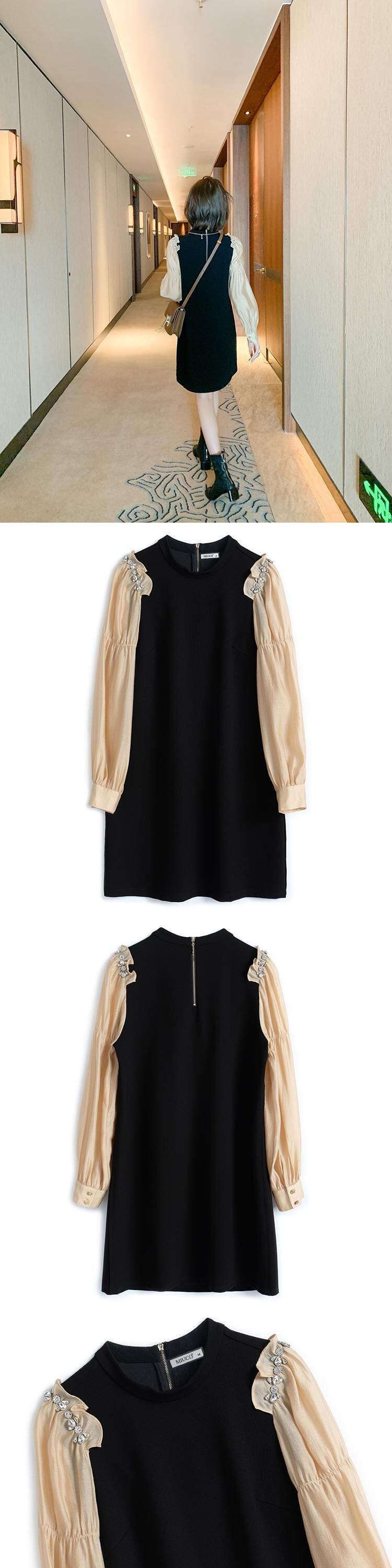 ラウンドネックプリーツスリーブルーズドレス エレガント Oネック ステッチ MIUCO98497367521