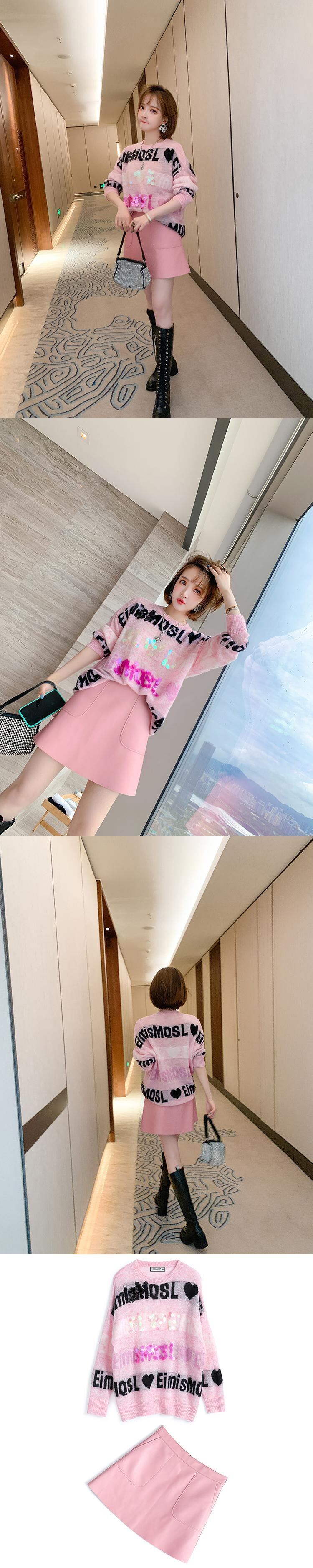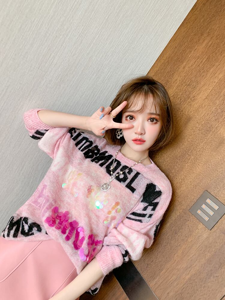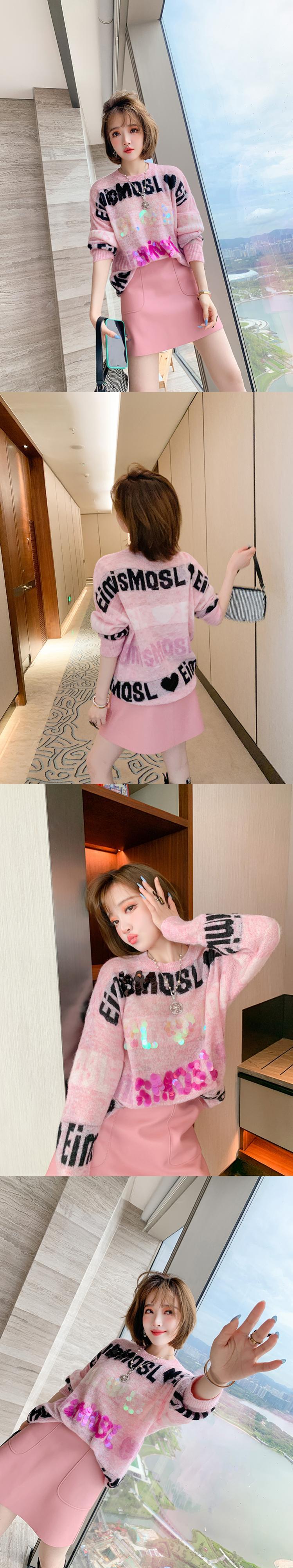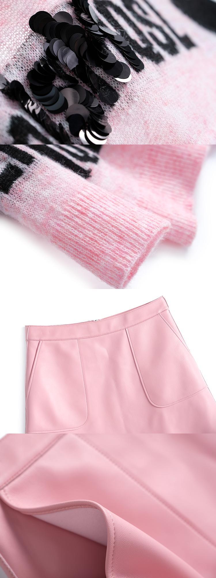ラウンドネックルーズニットトップス レザースカート オータムスタイル ピンク 秋物 Oネック MIUCO43933410711