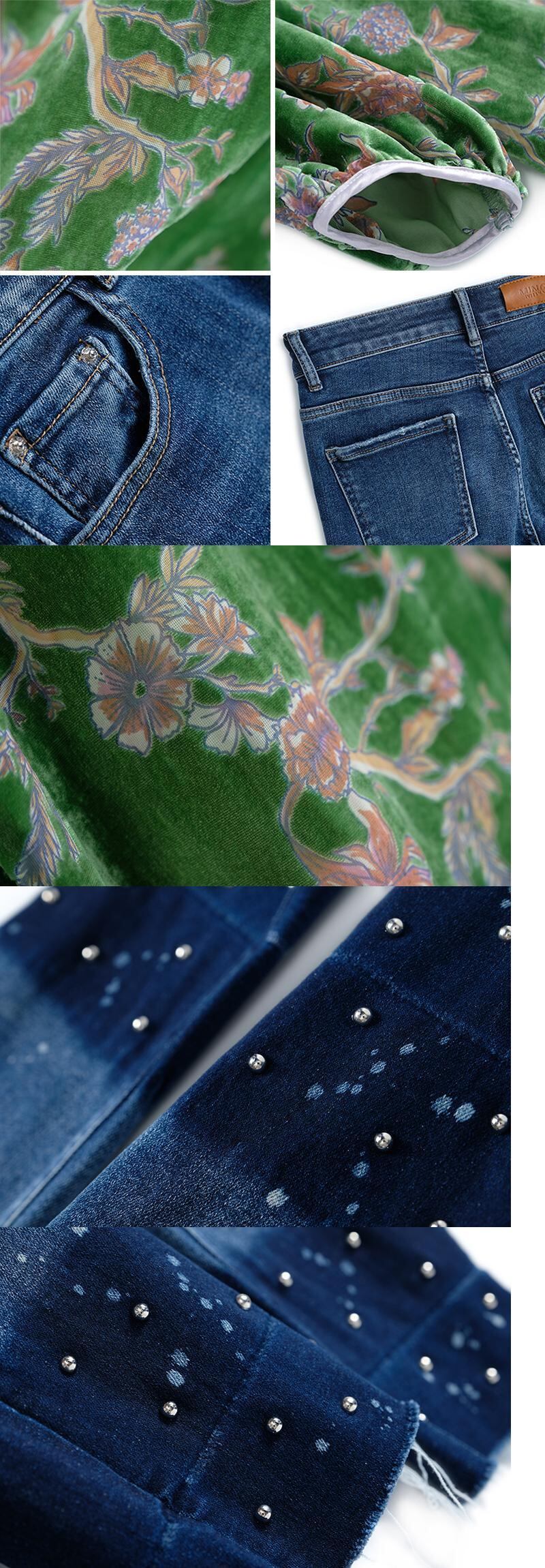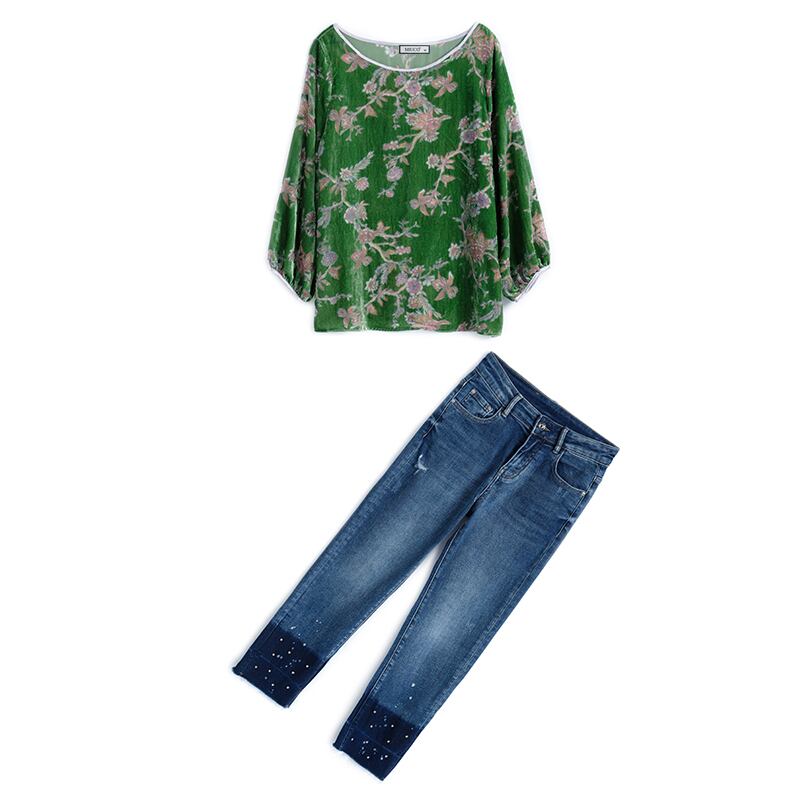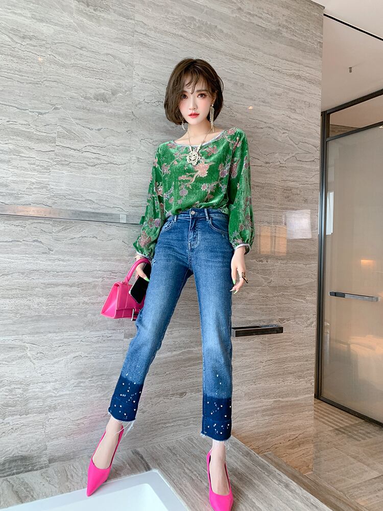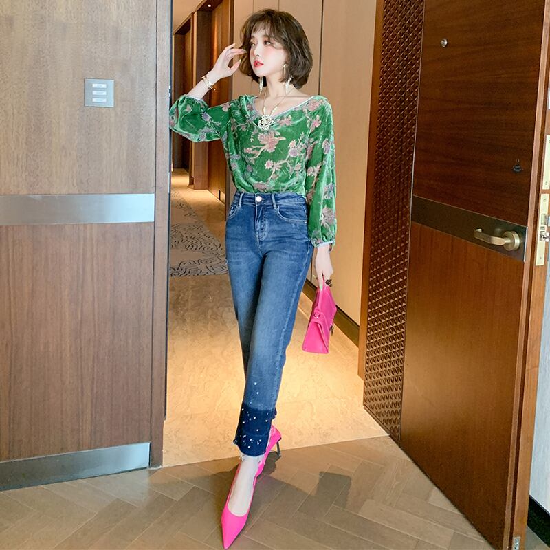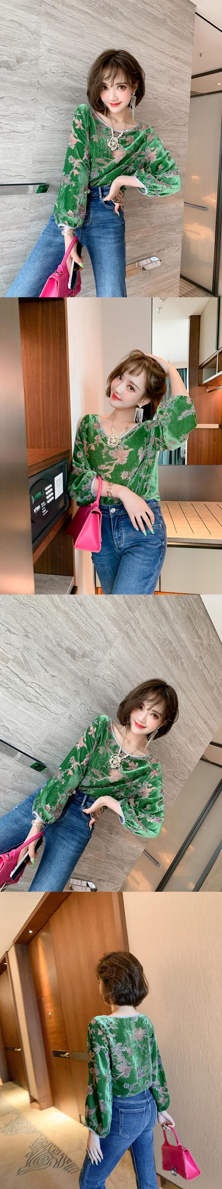 スタンダードフローラルベルベットシャツ カラー薄手ジーンズ オータム レトロ 秋物 花柄 MIUCO81264797905