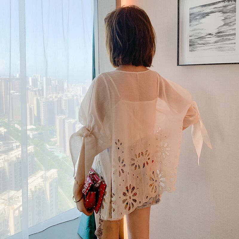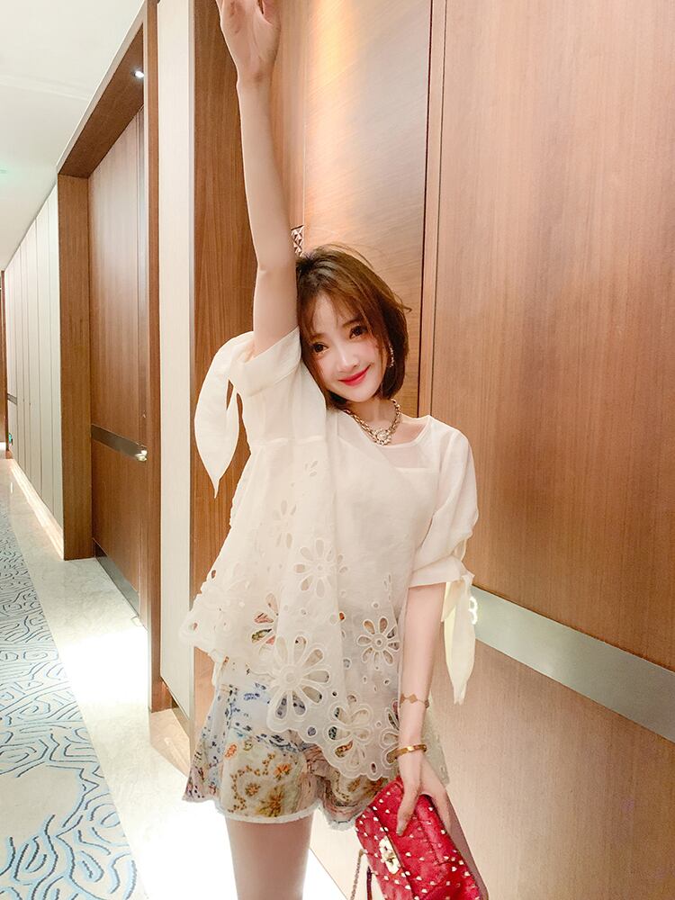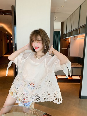 ラウンドネック刺繍トップス サマー 夏物 Oネック フラワーデザイン MIUCO34975752529