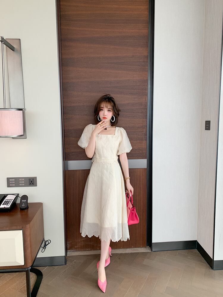 スタンダードカラースリムトップス ウェストジャカードスカート サマー リボン レトロ 夏物 スクウェア MIUCO42521301090