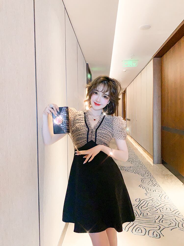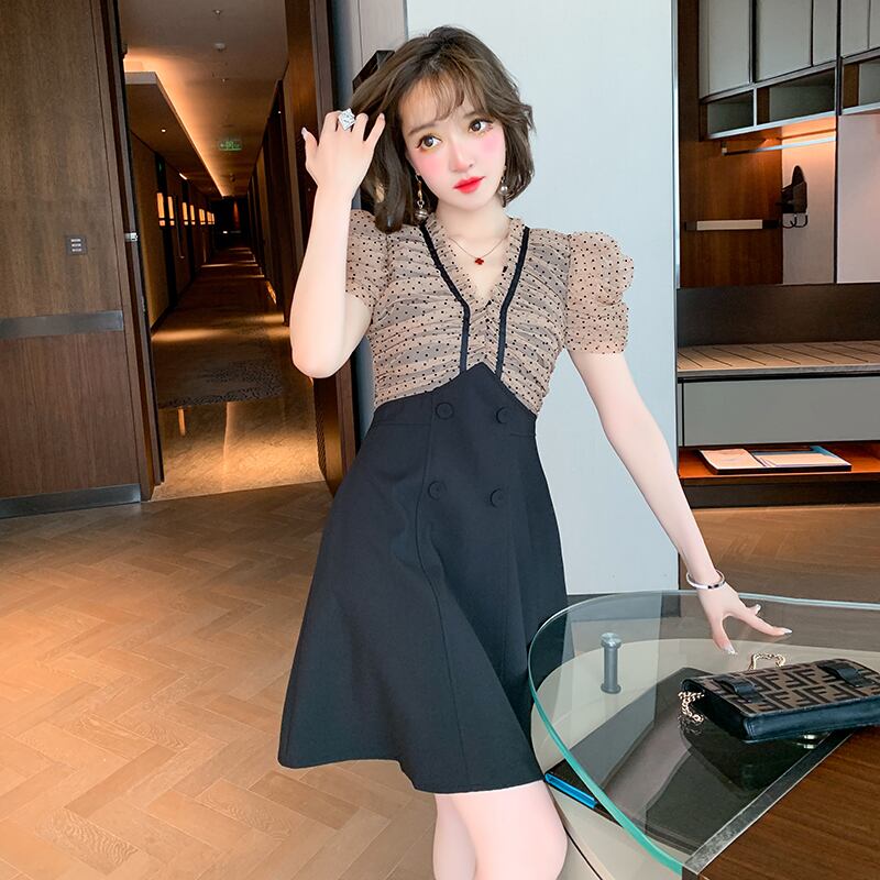 水玉メッシュプリーツスリムウェストドレス サマー 夏物 ステッチ MIUCO94963698258