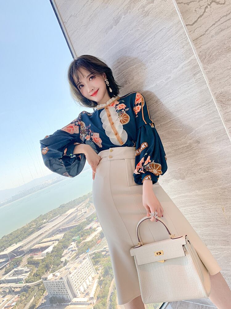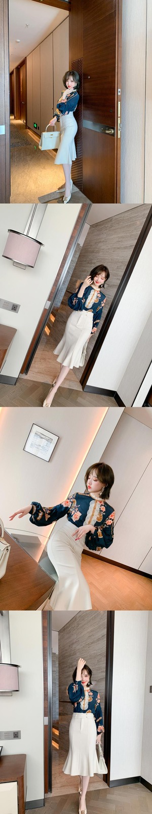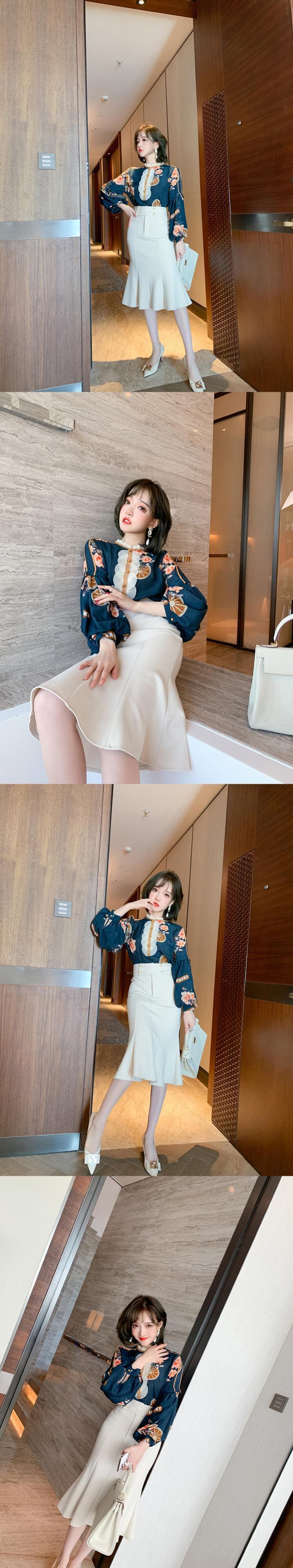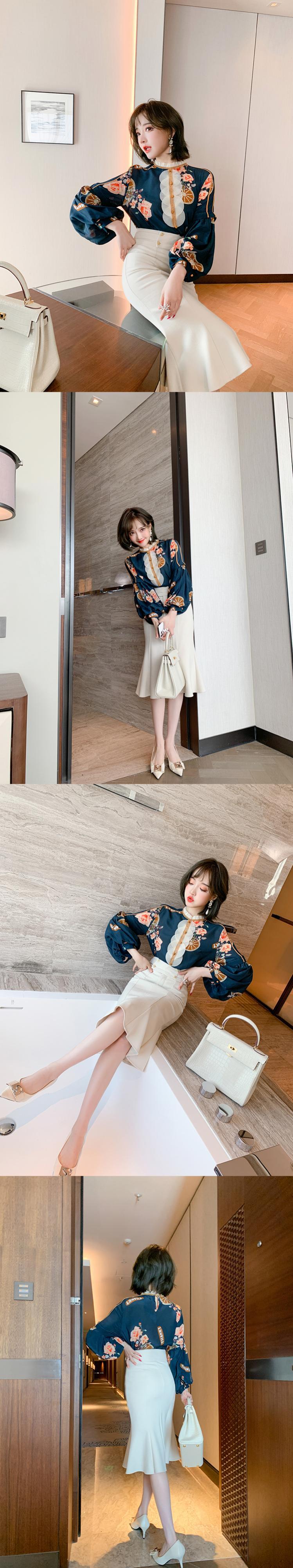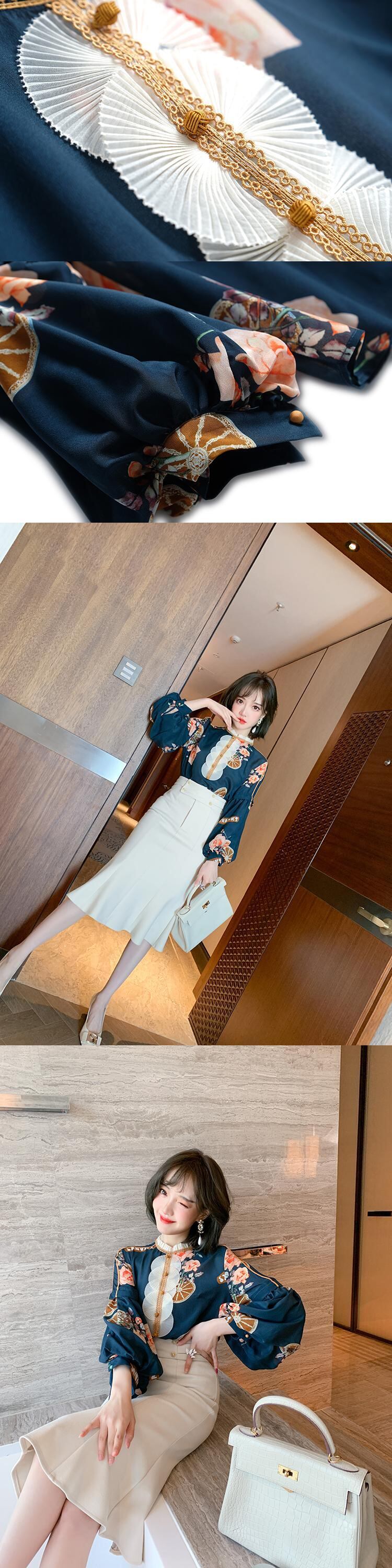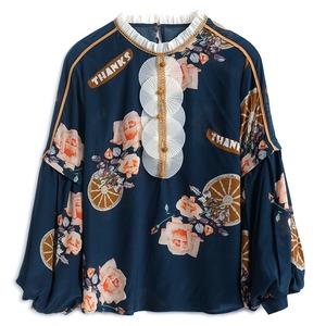 スタンダードプリントレースカラースリーブシャツ ランタンスリーブ レトロ MIUCO14965695693