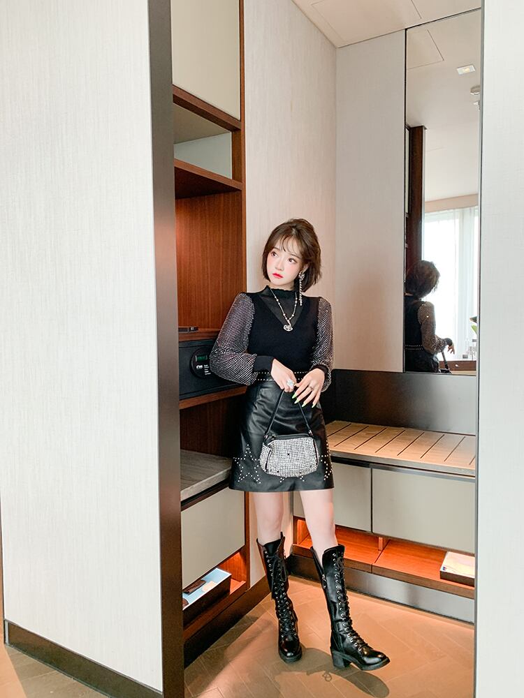 ラインストーンスリーブセーター ウェストスカート セット オータム 秋物 ステッチ MIUCO50381321462