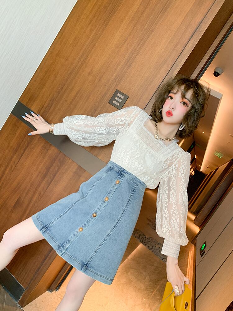 レースシャツ Aラインドレス オータム レッド 刺繍 秋物 スクウェア ステッチ MIUCO54184807113