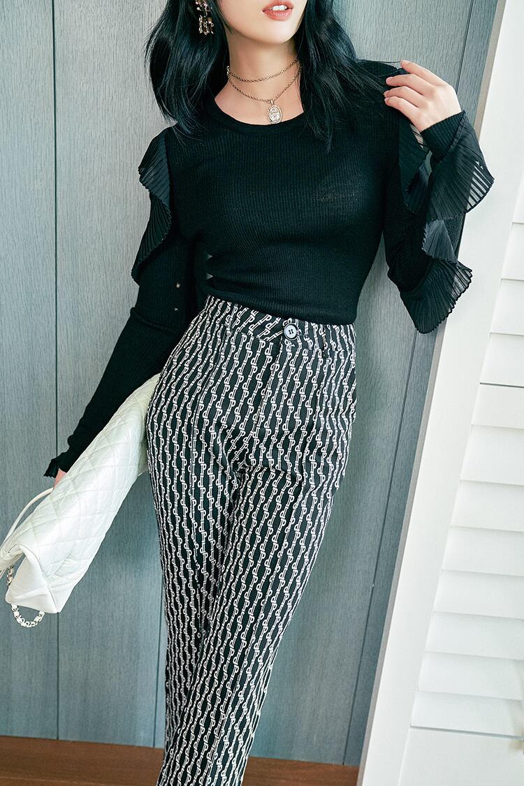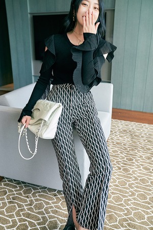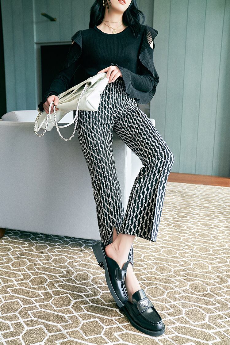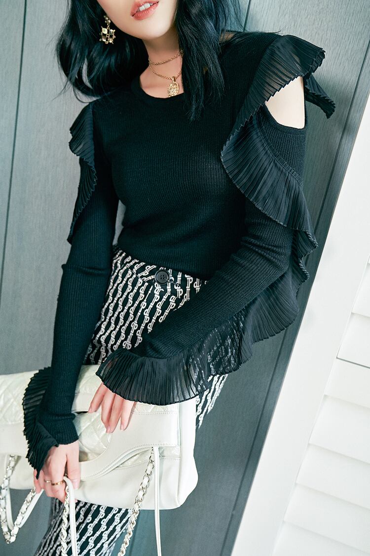 プリーツラッフルスリムシャツ オータム 秋物 オフショルダー ステッチ MIUCO10825845349