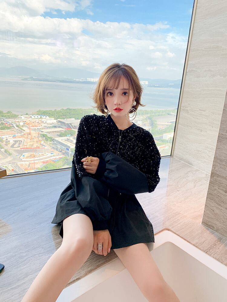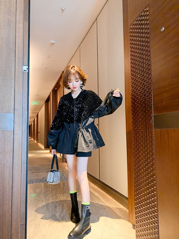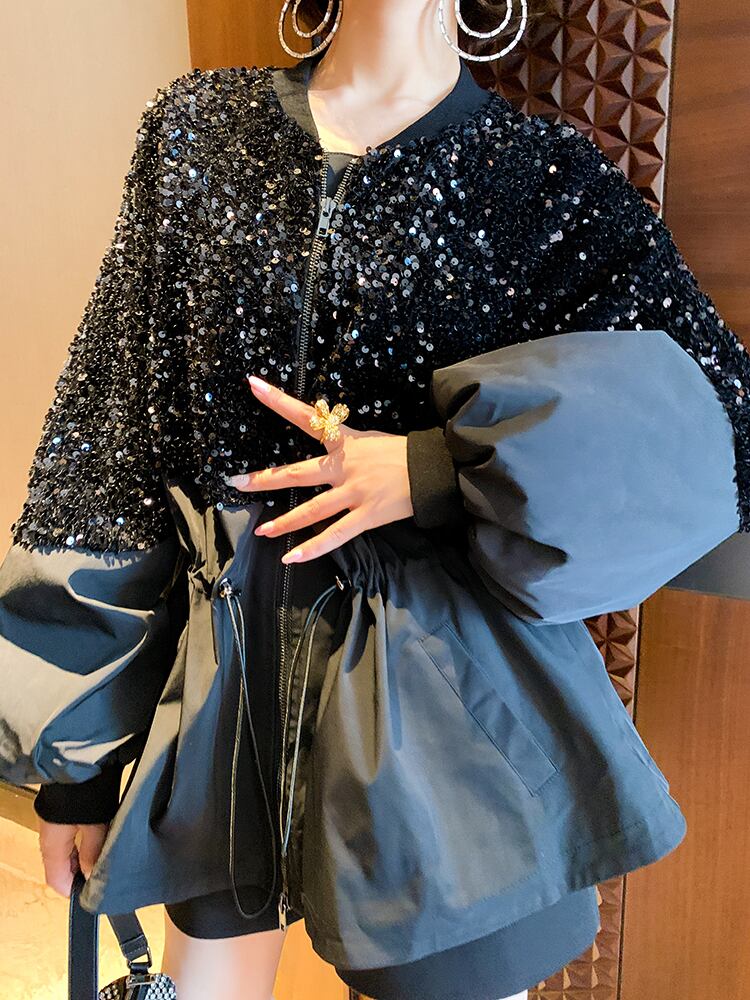 Vネックジッパーウェストギャザールーズジャケット オータムスタイル 秋物 ステッチ MIUCO80606366005