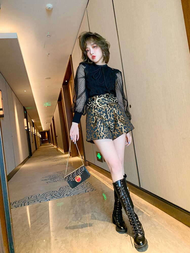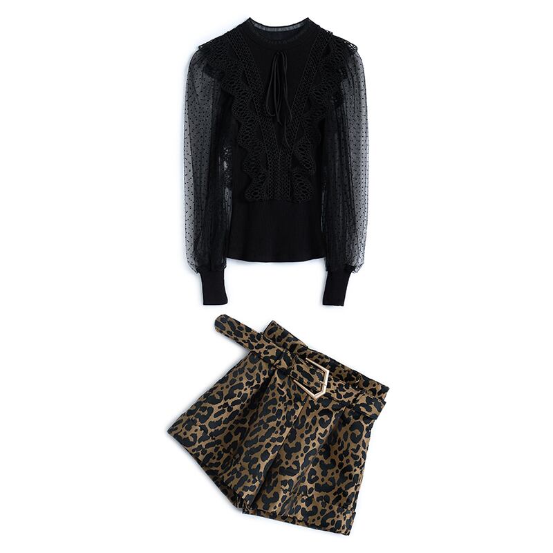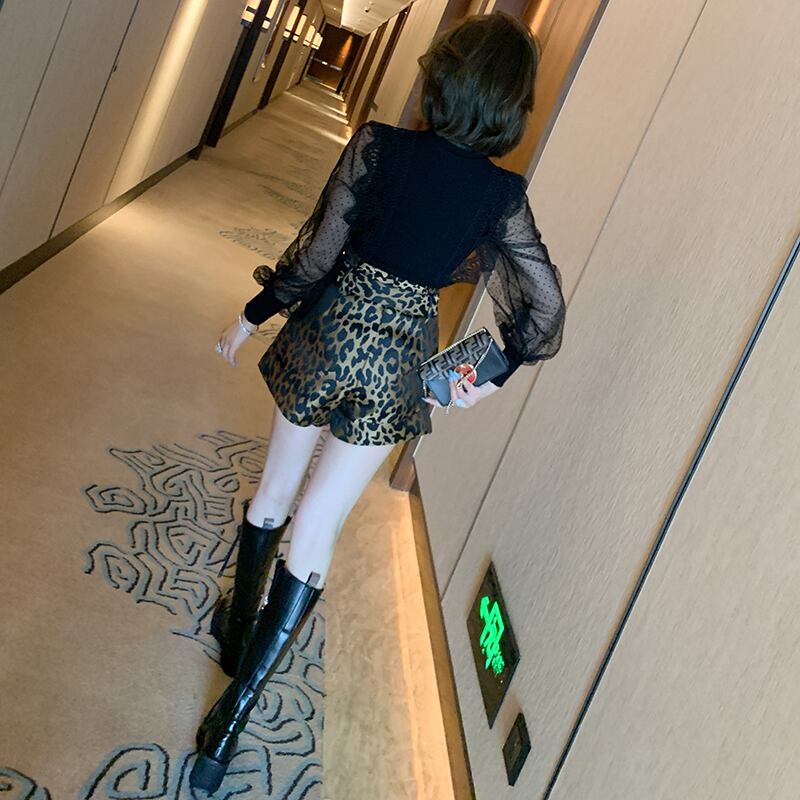 レースニットトップス ハイウェストウェストスリムレオパードショーツ オータム 秋物 ブルマー ステッチ MIUCO94383765181