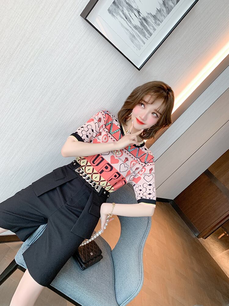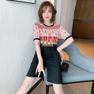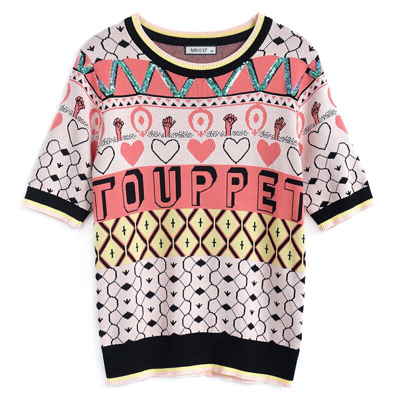 カラージャカードラウンドネックスパンコールニットスリムTシャツ サマースタイル 夏物 Oネック MIUCO99426281838