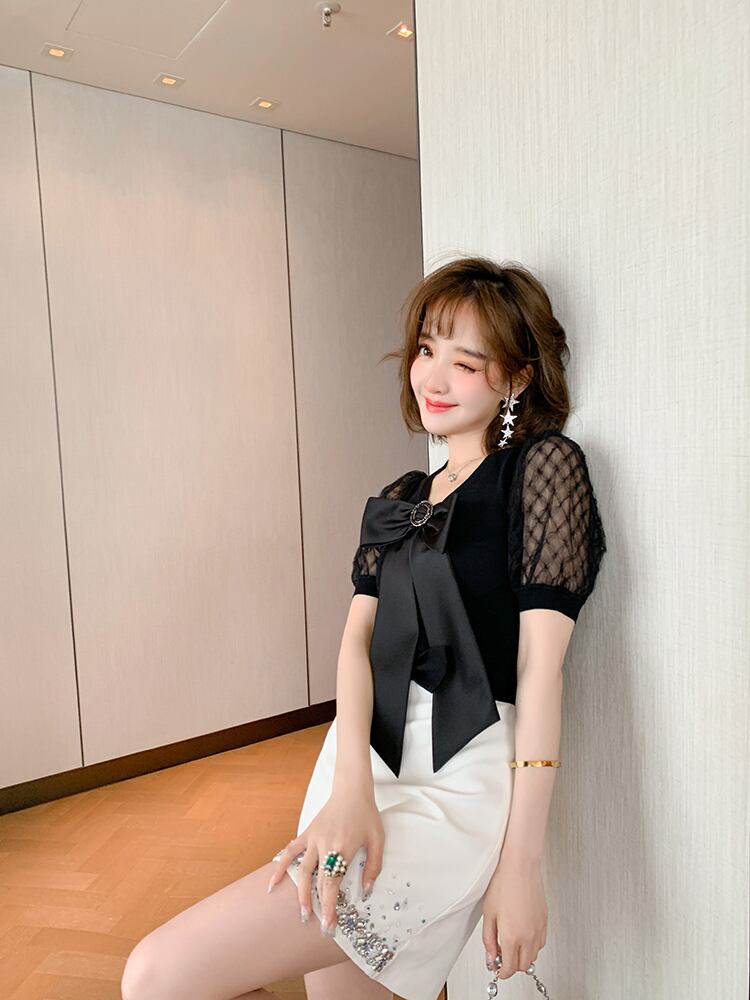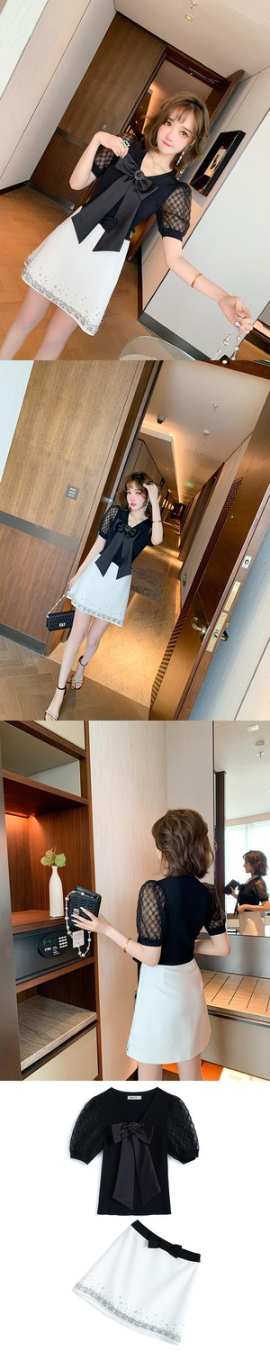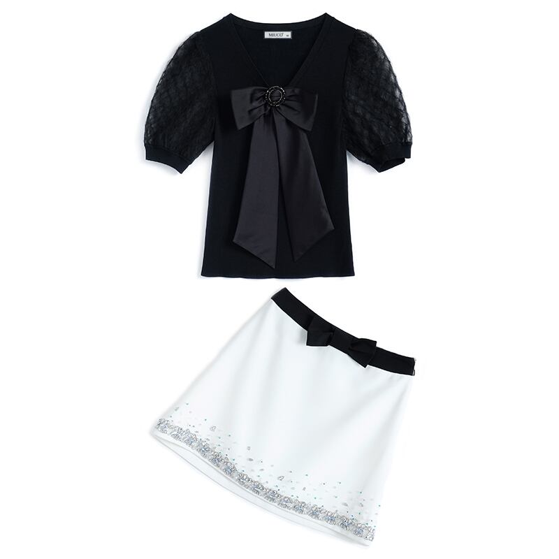 メッシュVネックリボントップス Aラインスカート MIUCO48293812976