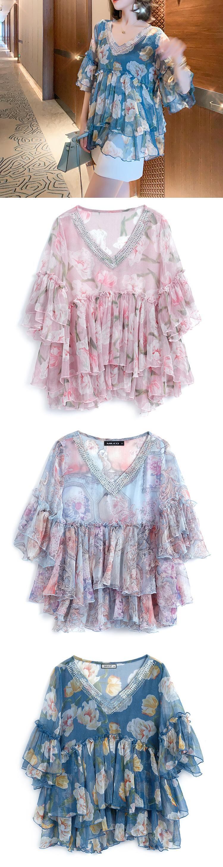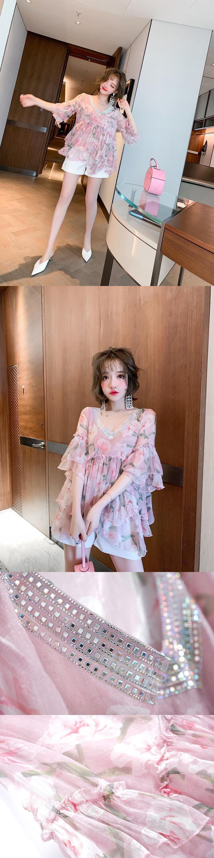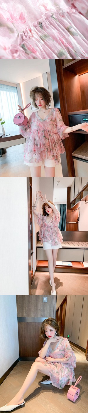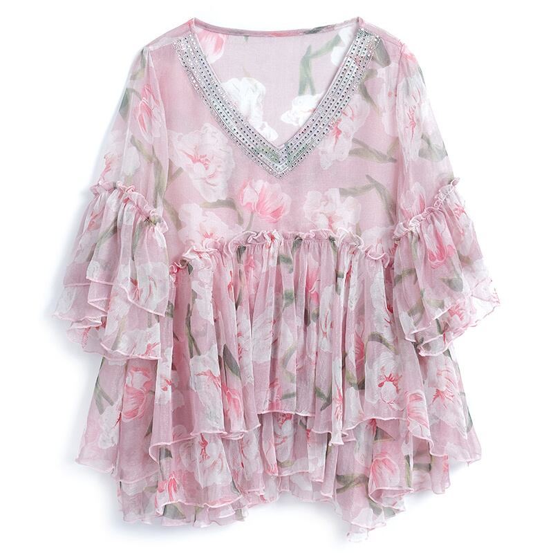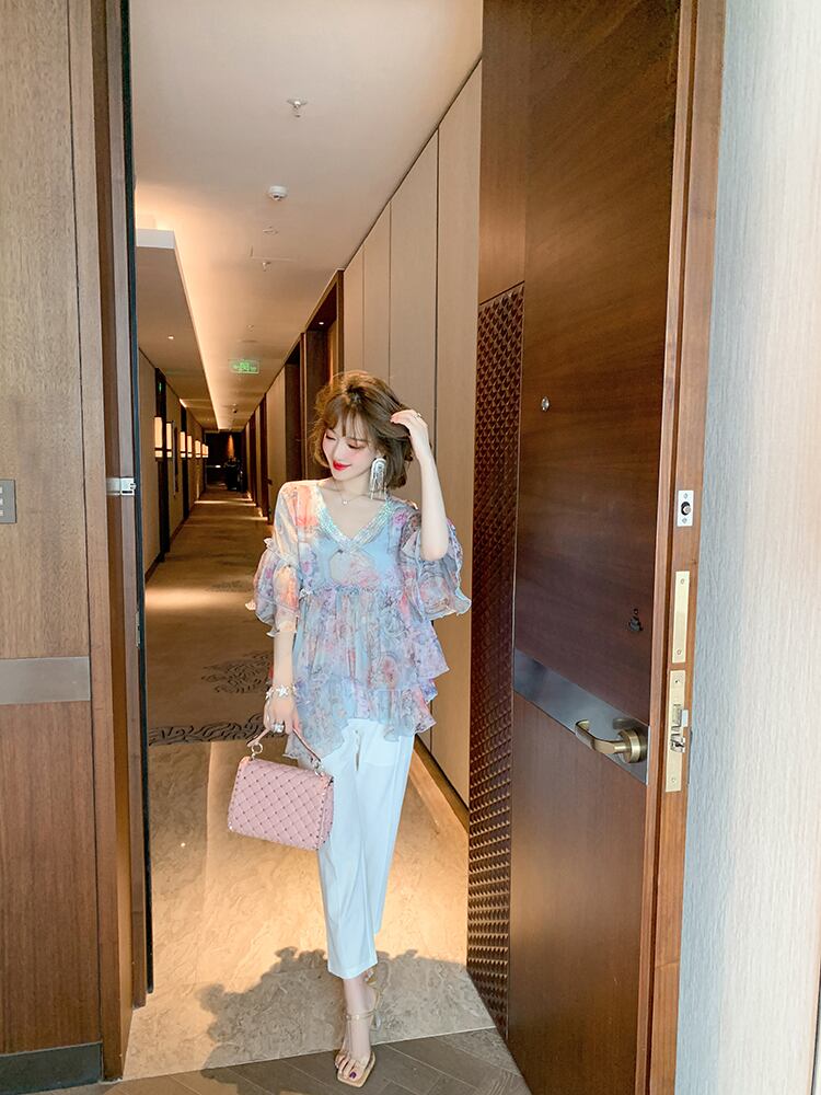 Vネックラインストーンスリーブプリントシフォンシャツ オータムサマー 夏物 秋物 ステッチ MIUCO67234043062