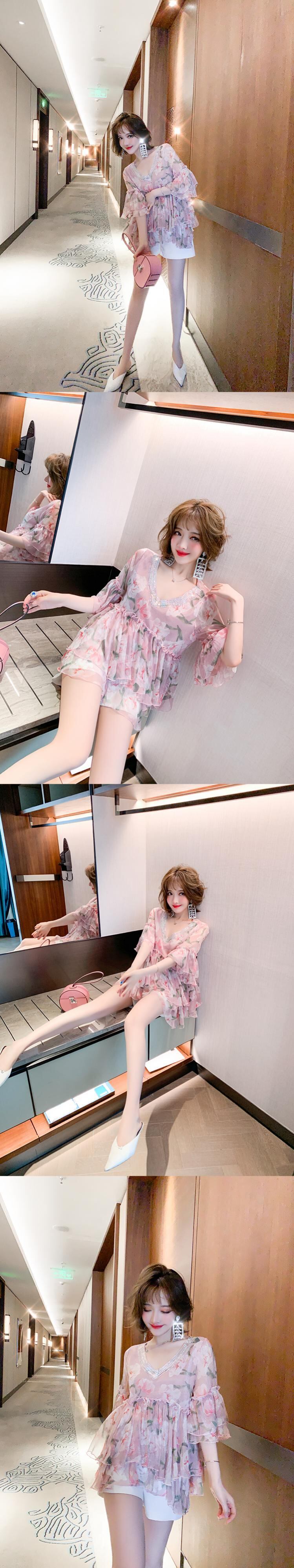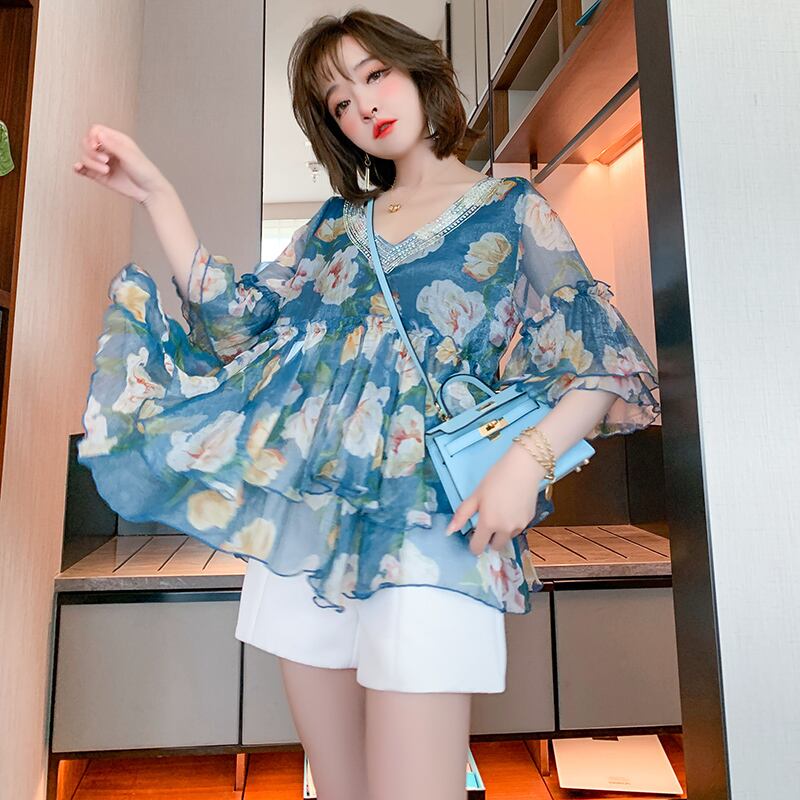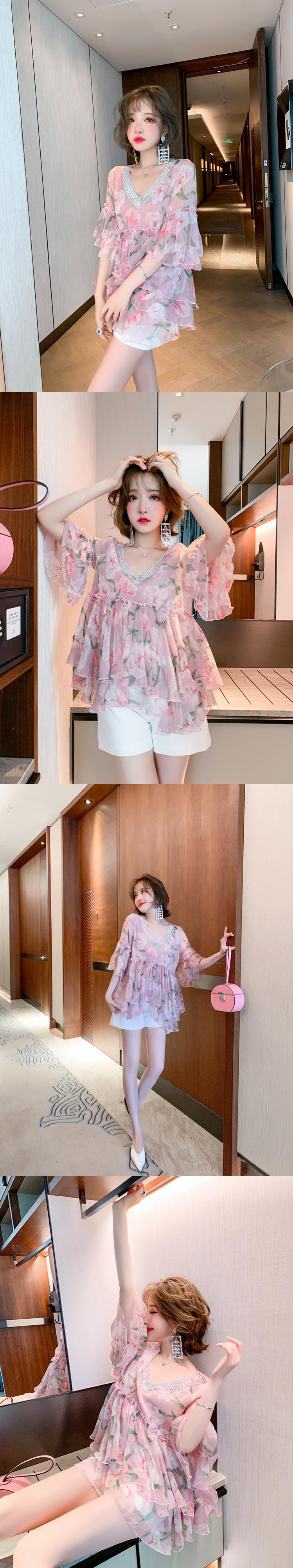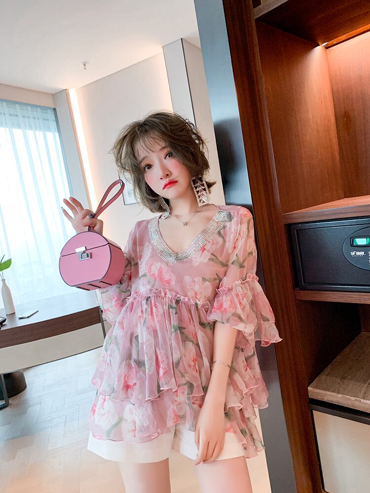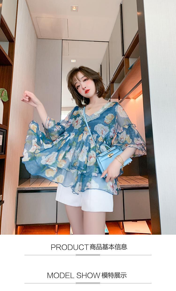 Vネックラインストーンスリーブプリントシフォンシャツ オータムサマー 夏物 秋物 ステッチ MIUCO67234043062