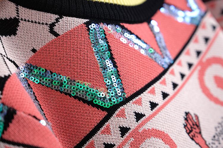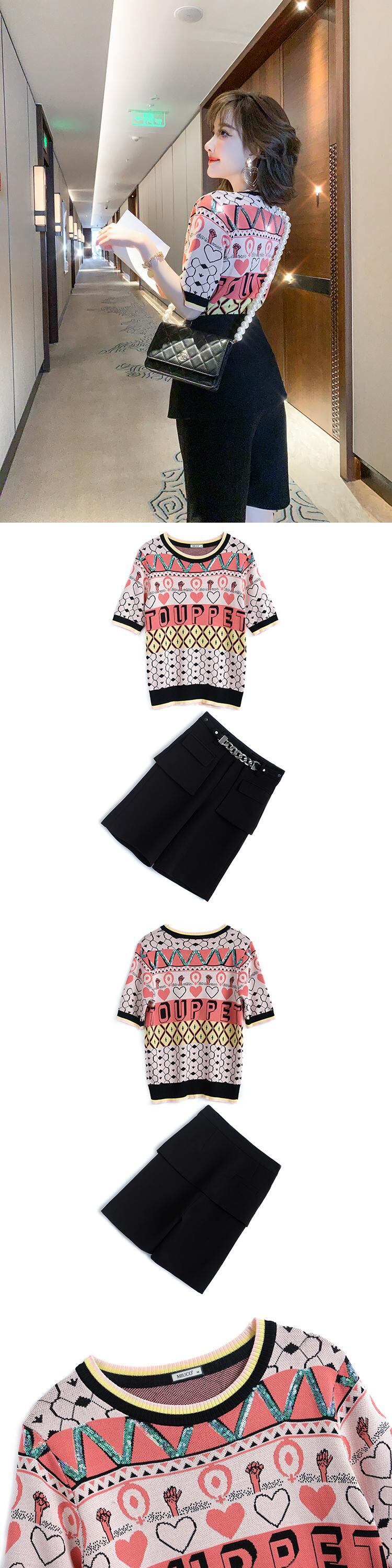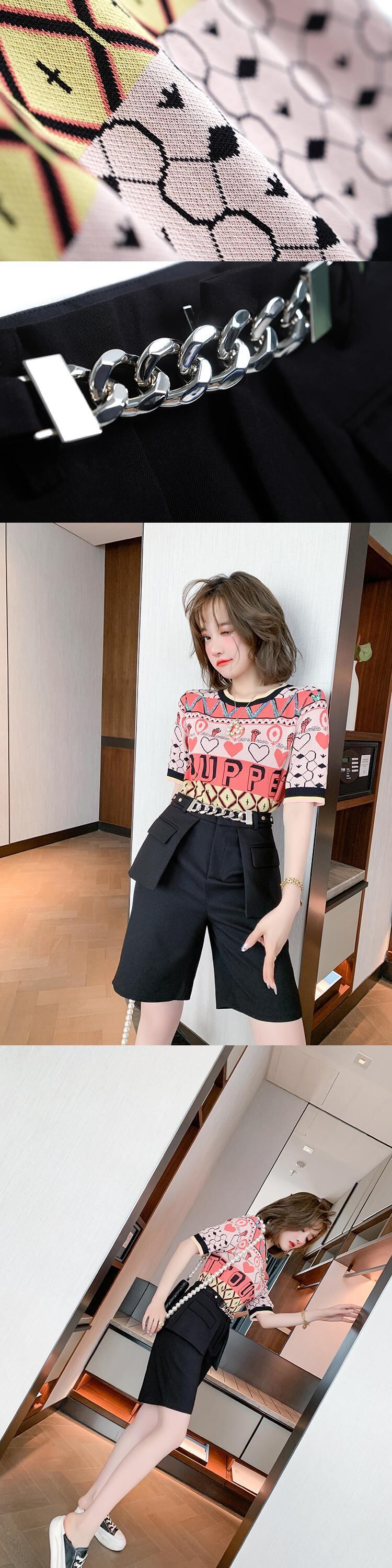 カラージャカードラウンドネックニットTシャツ パンツ Oネック ステッチ MIUCO19289721048