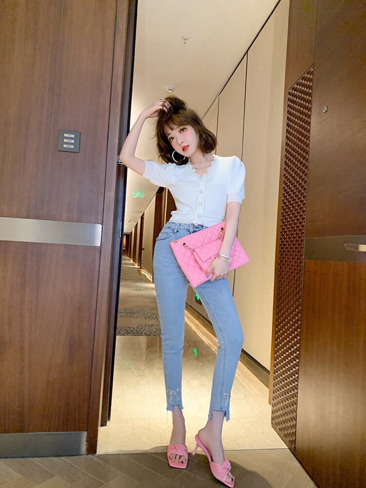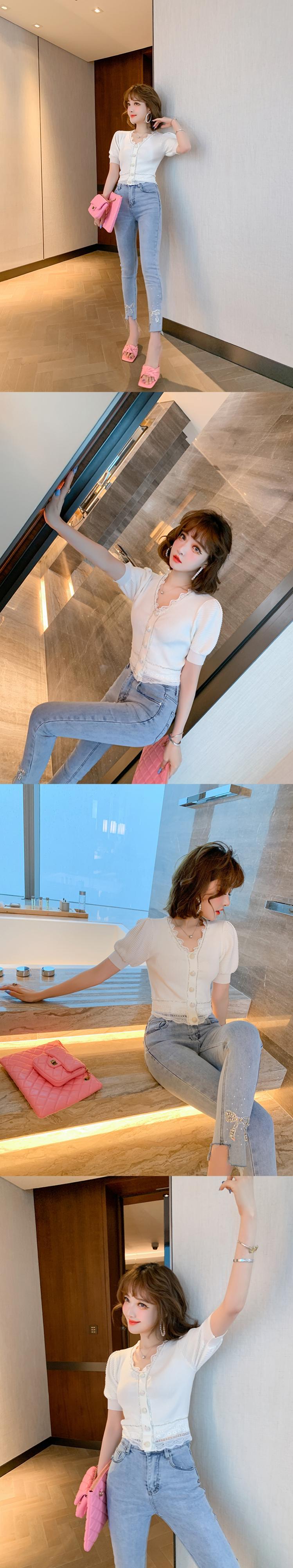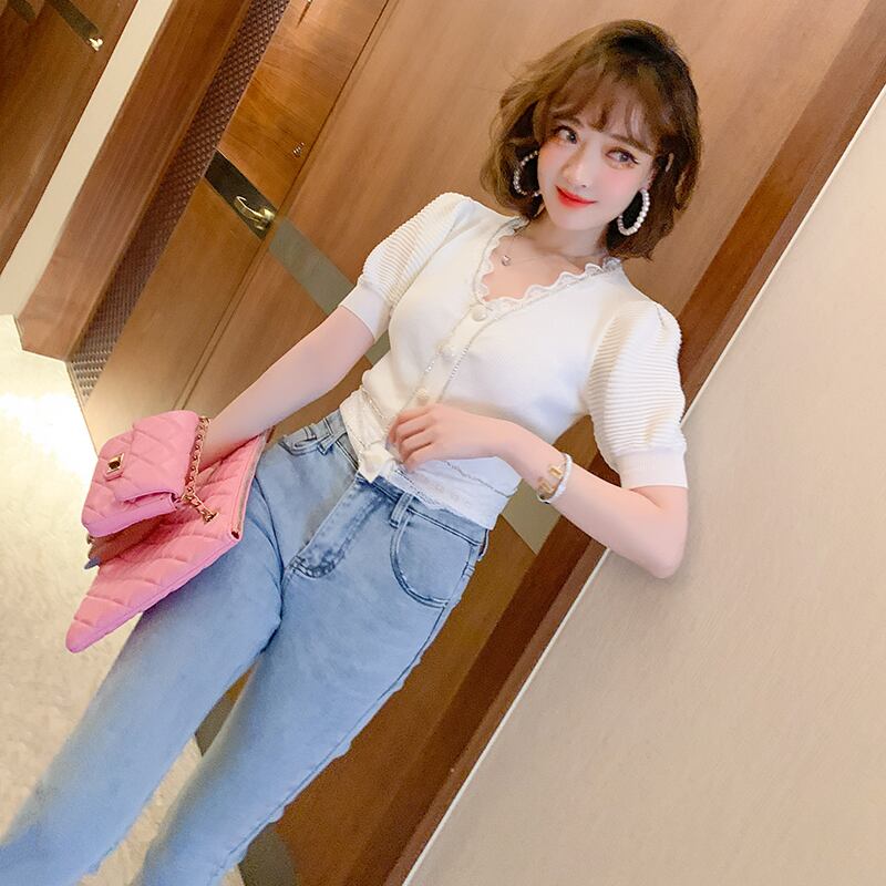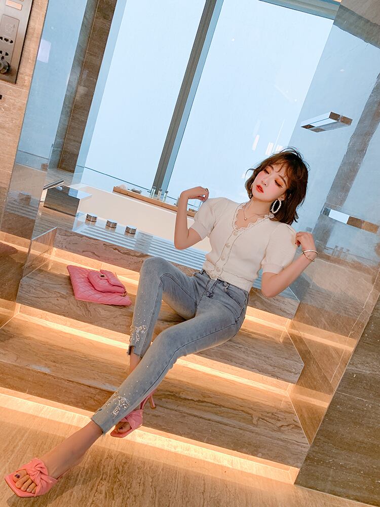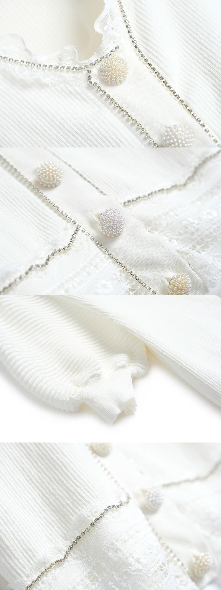 VネックレースショートニットTシャツ オータム 秋物 MIUCO18826560169