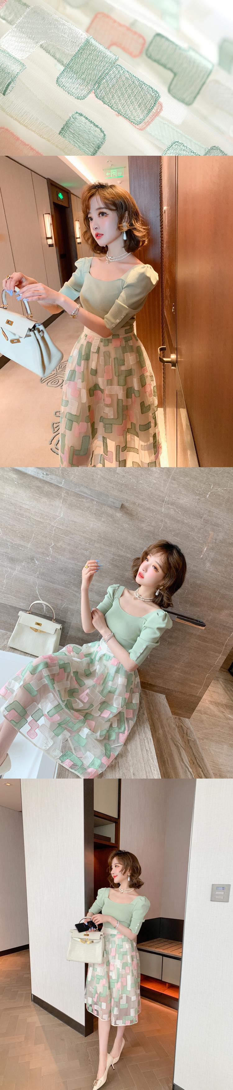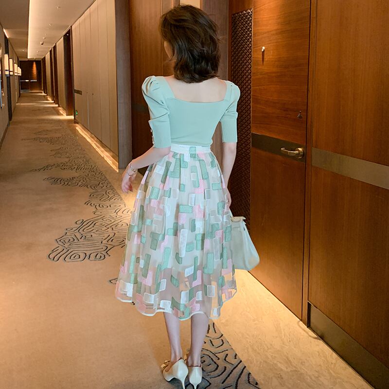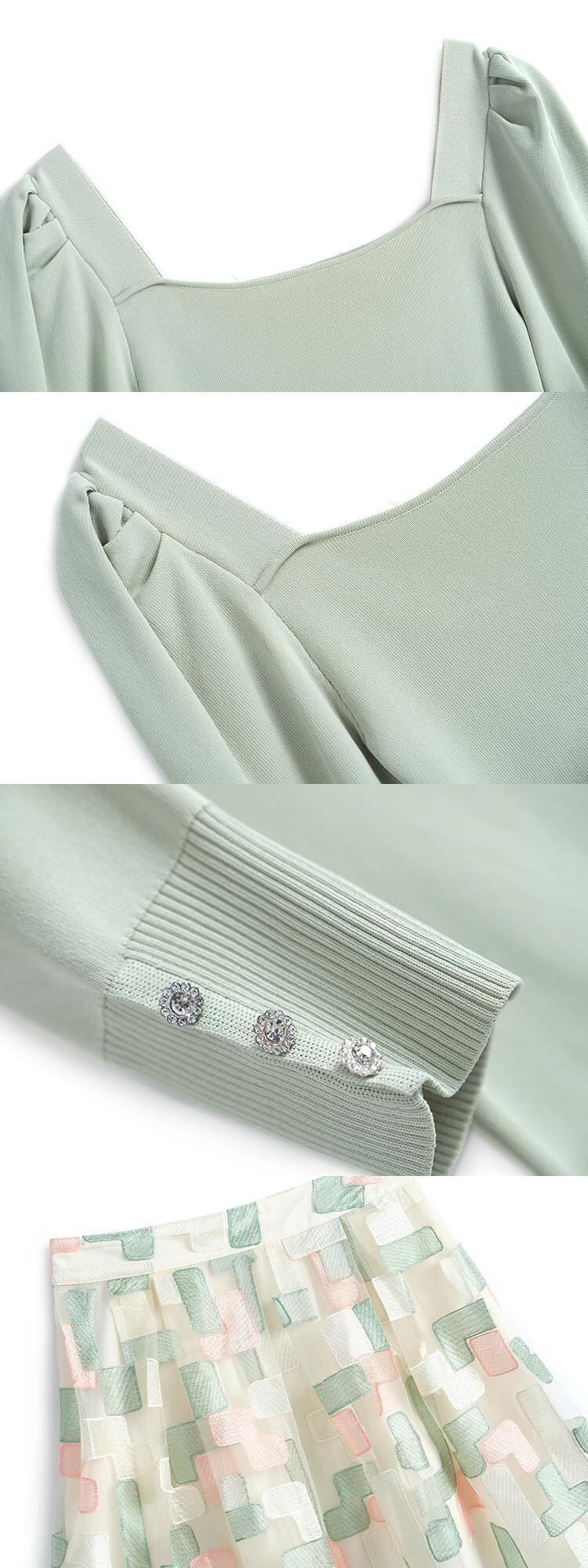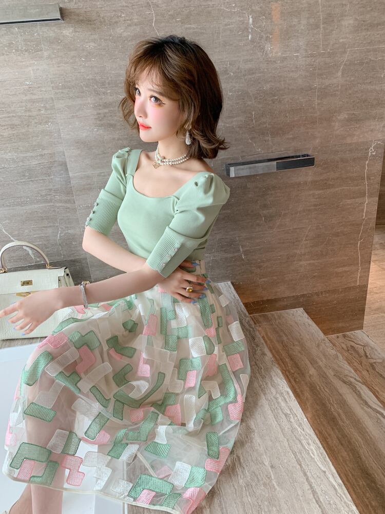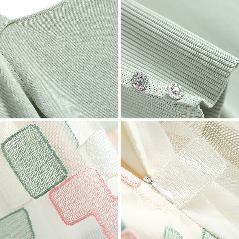 スリムニットTシャツ ウェストメッシュスカート オータム レッド 刺繍 秋物 MIUCO66680864119
