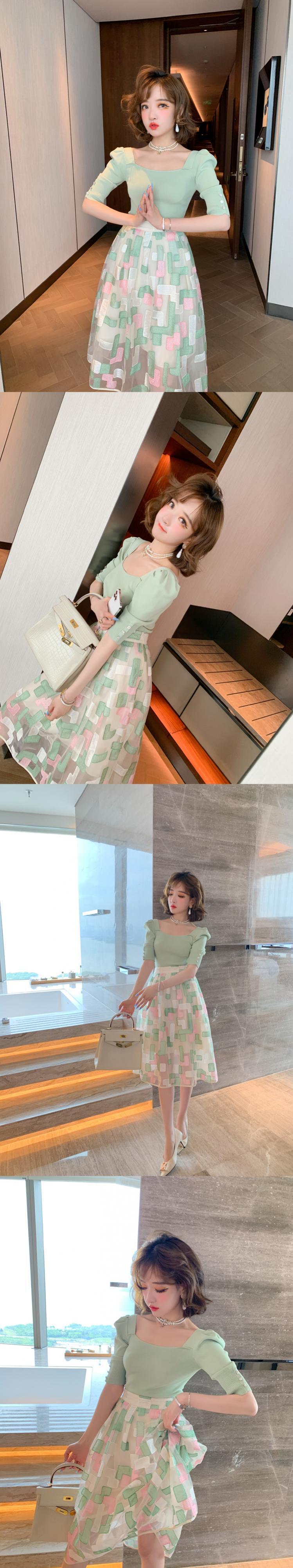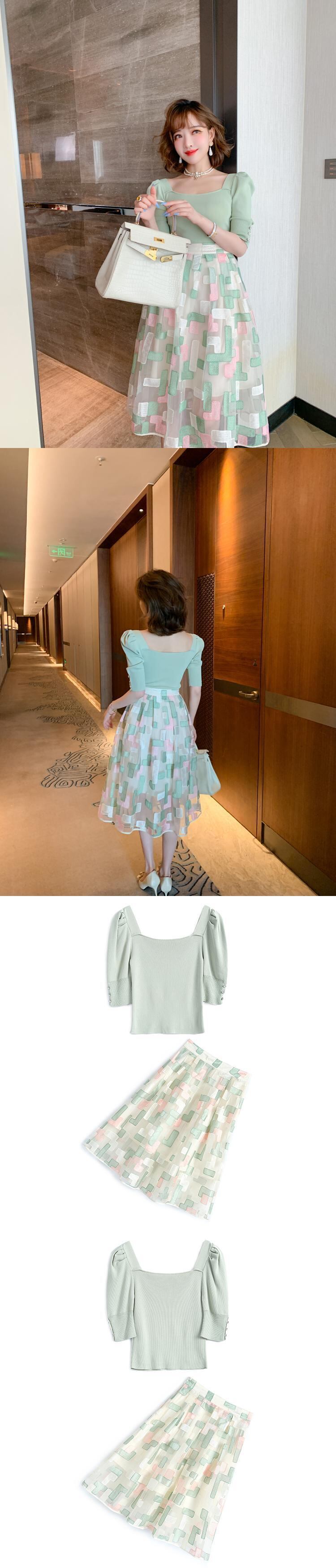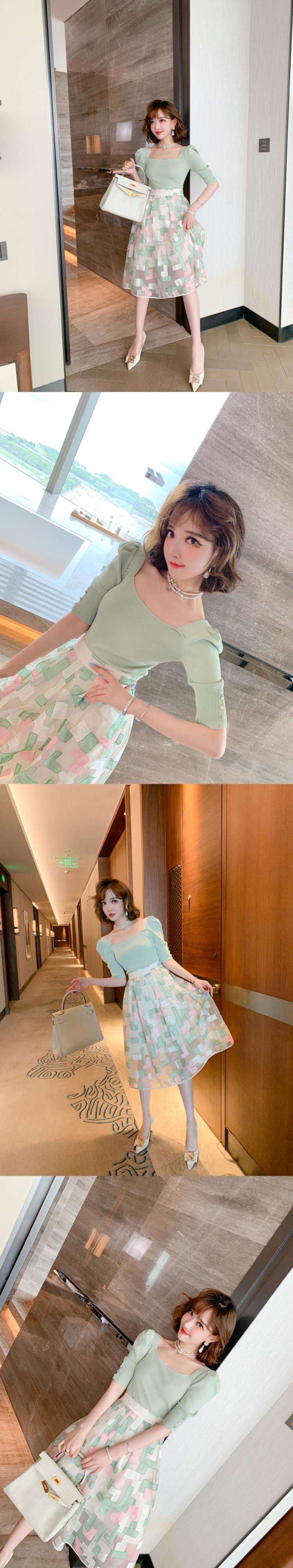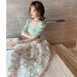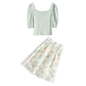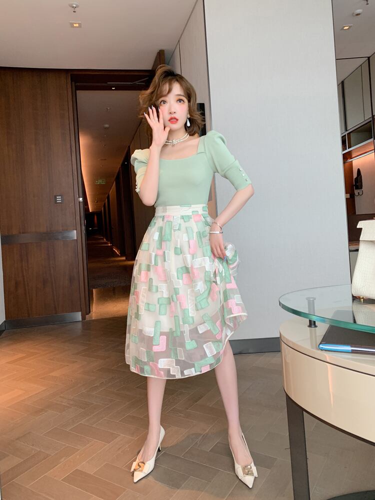 スリムニットTシャツ ウェストメッシュスカート オータム レッド 刺繍 秋物 MIUCO66680864119