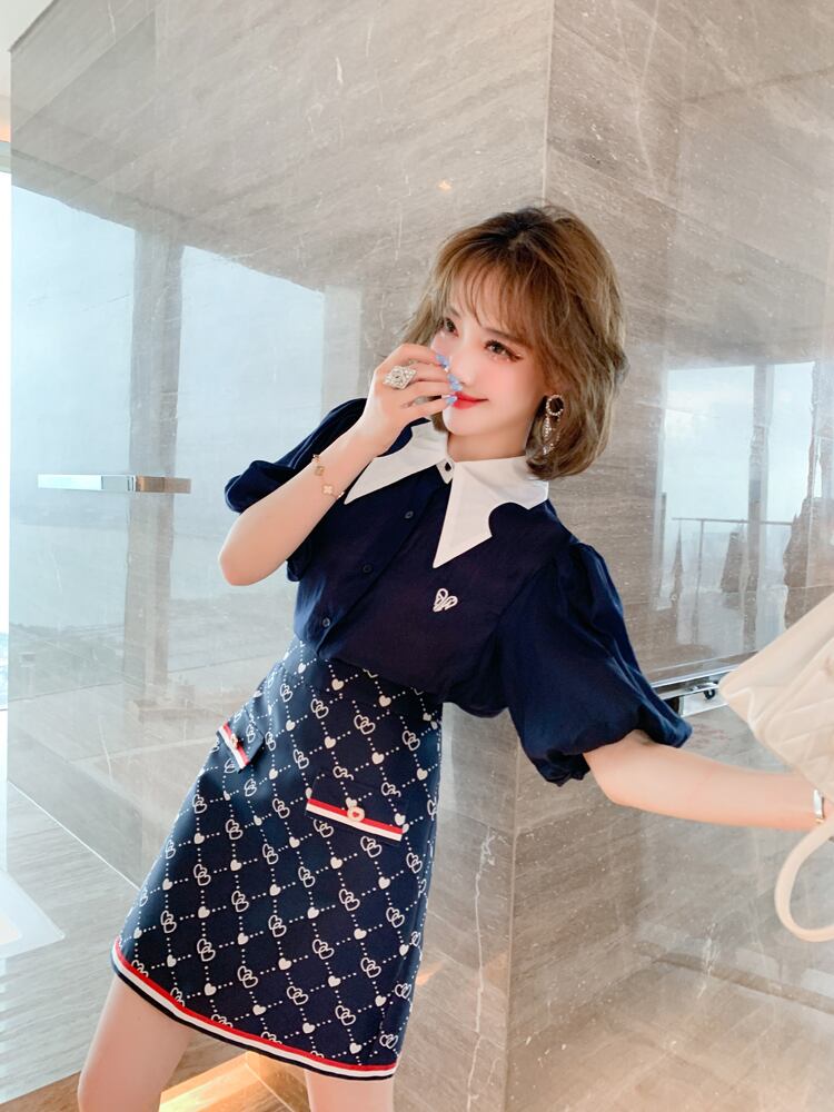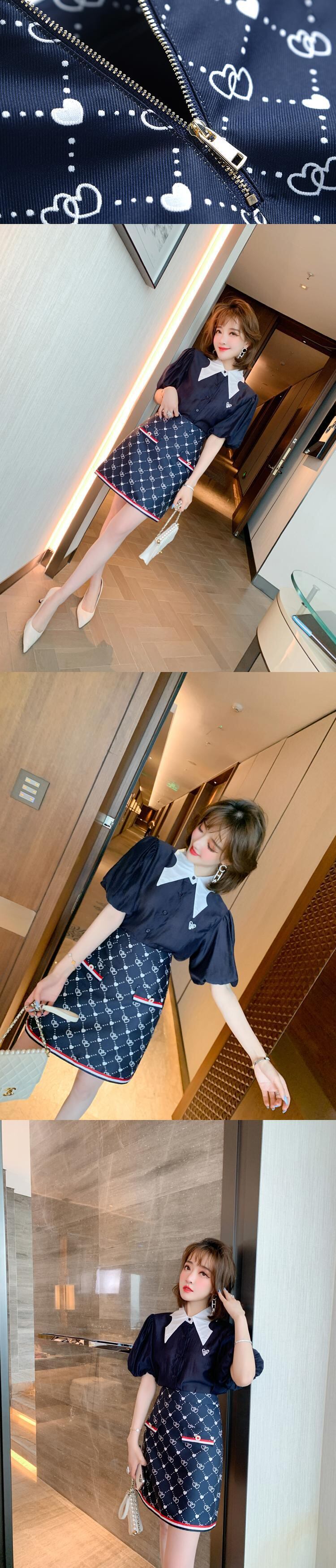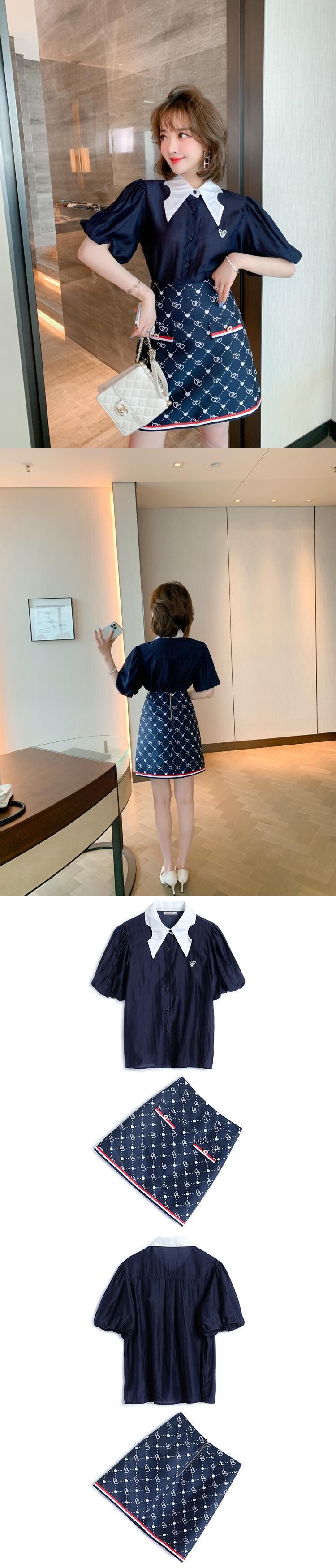 スリーブシャツ ストライプAラインスカート セット オータム レッド 刺繍 秋物 MIUCO75946674983