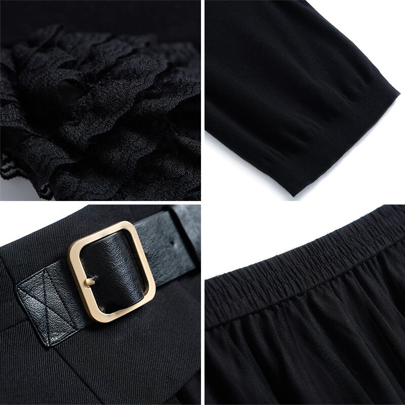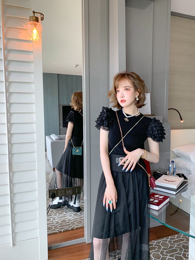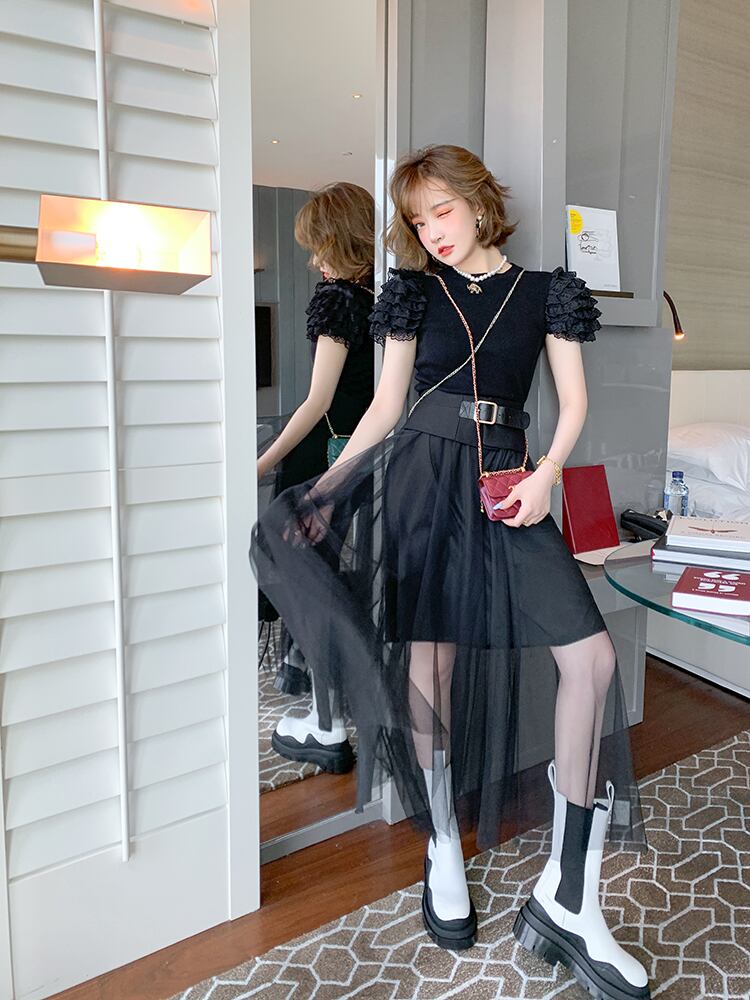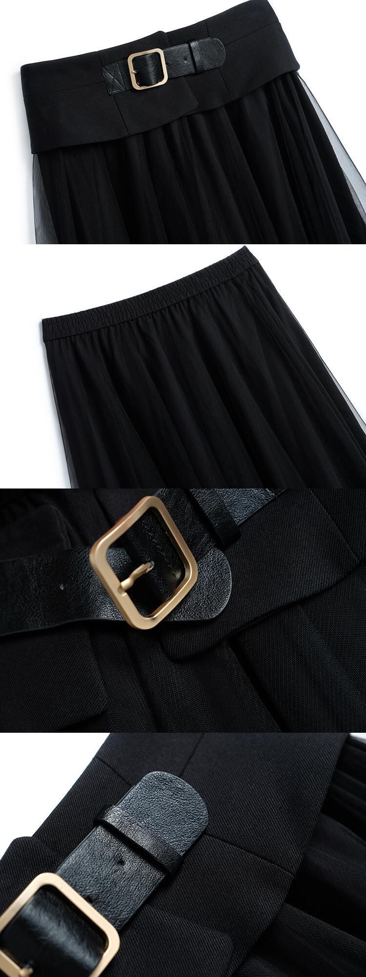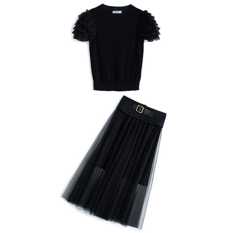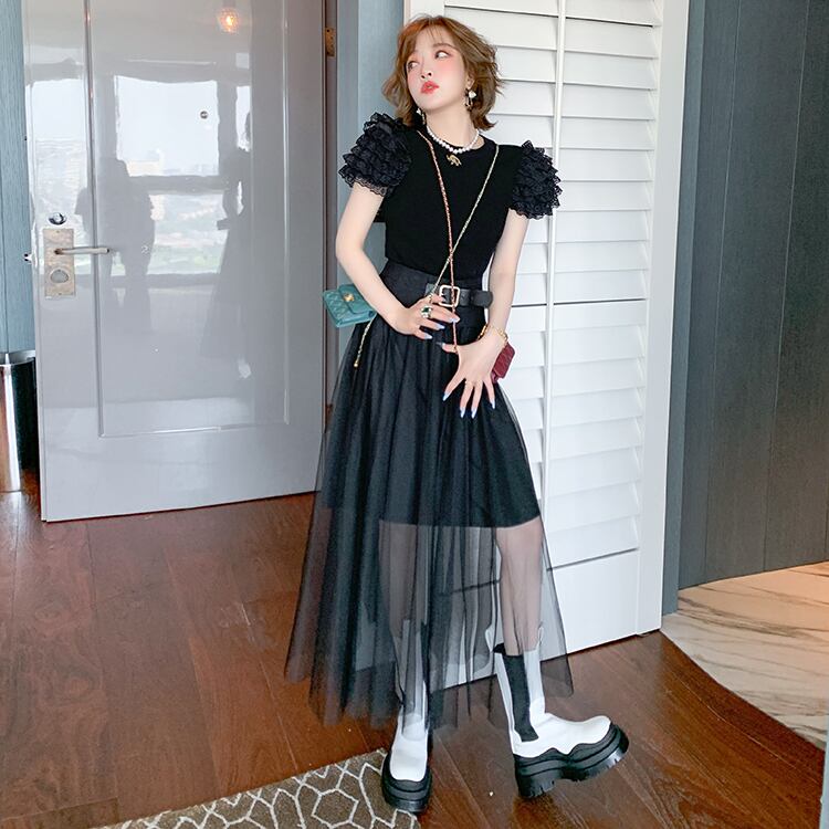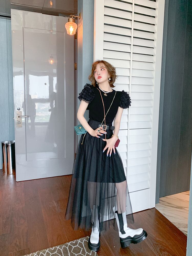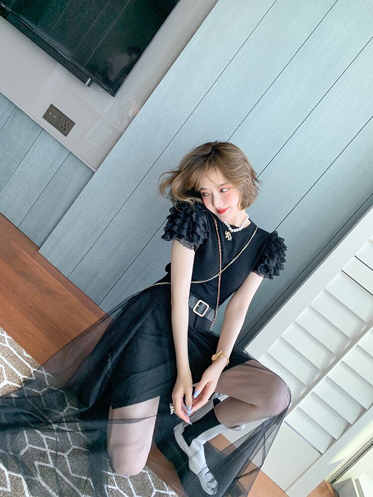 レーススリーブシャツ ハイウェストウェストメッシュスカート オータム 秋物 MIUCO76944200892