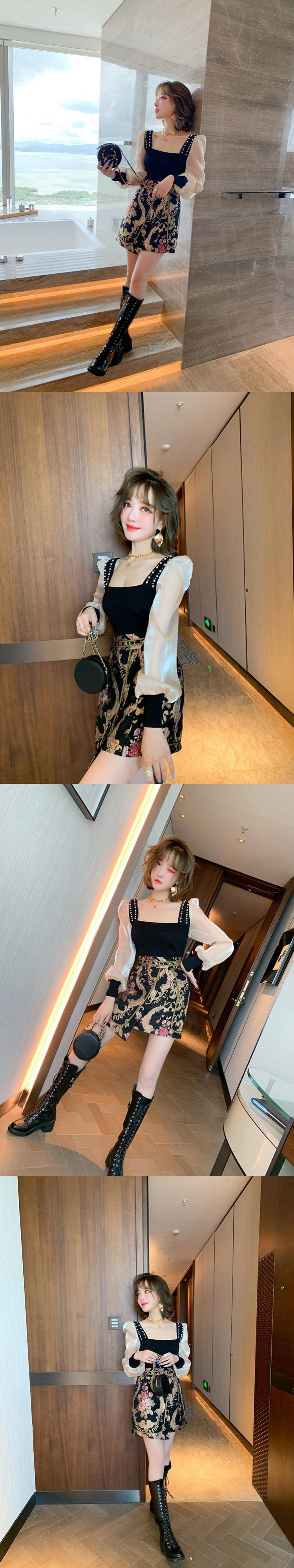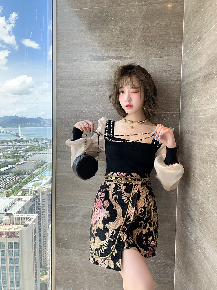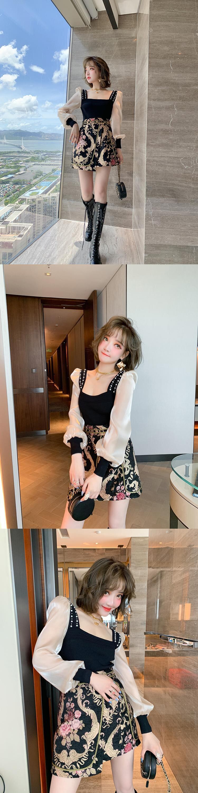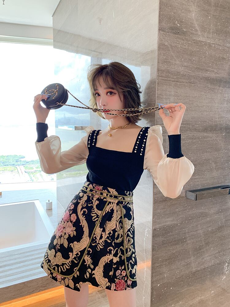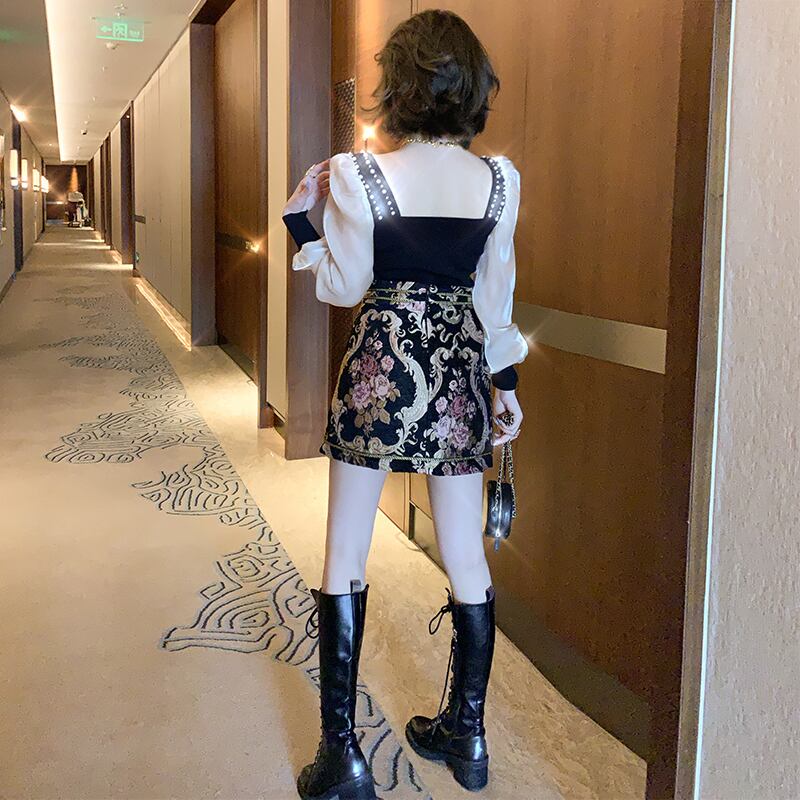 カラースリーブシャツ スタンダードジャカードスカート セット レトロ スクウェア MIUCO99909106517