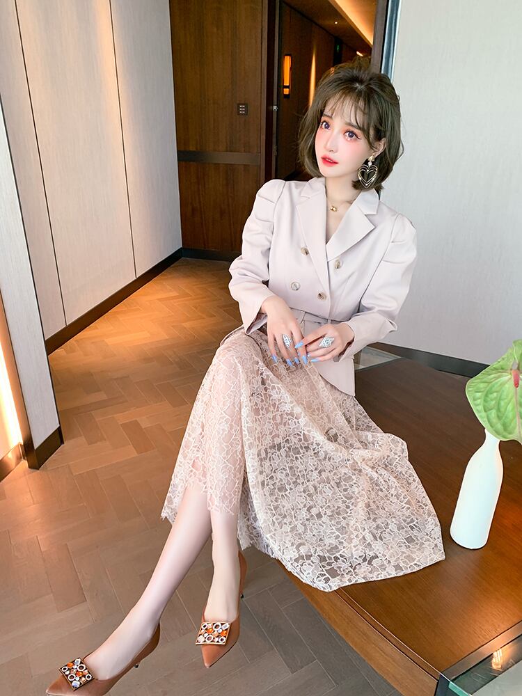 ダブルブレストショートジャケット ハイウェストレーススカート オータム 秋物 ステッチ MIUCO5908253089