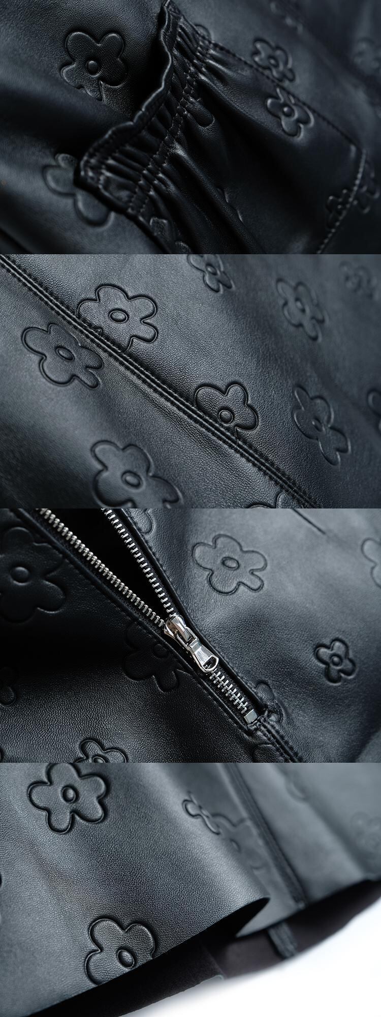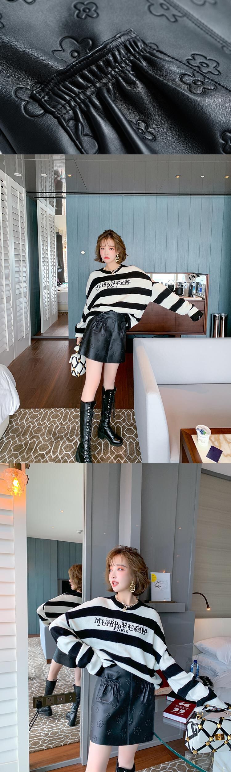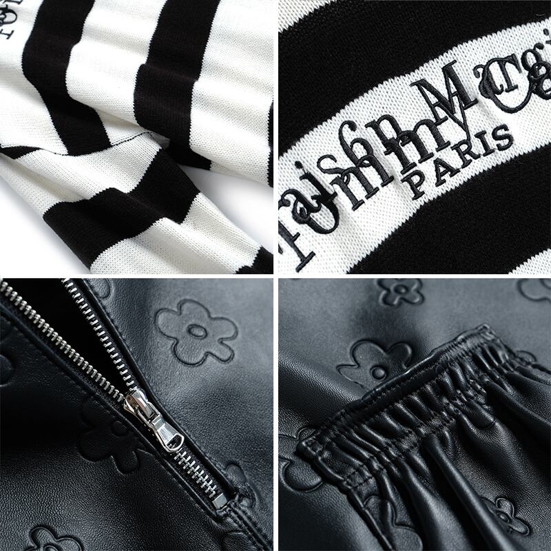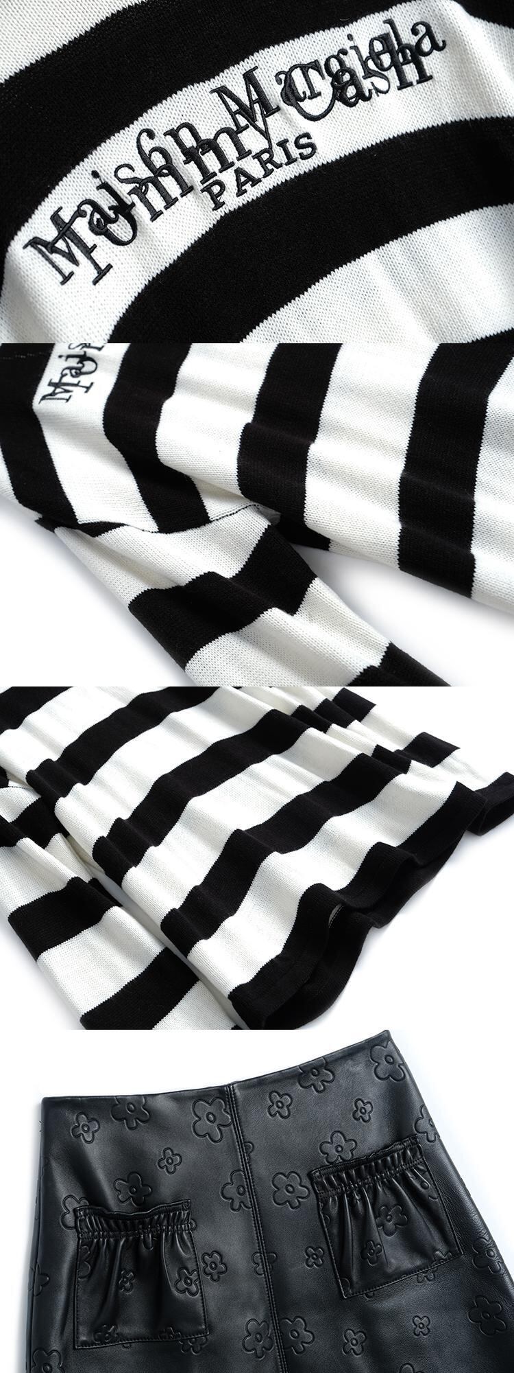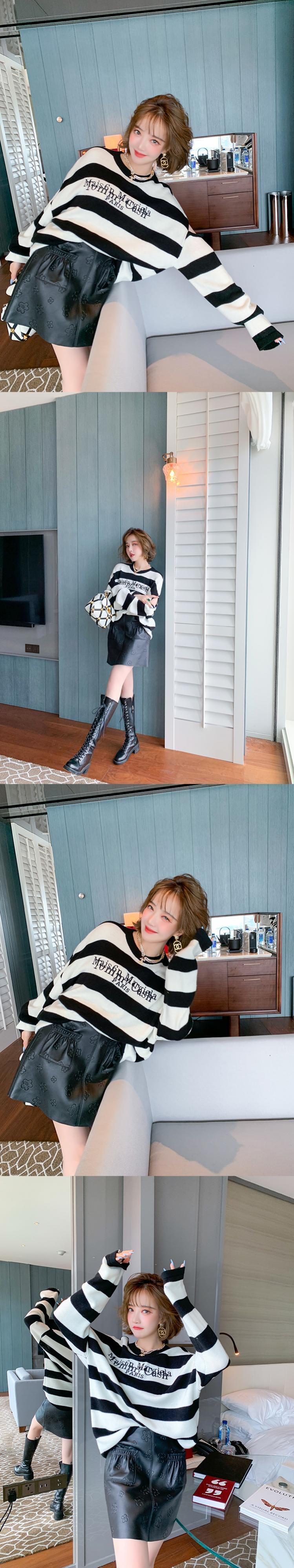 ストライプラウンドネックニットトップス ウェストレザースカート Oネック MIUCO3991301770