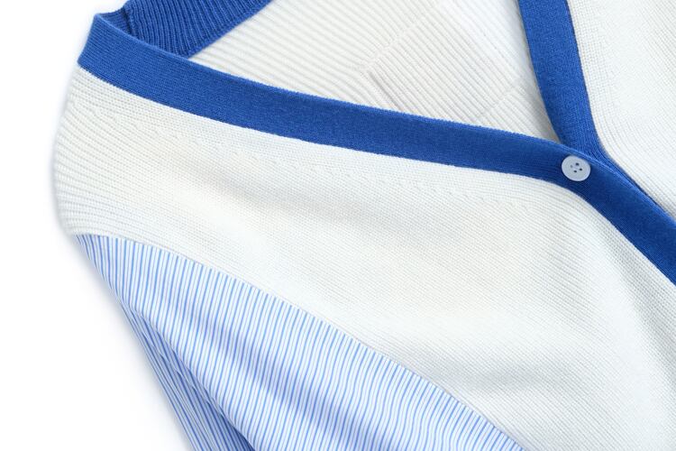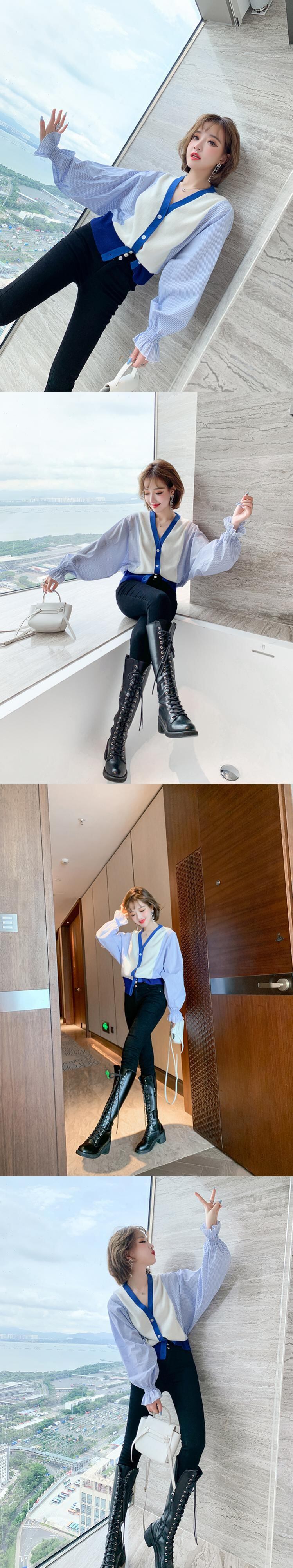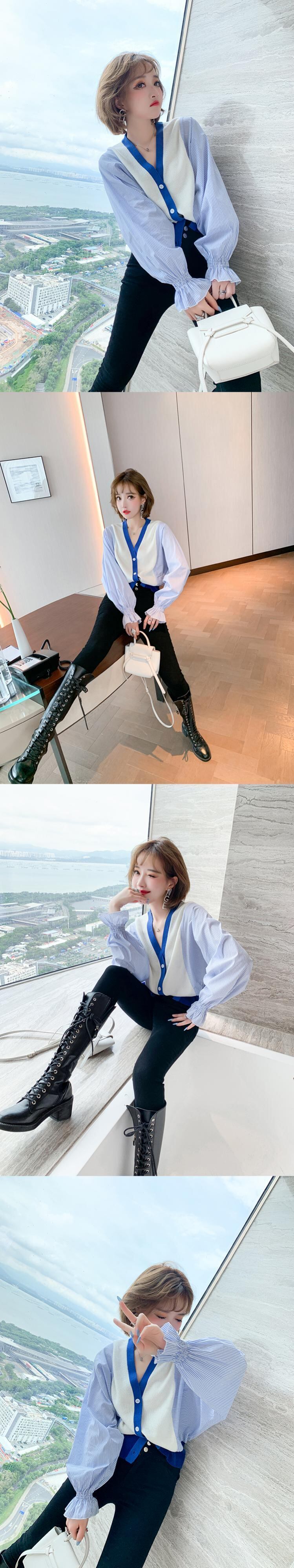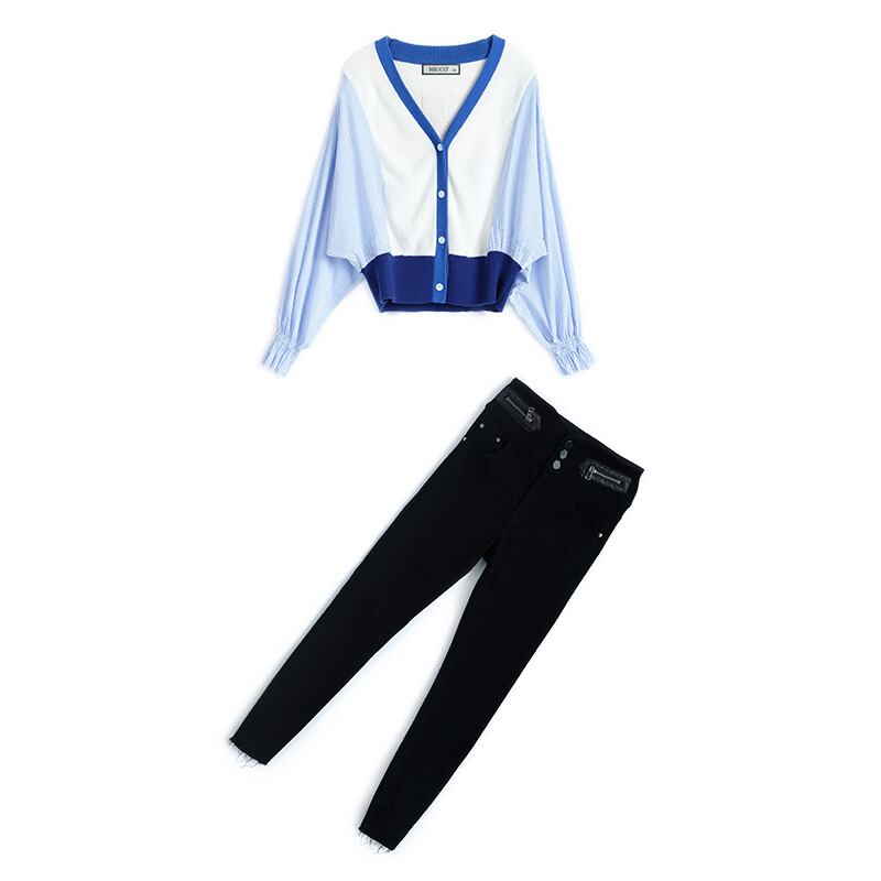 ストライプスリーブルーズニットカーディガンウェストスリムパンツ フレアスリーブ MIUCO48040581363