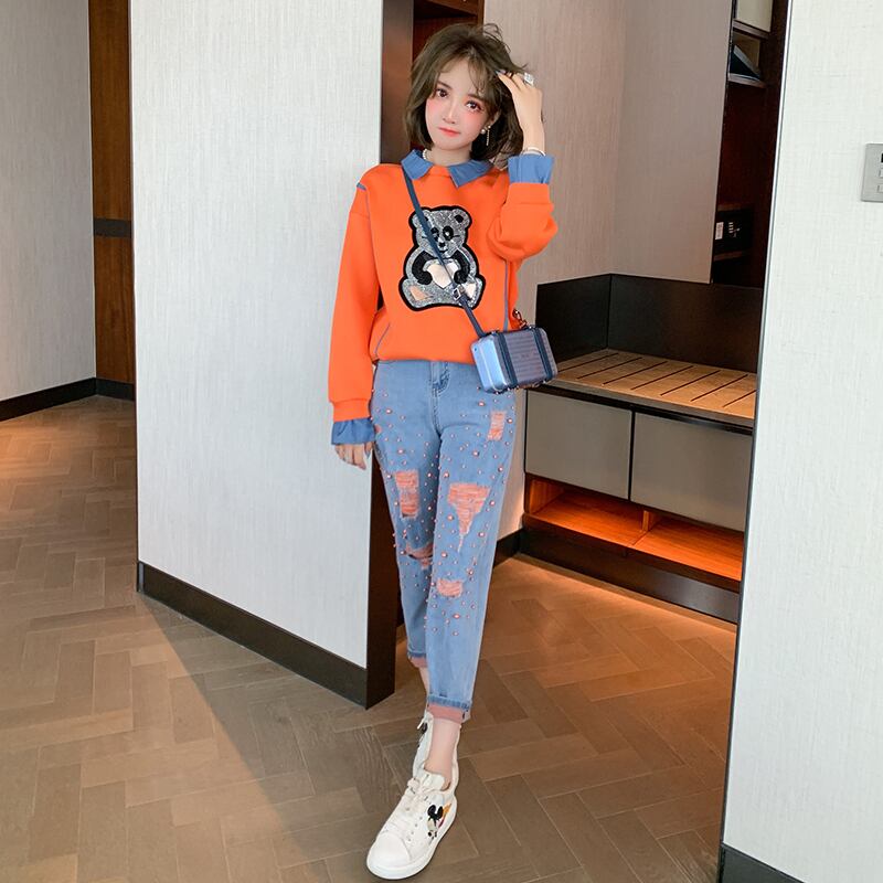ラインストーンスウェット ジーンズ セット コットン ステッチ MIUCO67644840896