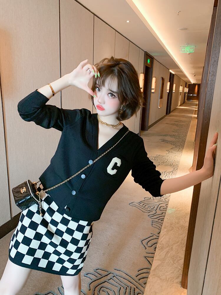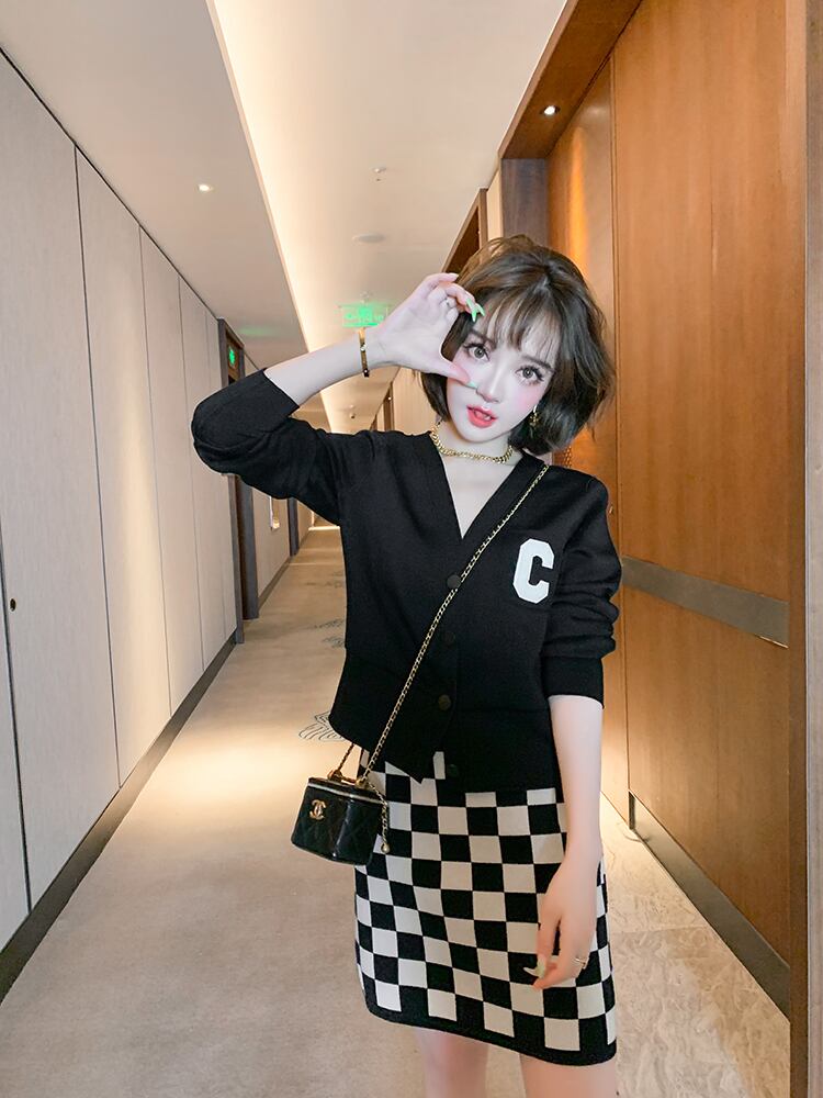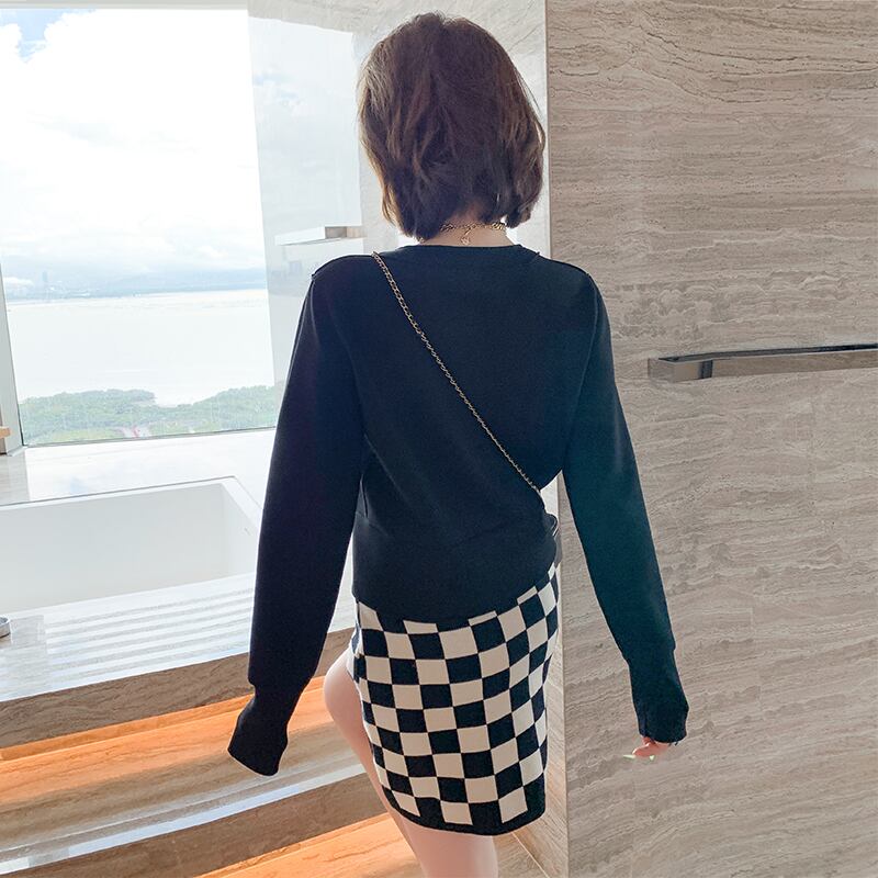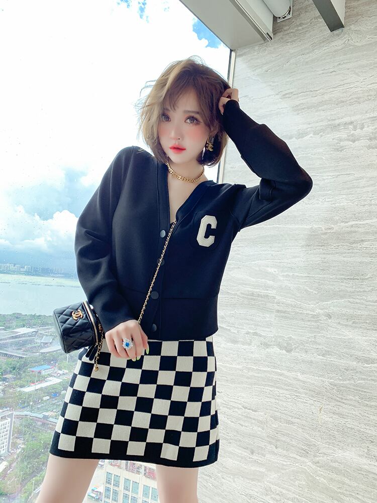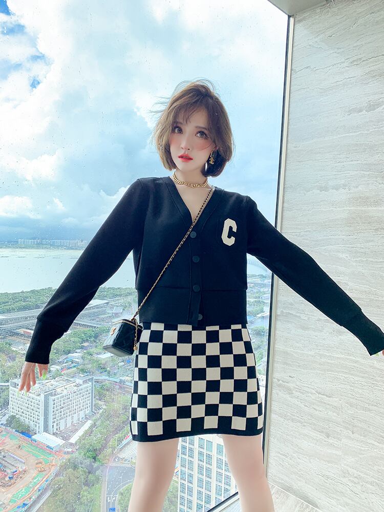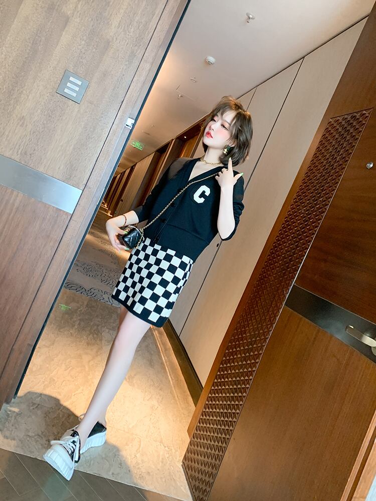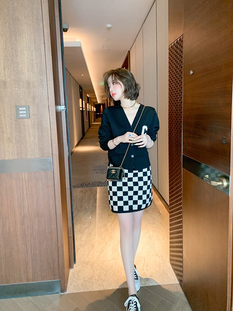 薄手カーディガンジャケット 格子柄ニットスカート セット MIUCO9445477415