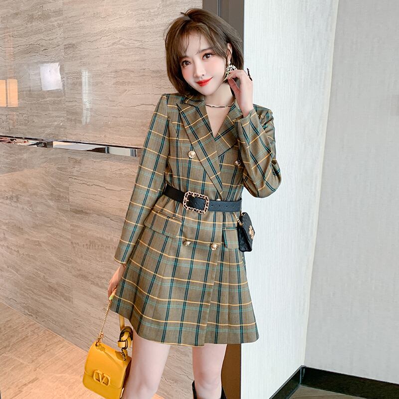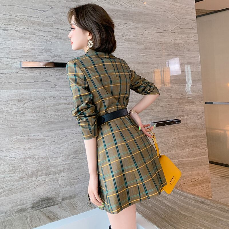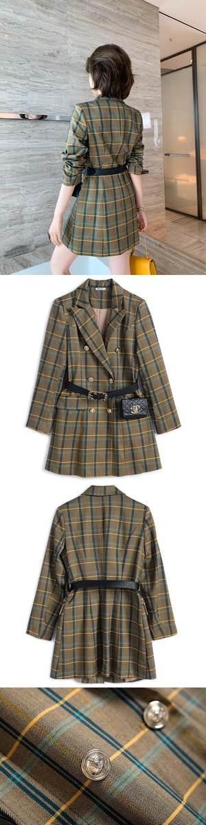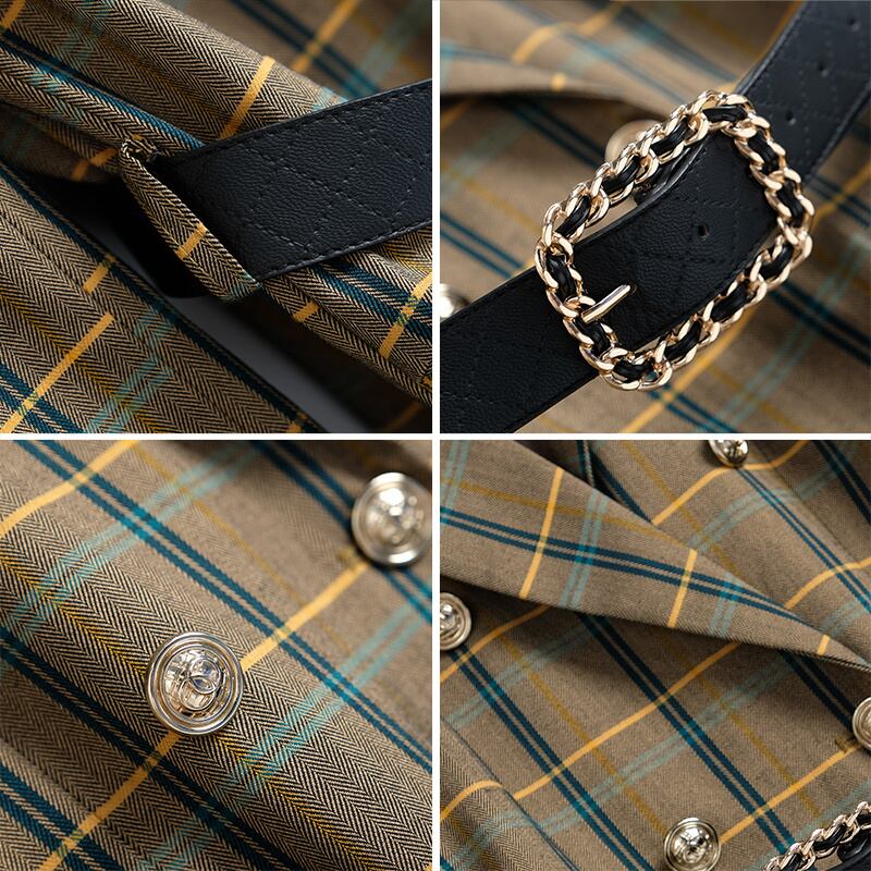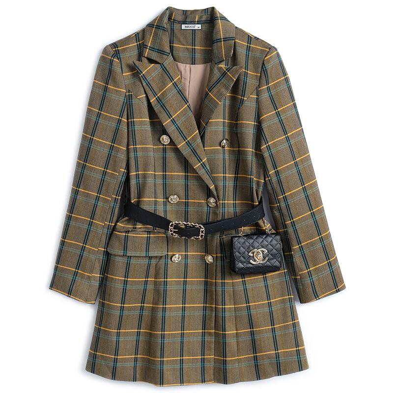 スタンダード格子柄ダブルブレストベルト ウェストブレザー ドレス オータム レトロ 秋物 ハーネス MIUCO24358550210