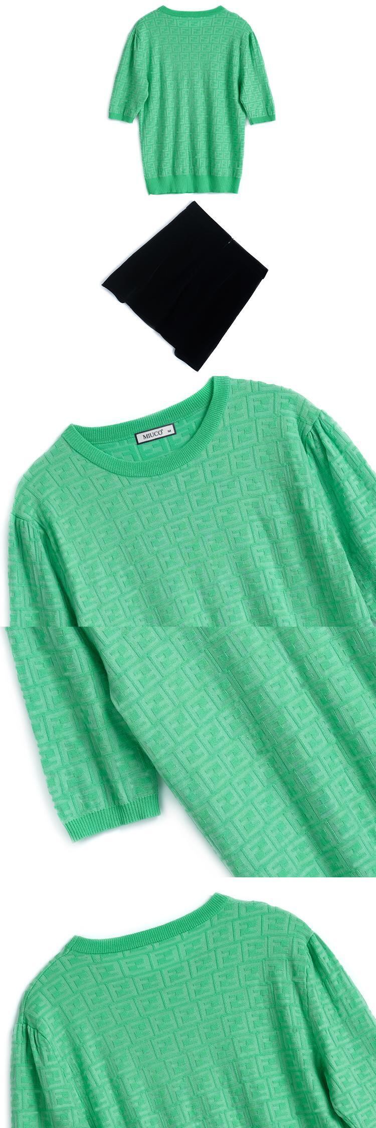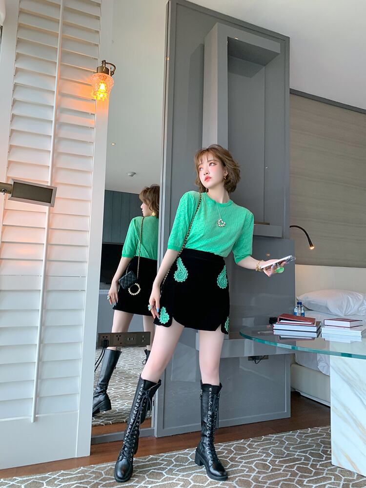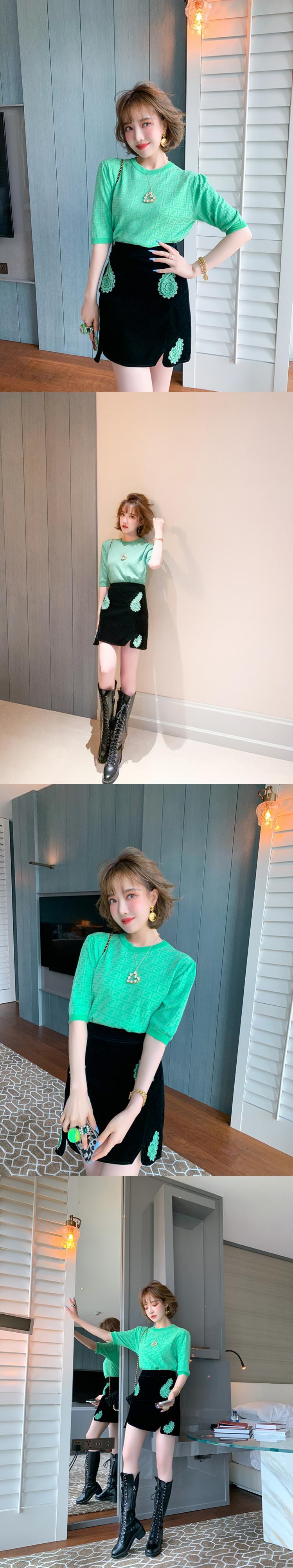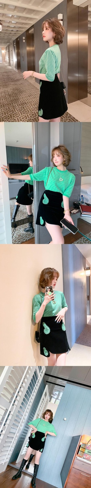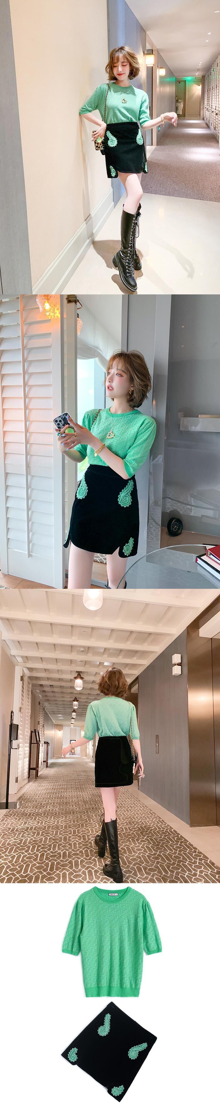 ジャカードラウンドネックニットTシャツ カラーFlowerデザイン ベルベットスカート オータム 秋物 Oネック フラワーデザイン MIUCO32012396975