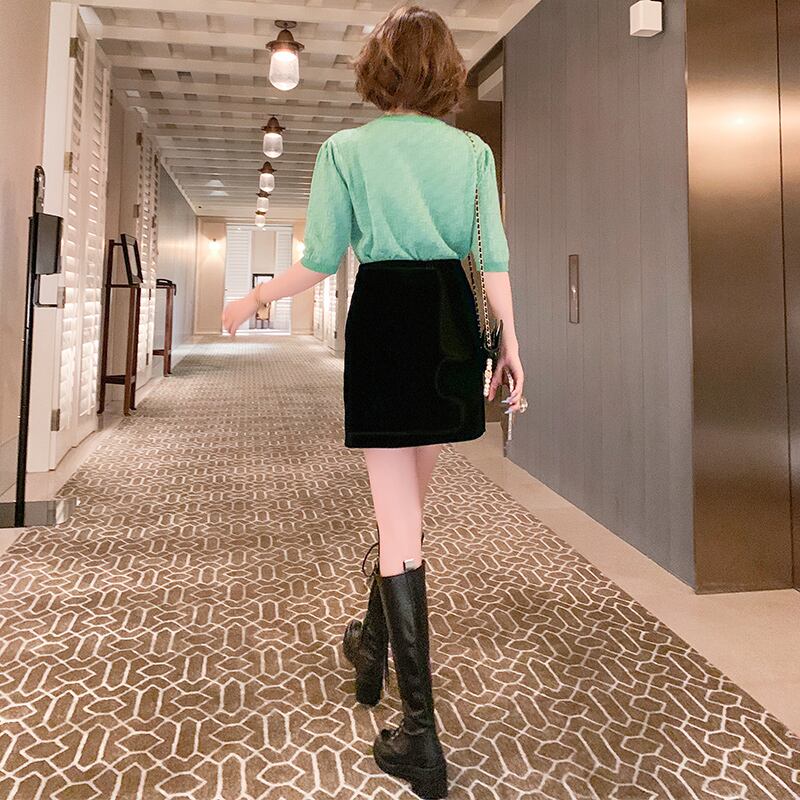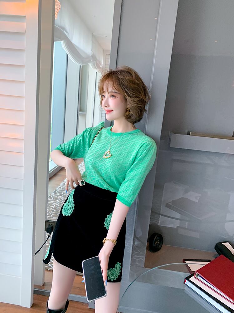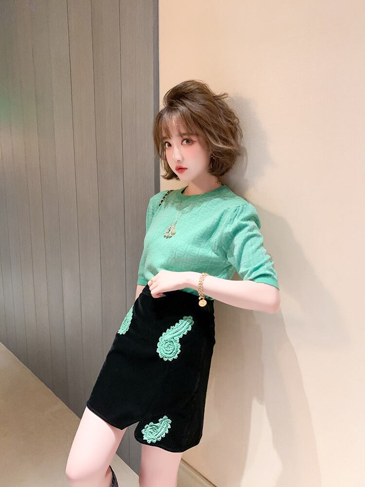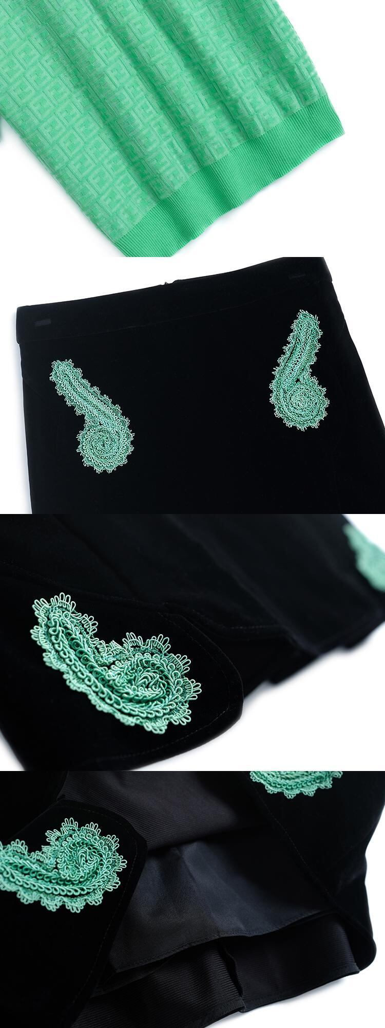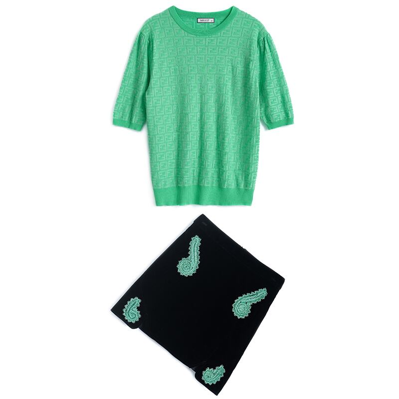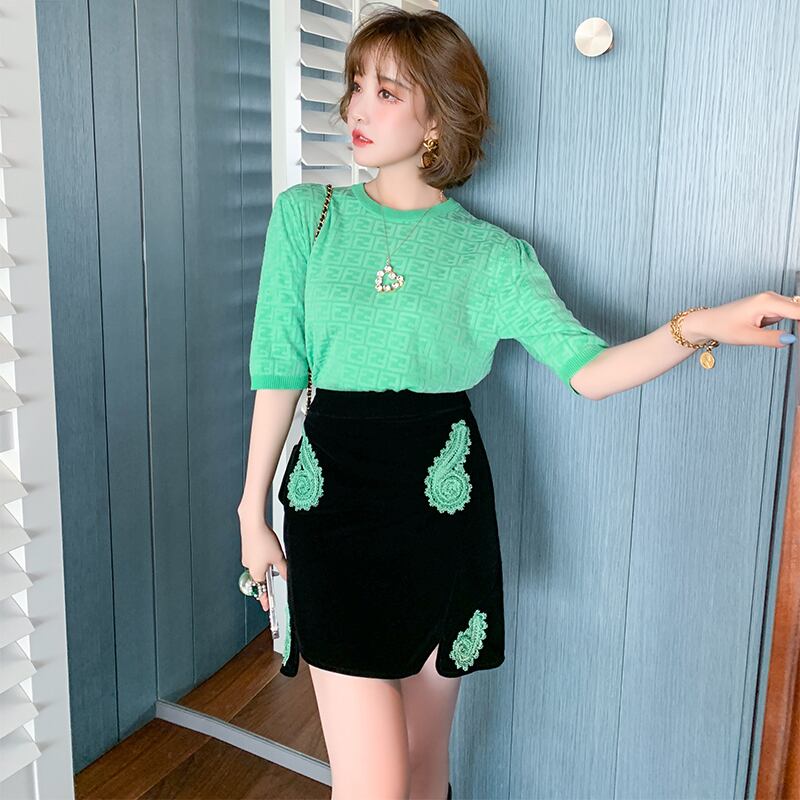 ジャカードラウンドネックニットTシャツ カラーFlowerデザイン ベルベットスカート オータム 秋物 Oネック フラワーデザイン MIUCO32012396975
